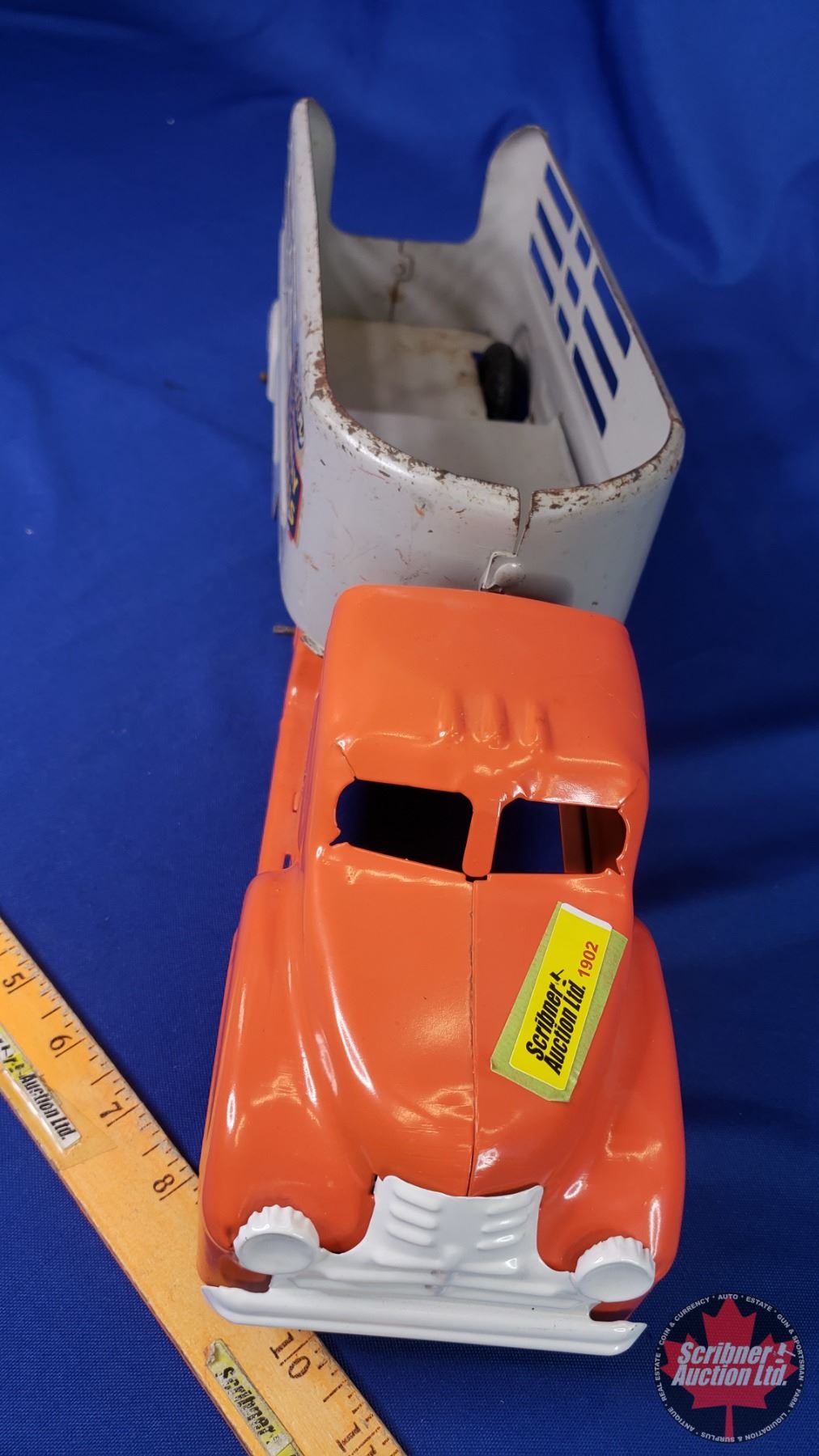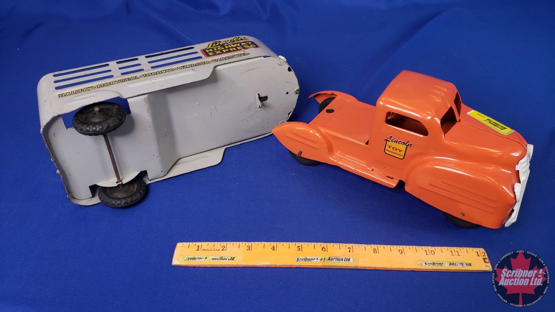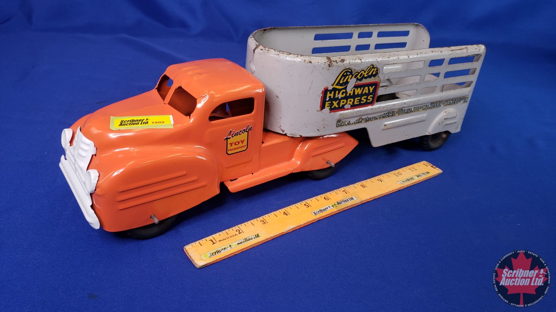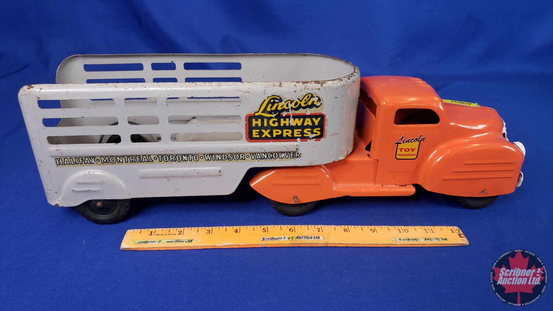 Lincoln Metal Truck & Hauler Trailer "Lincoln Toy Transport" "Lincoln Highway Express" (Truck may have been repainted) (5-1/2"H x 4-1/2"W x 18-1/2"L) (SEE PICS!)