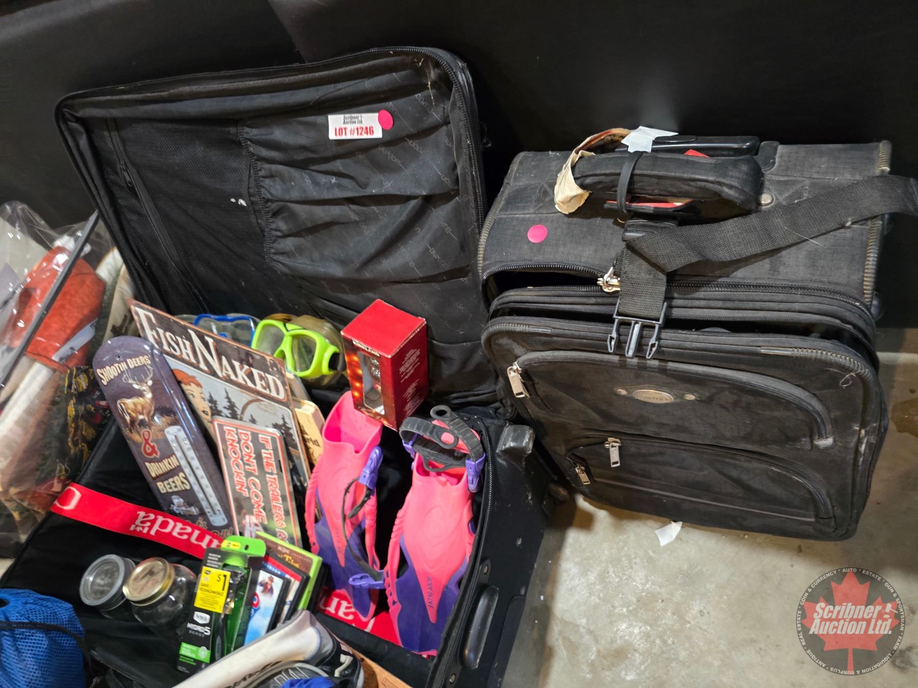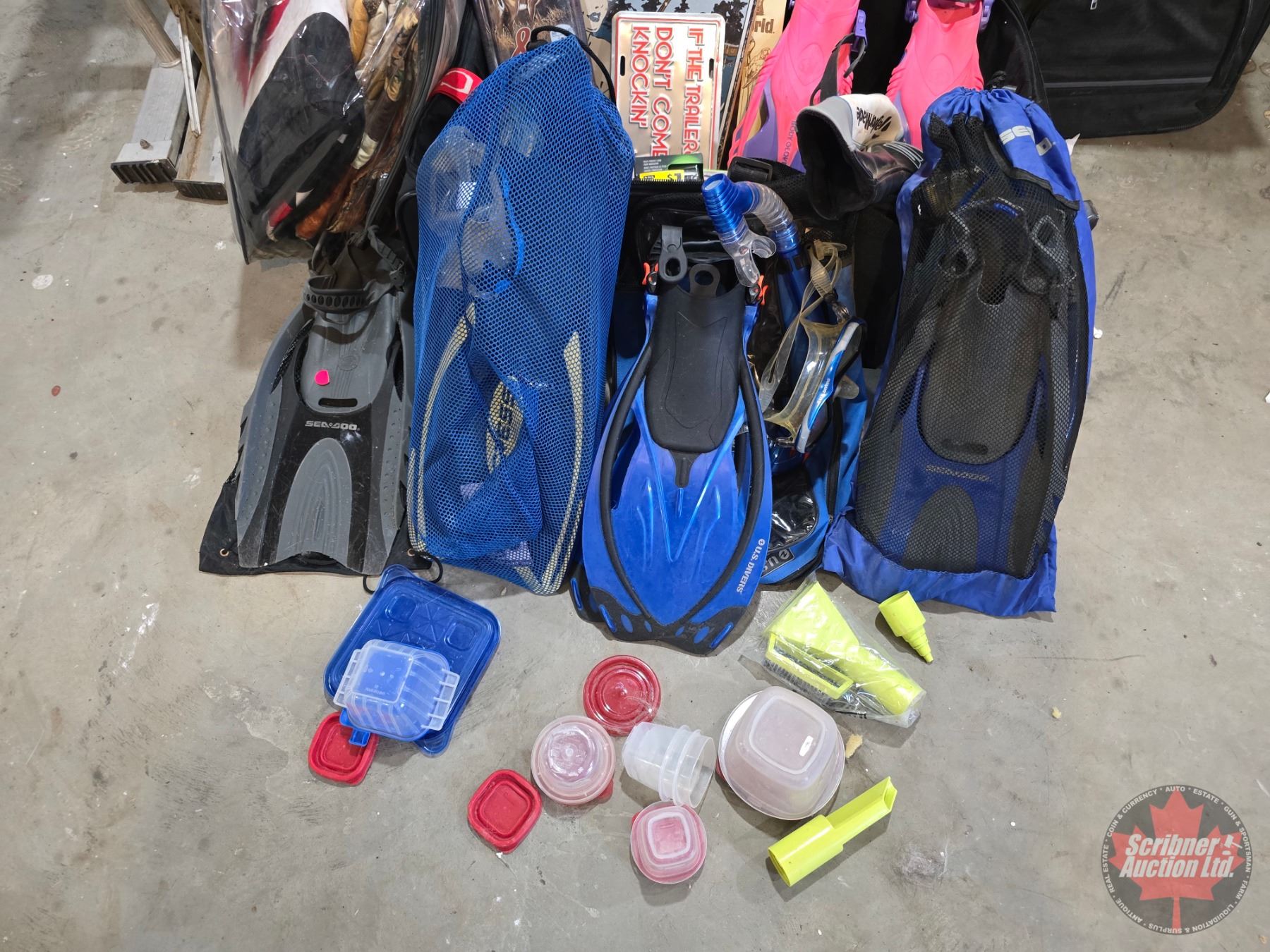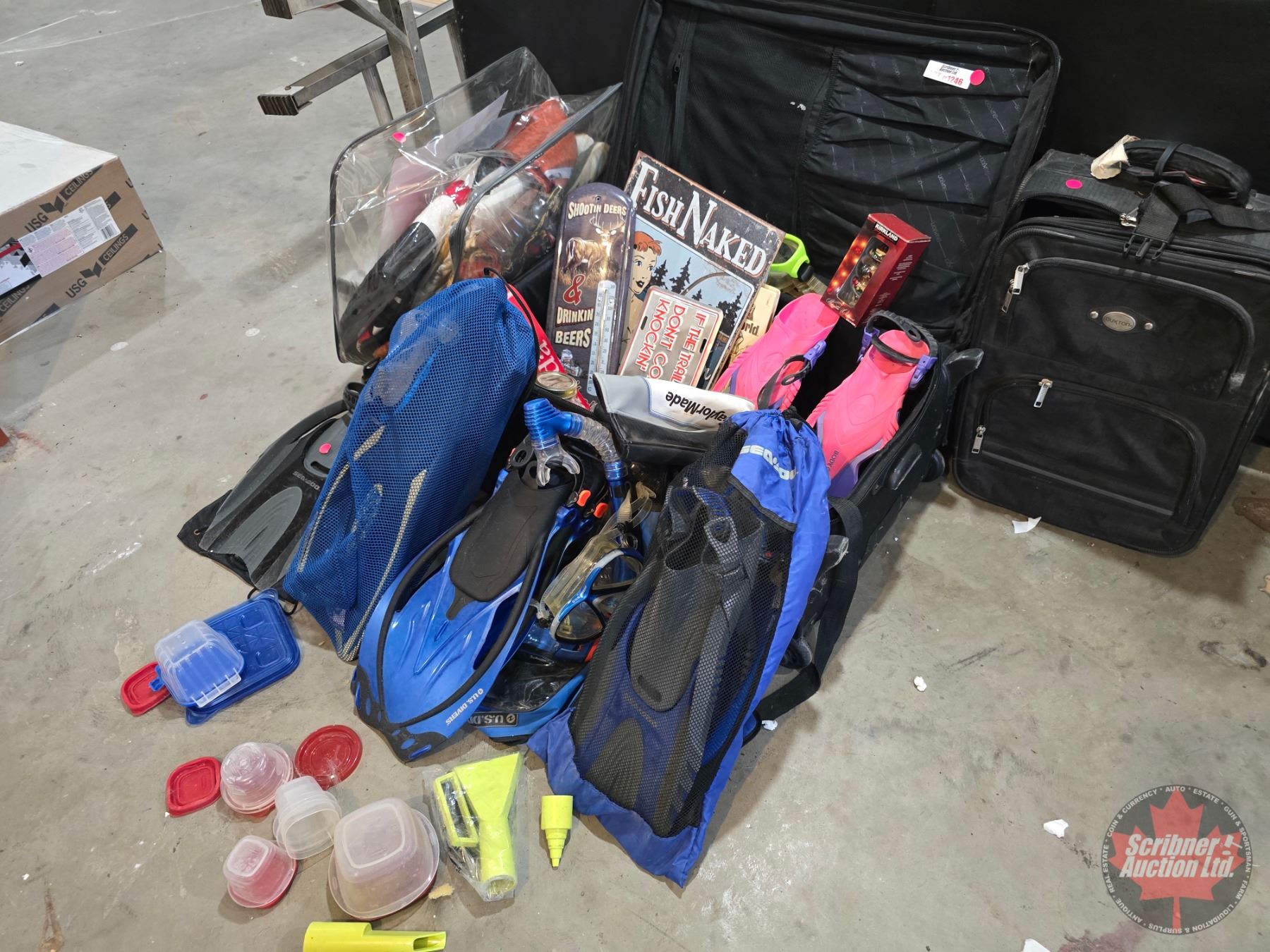 Luggage w/Flippers, Snorkel, Goggles, Novelty Tin Sign, DVDs, Blankets, etc
