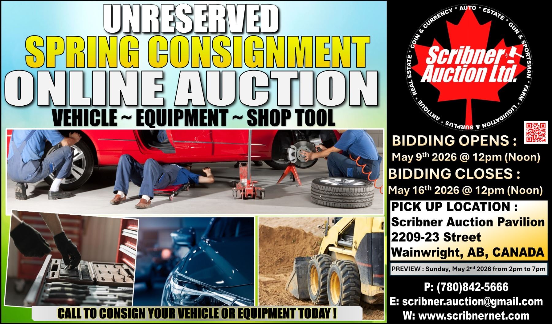 CONSIGN NOW ! CALL 780-842-5666 OR Email scribner.auction@gmail.com