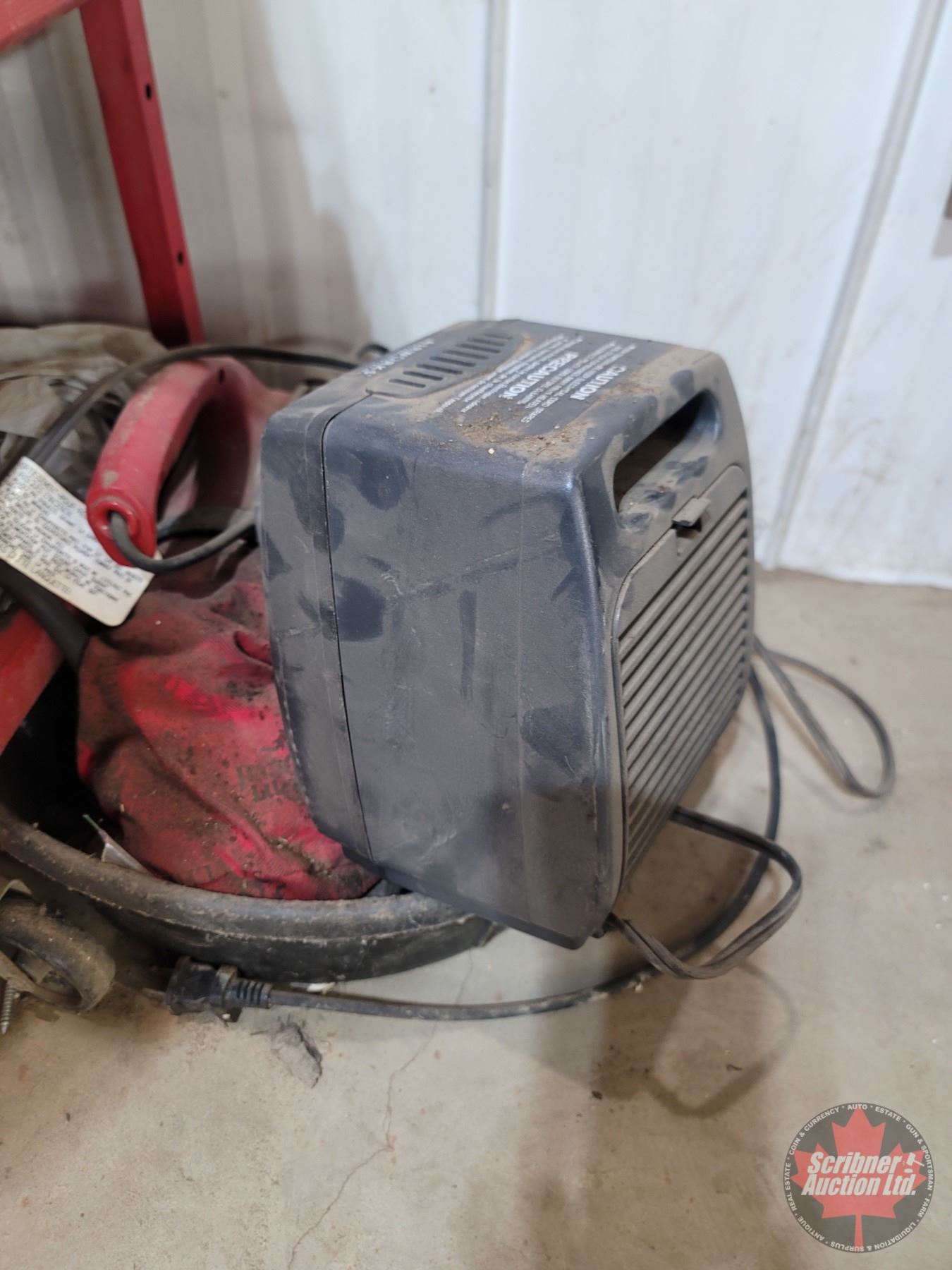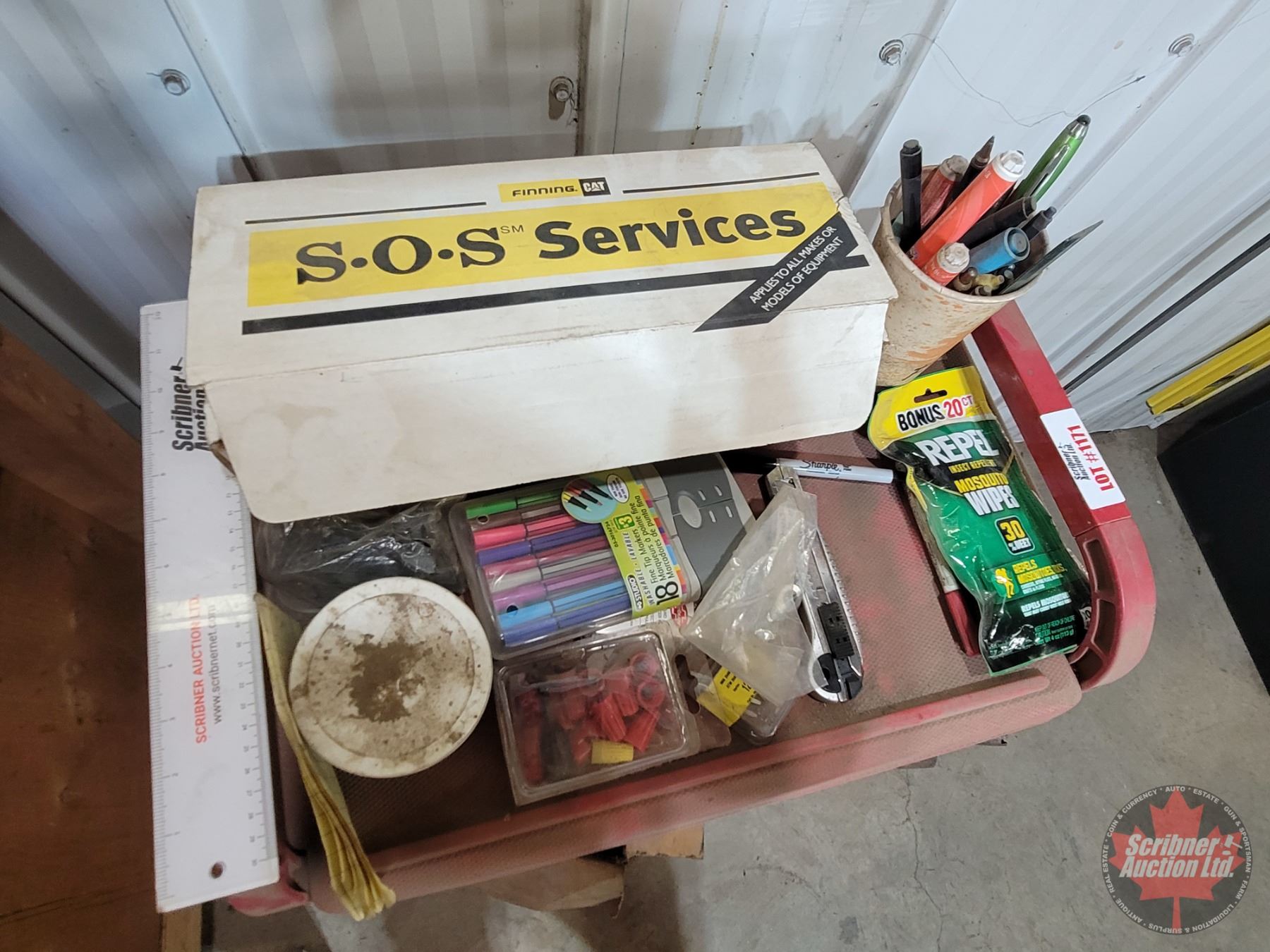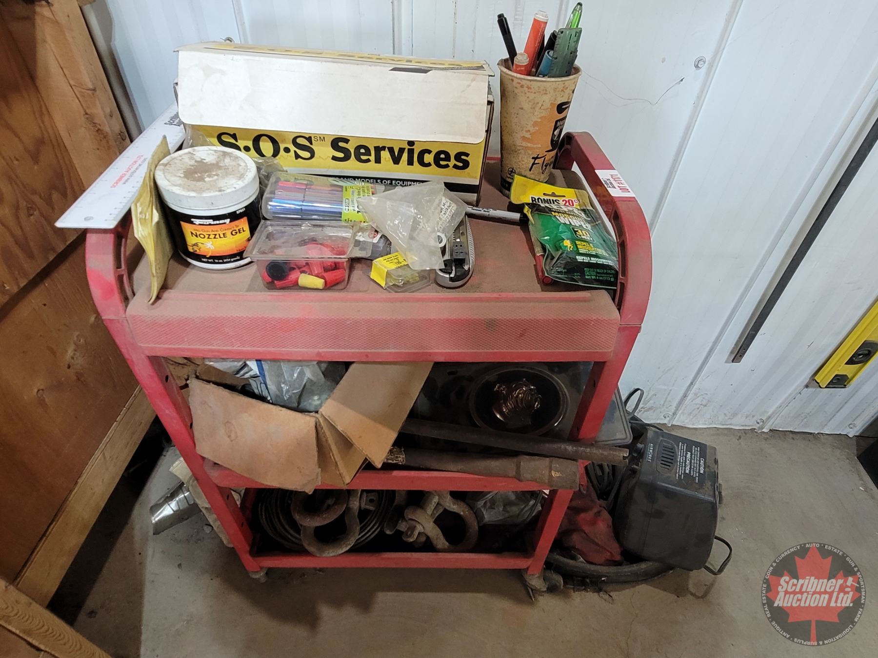 (Clevises, Cable, Screws, Truck Wrench, Mig Gun Nozzle Gel, Pens, Knife, Heater & Car Vac, etc) (Note: Cart missing 1 Castor)