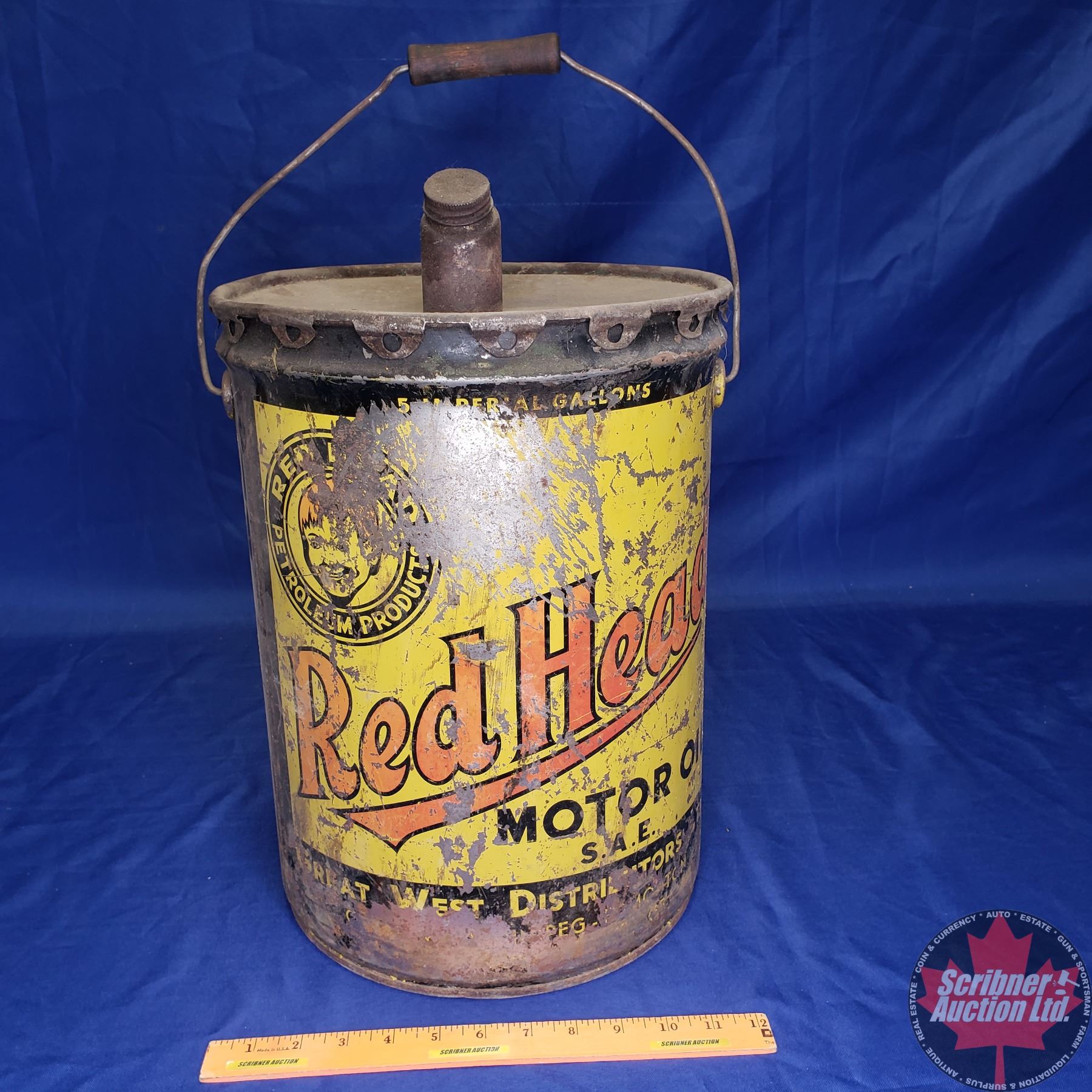 Metal 5 Gal Oil Pail w/Spout "Red Head Motor Oil" (16"H x 12" Dia)