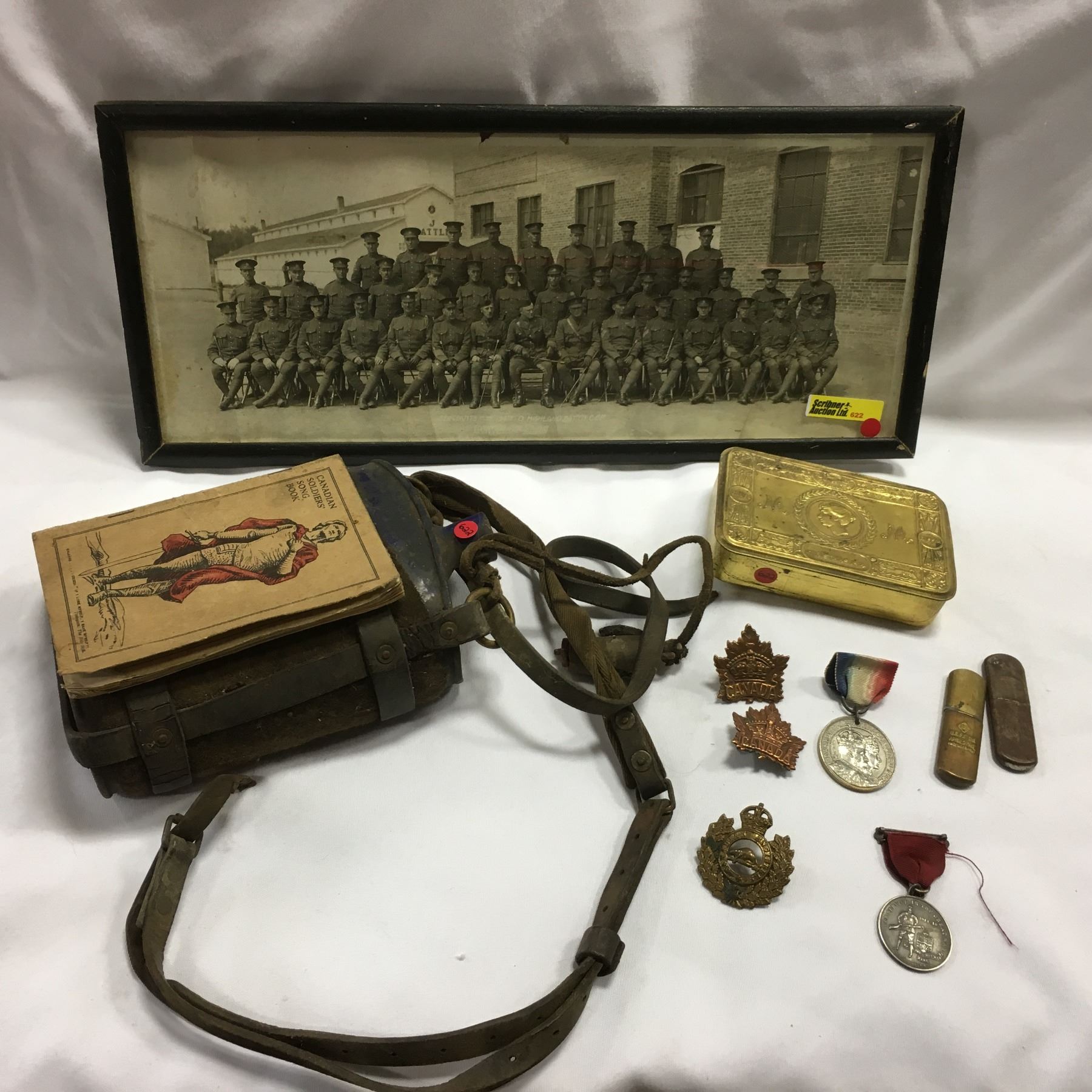 Militaria : Princess Mary Christmas Box, WWI Cap Badges (2), Photo Sergeants of 194 Batt. Edmonton Jun 5th 1916, Canadian Engineers Cap Badge, For Service Great War Maple Ridge B.C., King Edward Crowned 1902 City of Gloucester, WWI Canteen Leather Straps (1916), Canadian Soldiers Song Book (1916), Trench Lighters (2)