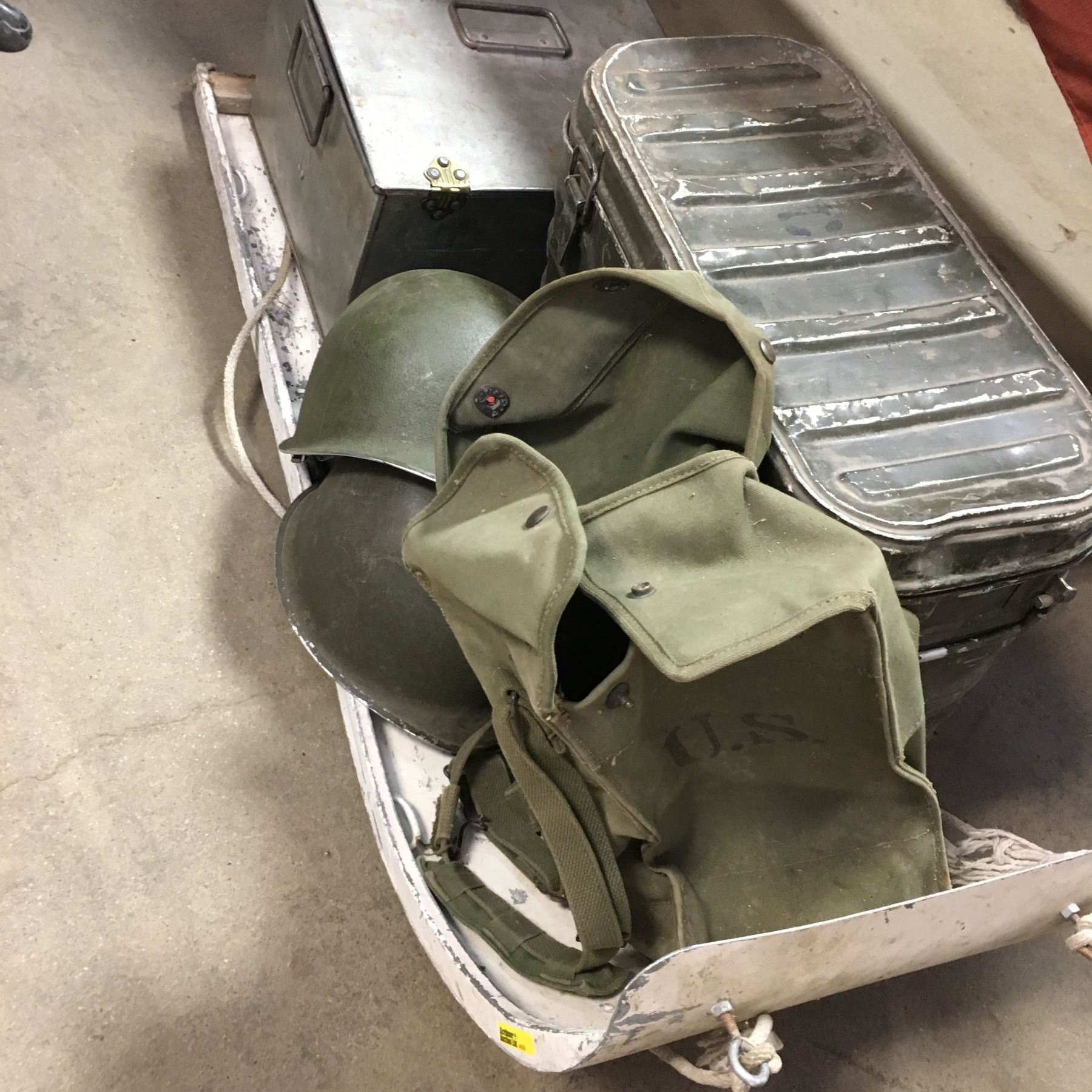Militaria: Snow Sled w/Helmets, Back Pack & Cooler