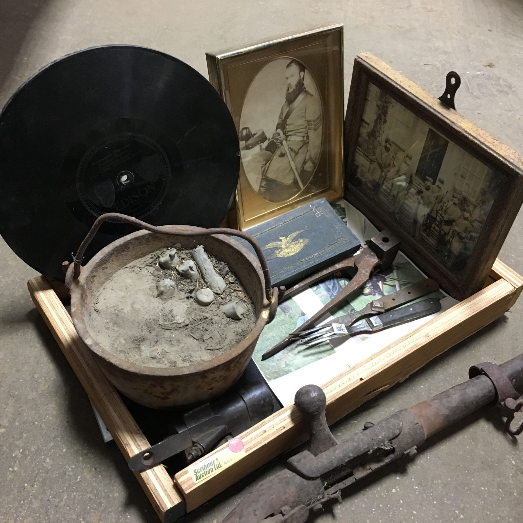 Militaria: Wooden Tray Lot - Civil War Era (Pot of Lead, Bent Rifle Barrel, Bullet Mould, Breech from Trap Door Rifle, Small Pretestation Case, Framed Photographs, Small Buttons, Forks, etc)