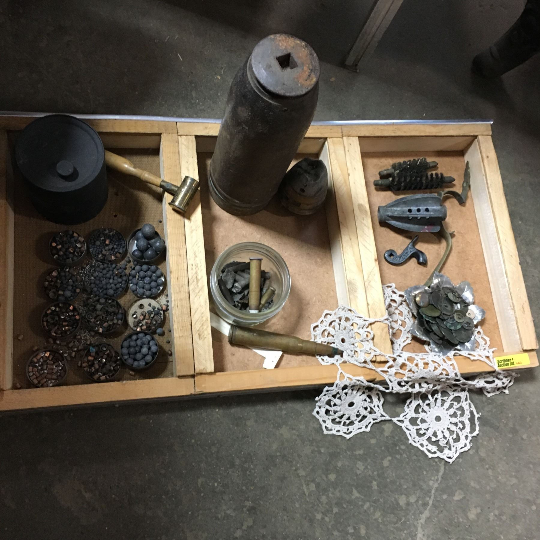 Militaria: Wooden Tray Loy - Artillery Rounds, Casing, Powder Can, Powder Measure, etc