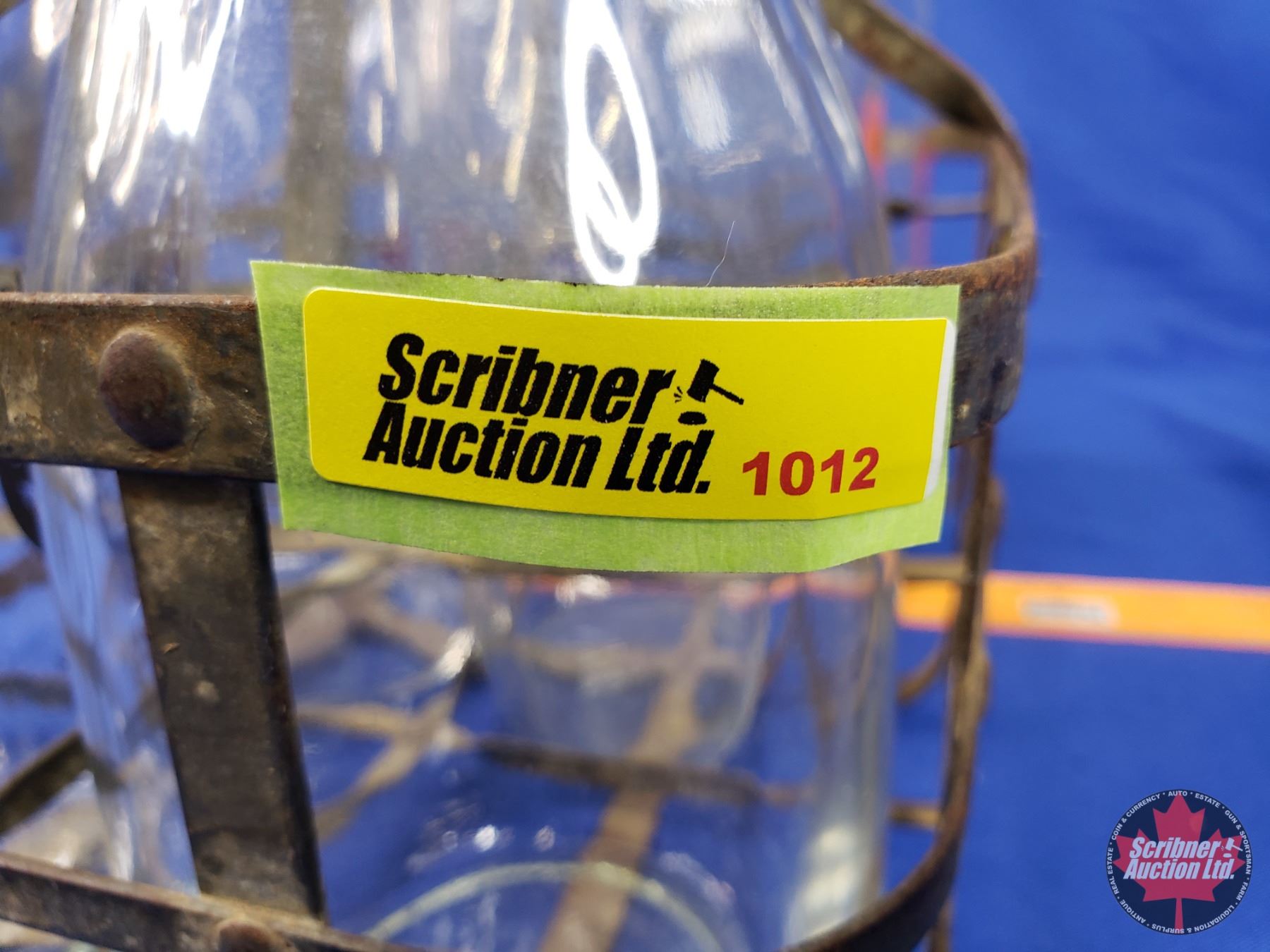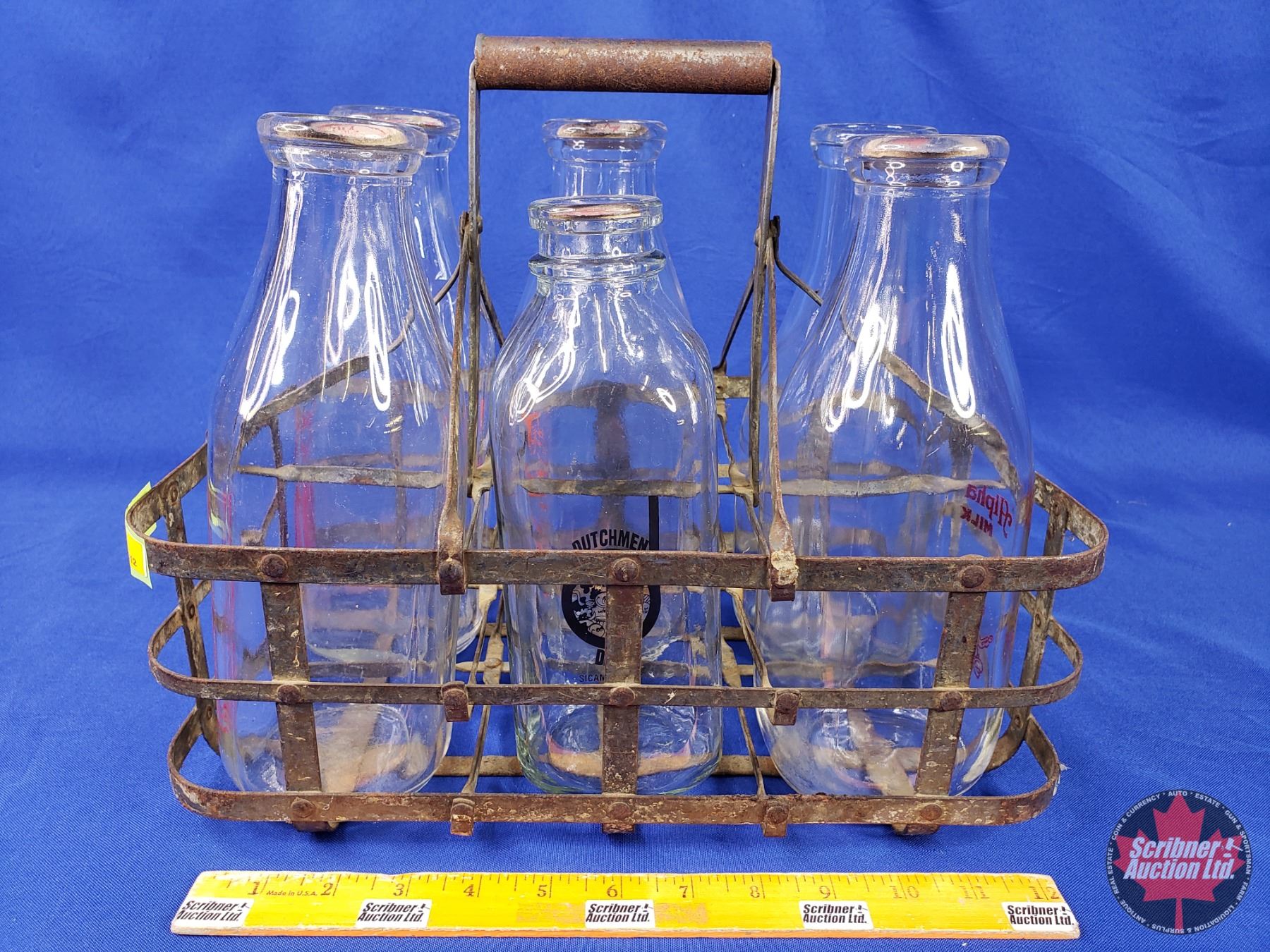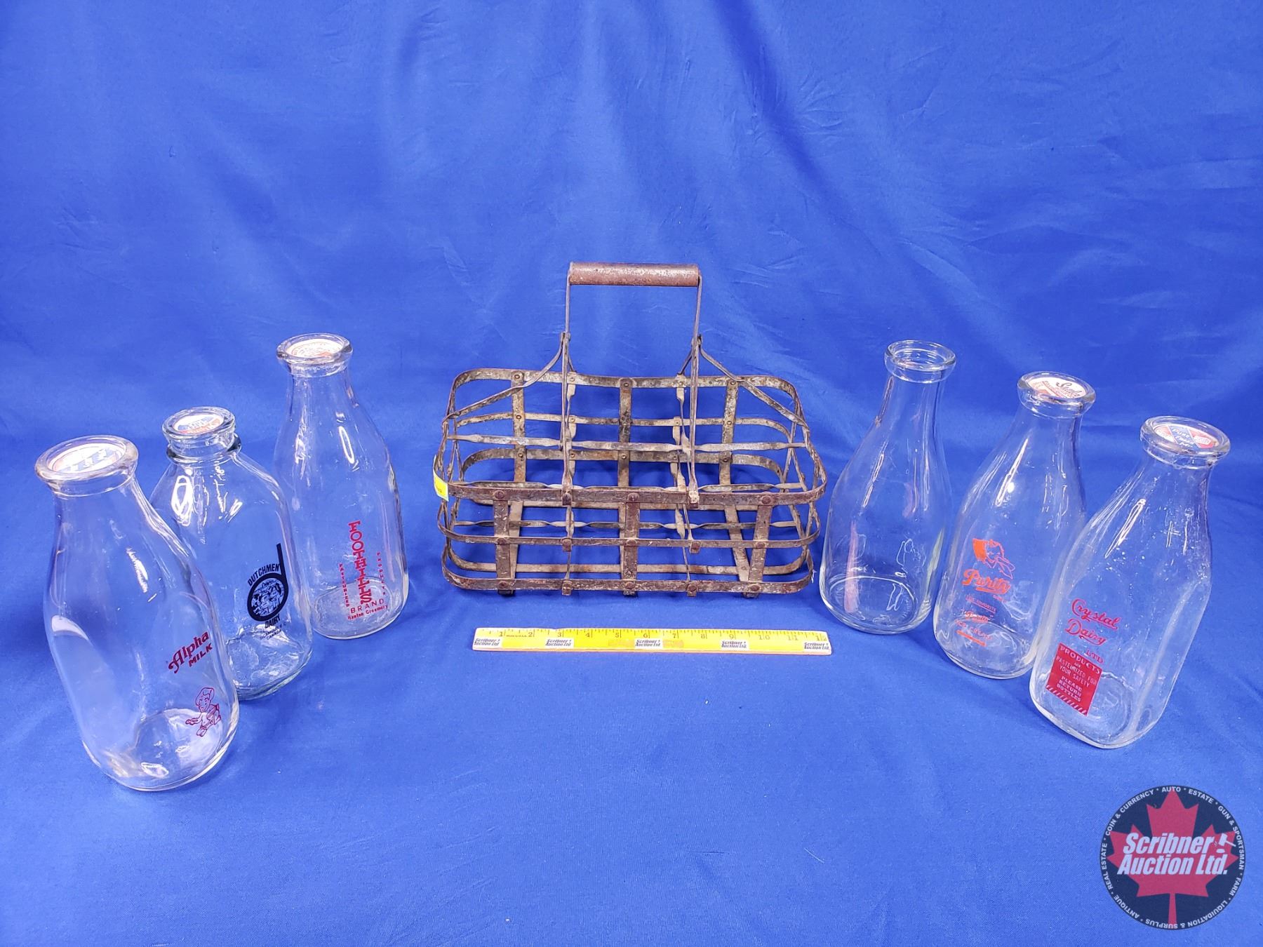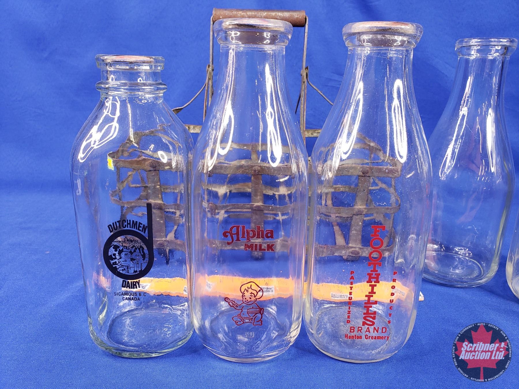 Milk Bottles with Metal Carrier - Variety Logos on Bottles Incl. Dutchmen; ALPHA; Foothills; Crystal Dairy; Purity (Carrier 12"H x 13-1/2"W x 9"D) (SEE PICS!)