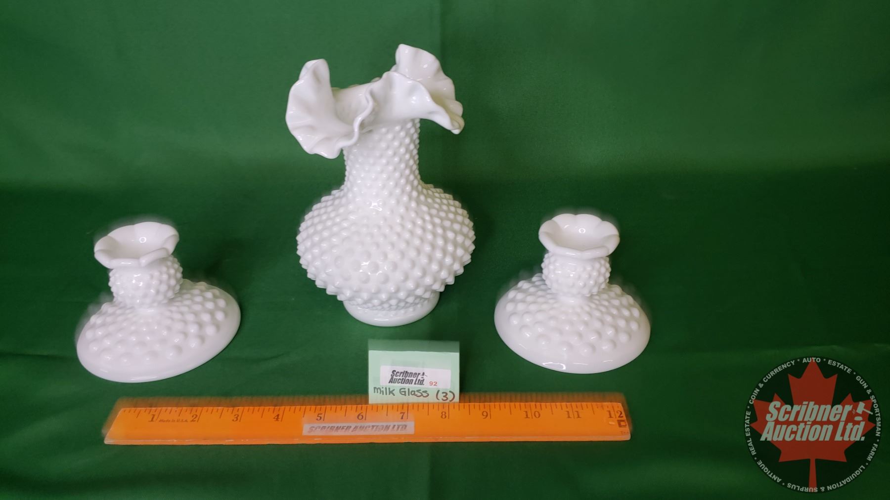 Milk Glass - Hobnail Trio: Candle Holders (2) & Vase (See Pics!)
