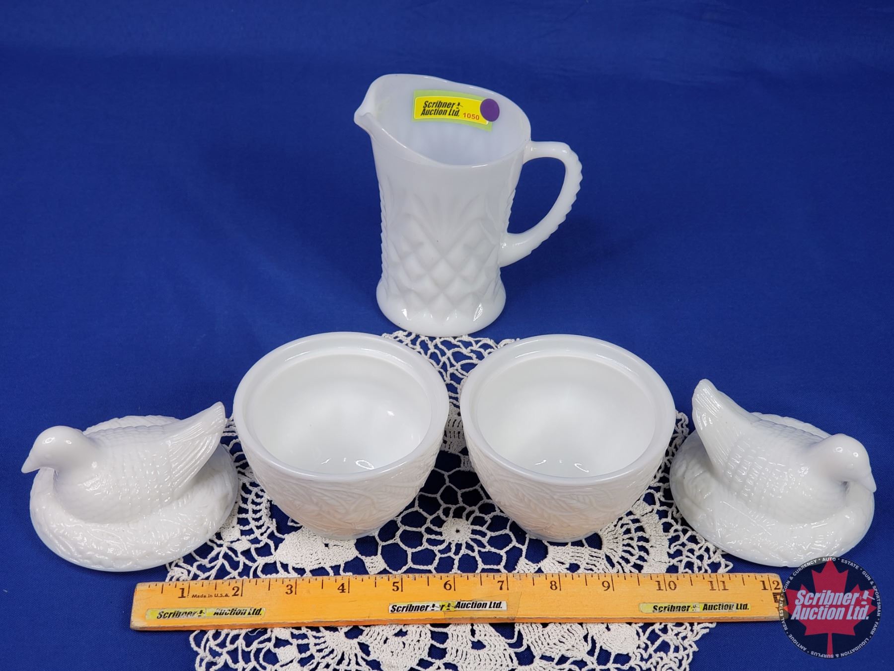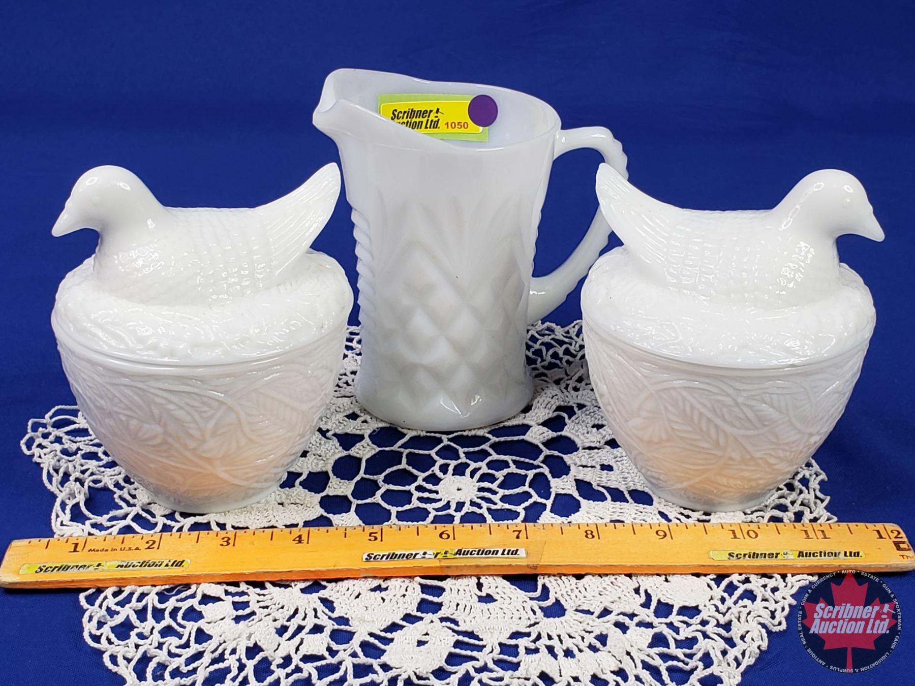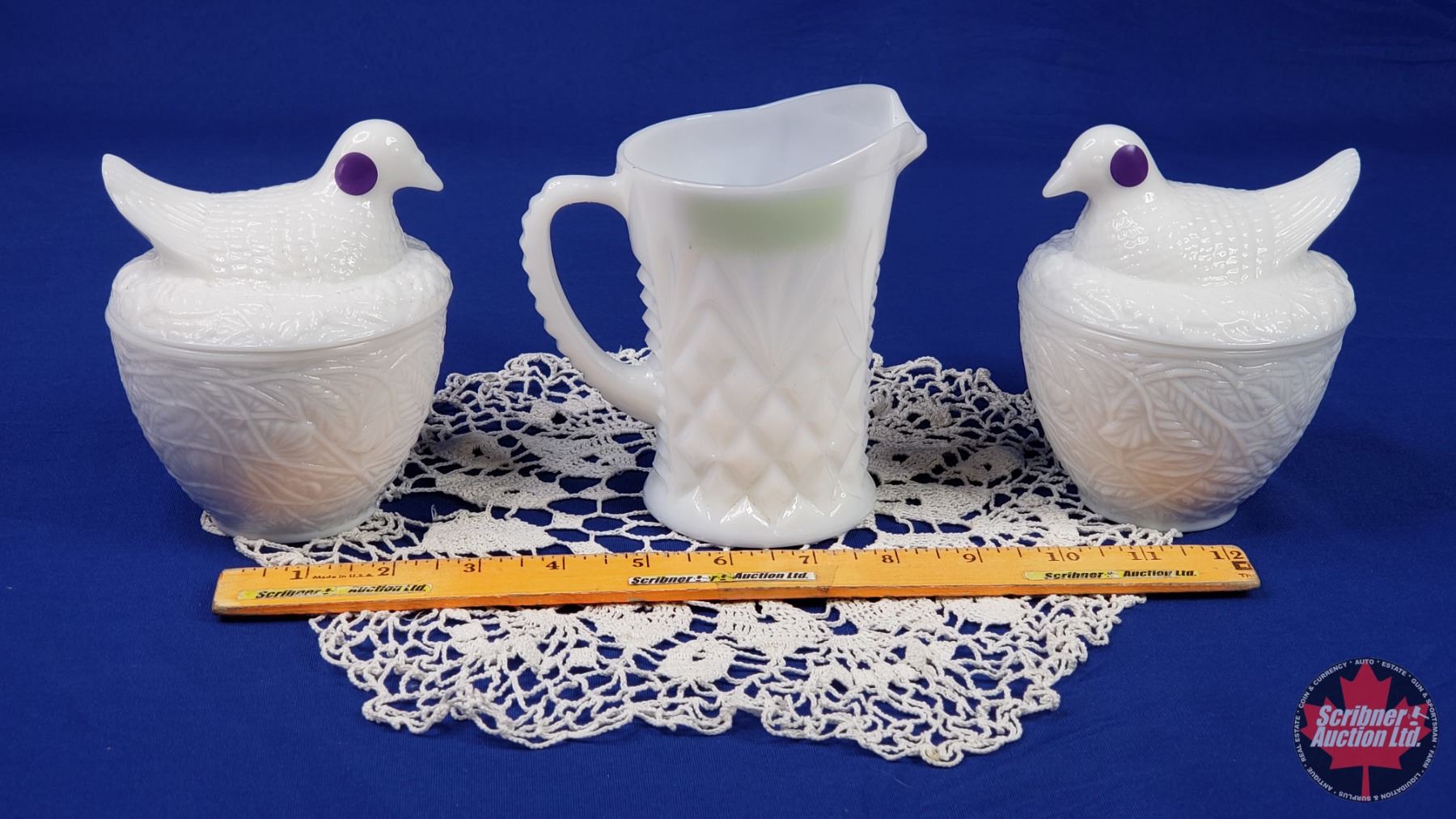 Milk/White Glass Trio : Nesting Doves (Avon) & Milk Pitcher (5-1/2"H) (SEE PICS!)
