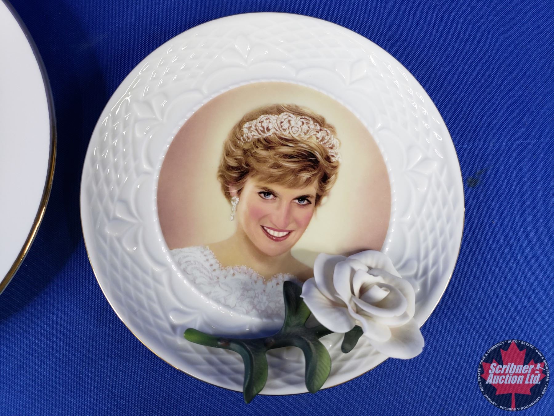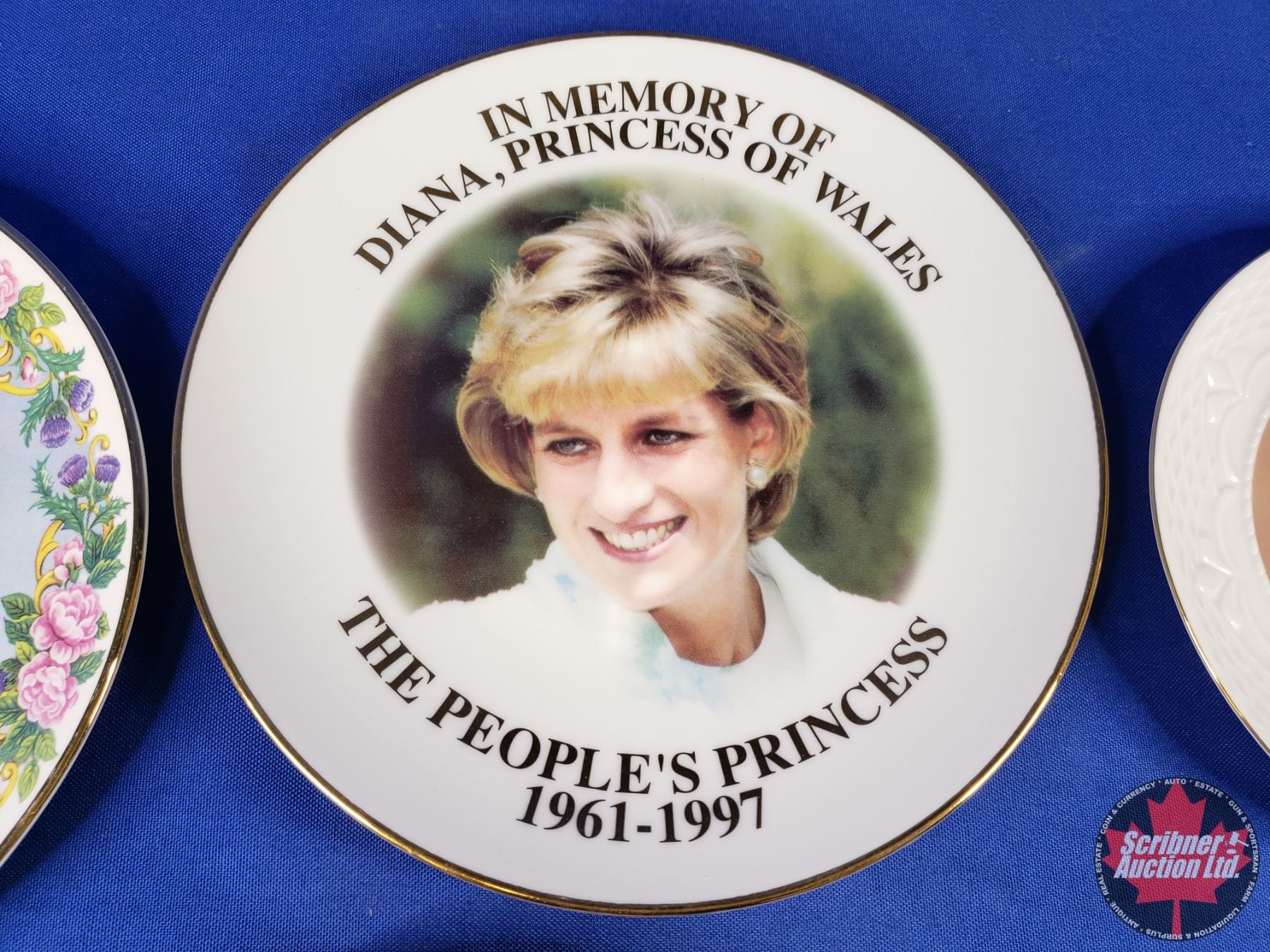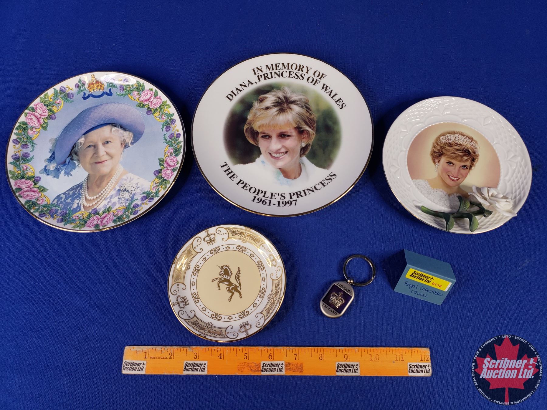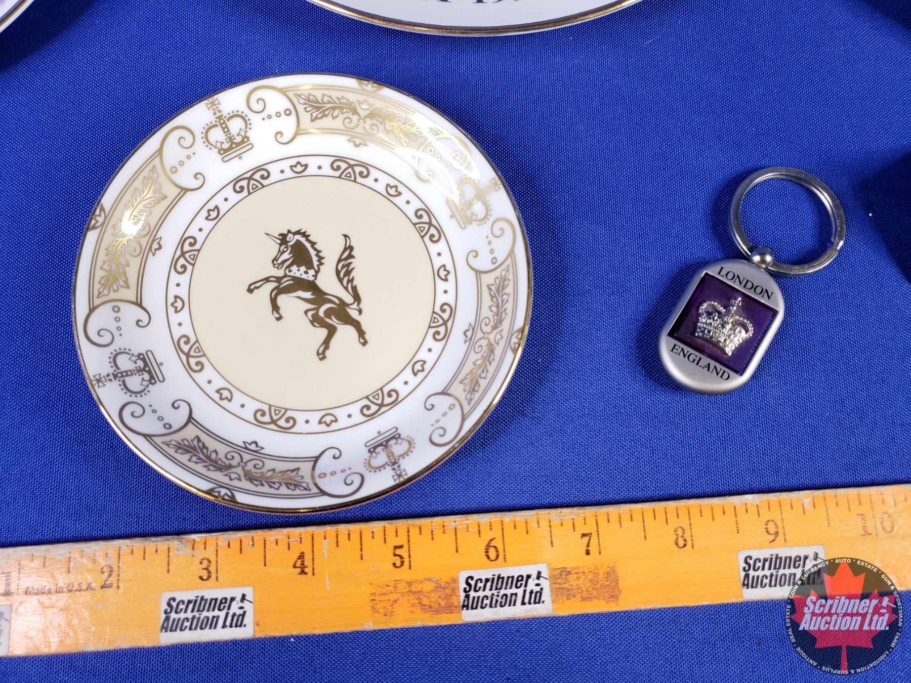 Monarchy Collector Combo (5pcs) : Queen Mother Collector Plate; Princess Diana (2 Plates); London England Key Chain & Kensington Collection Plate (Largest Measure 8-1/4"Dia) (SEE PICS!)