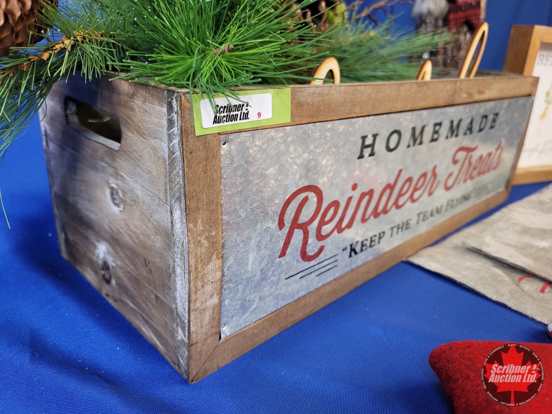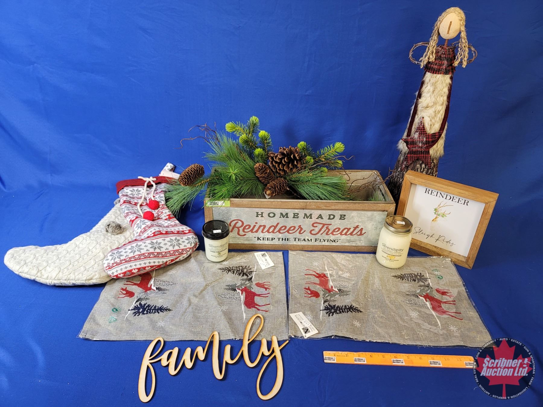 NEW STOCK: Combo Décor Group ~ Wood Box "HomeMade Reindeer Treats"; Serendipity Candles (2); Placemats; Framed "Reindeer Sleigh Rides"; Stockings (2); Greenery; Script "Family"; Décor Angel (Box Measures: 6-1/2"H x 20"W x 8"D) (SEE PICS!)