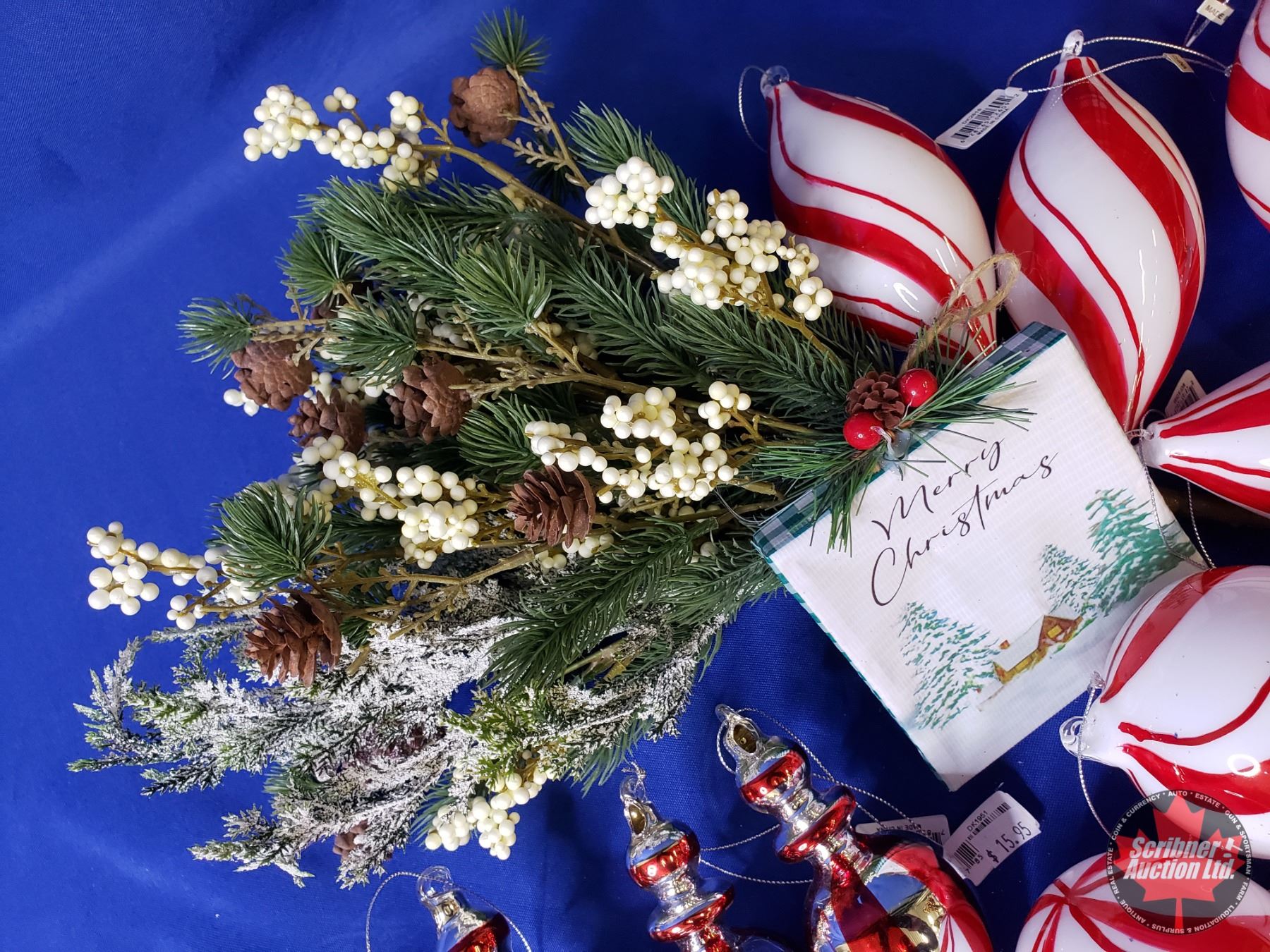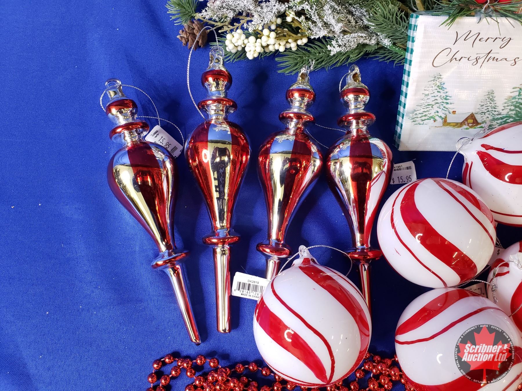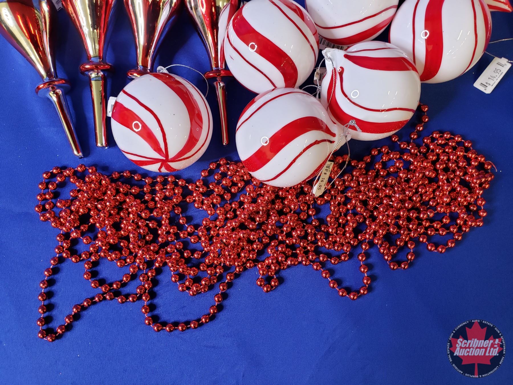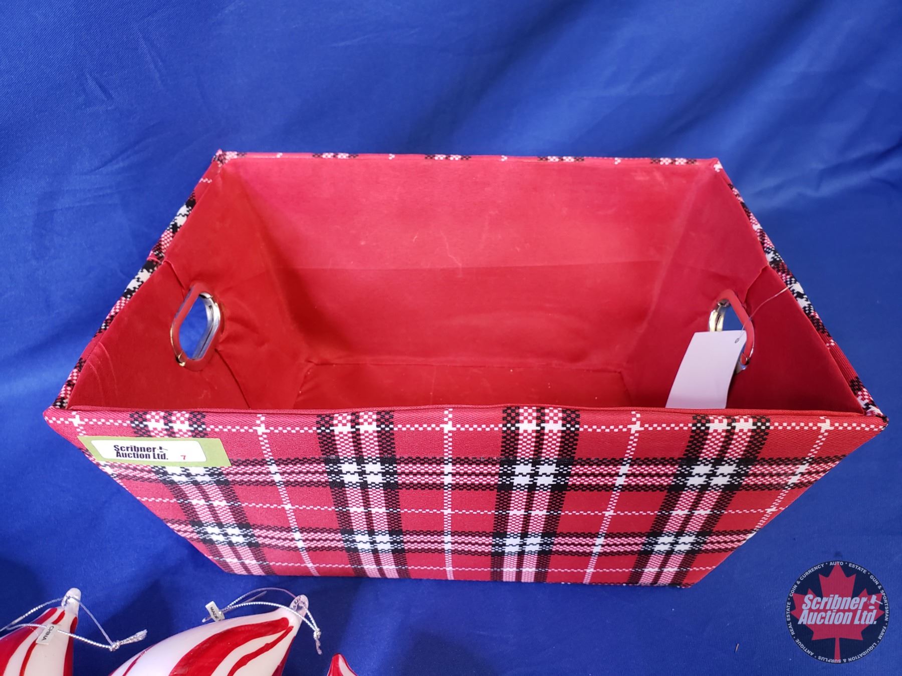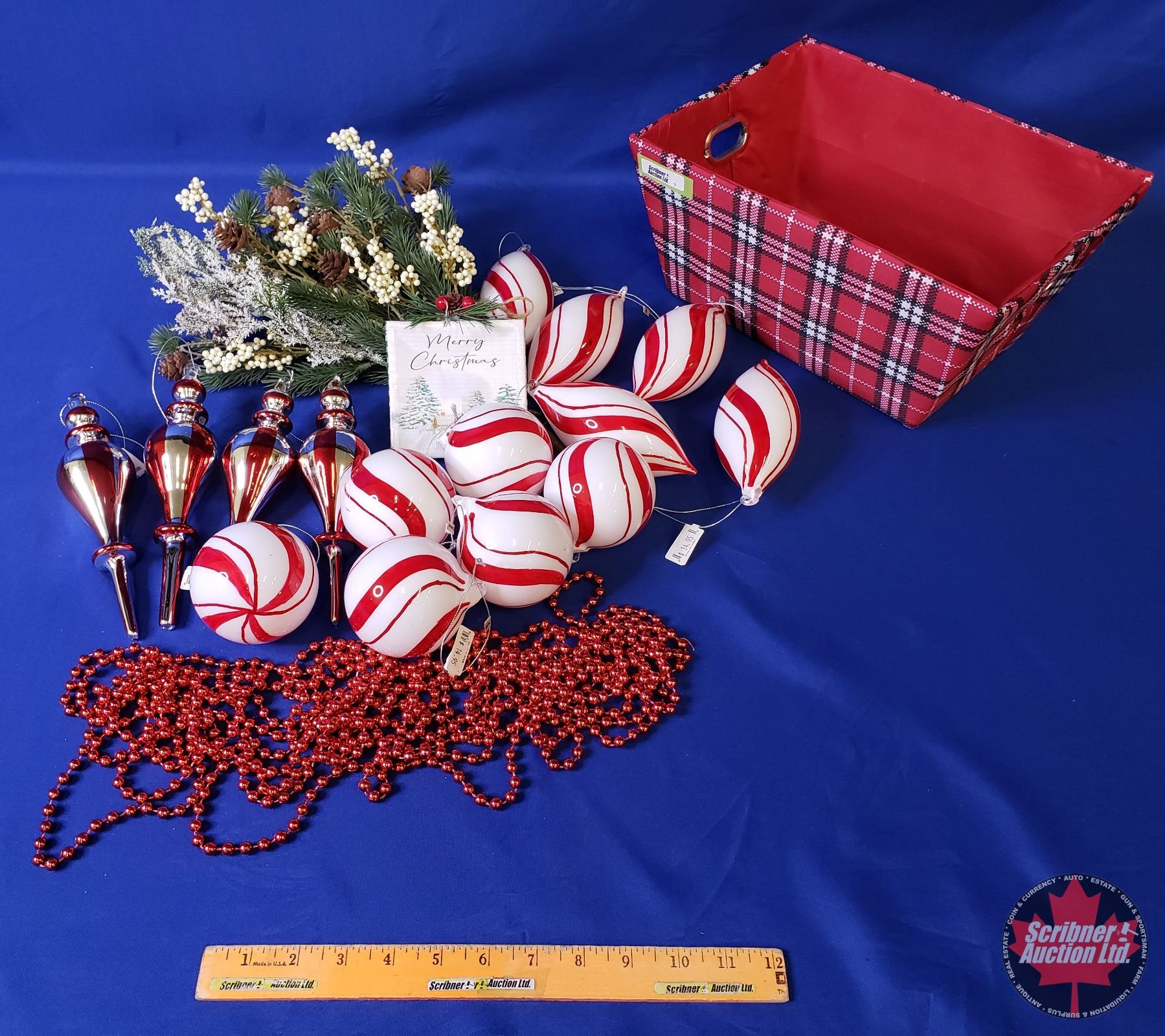 NEW STOCK: "Red/White/Candy Cane Theme" Combo Lot: Plaid Basket; Ornament Bulbs (15); Greenery; Red Beads (Basket Measures: 6"H x 13"W x 9"D) (SEE PICS!)