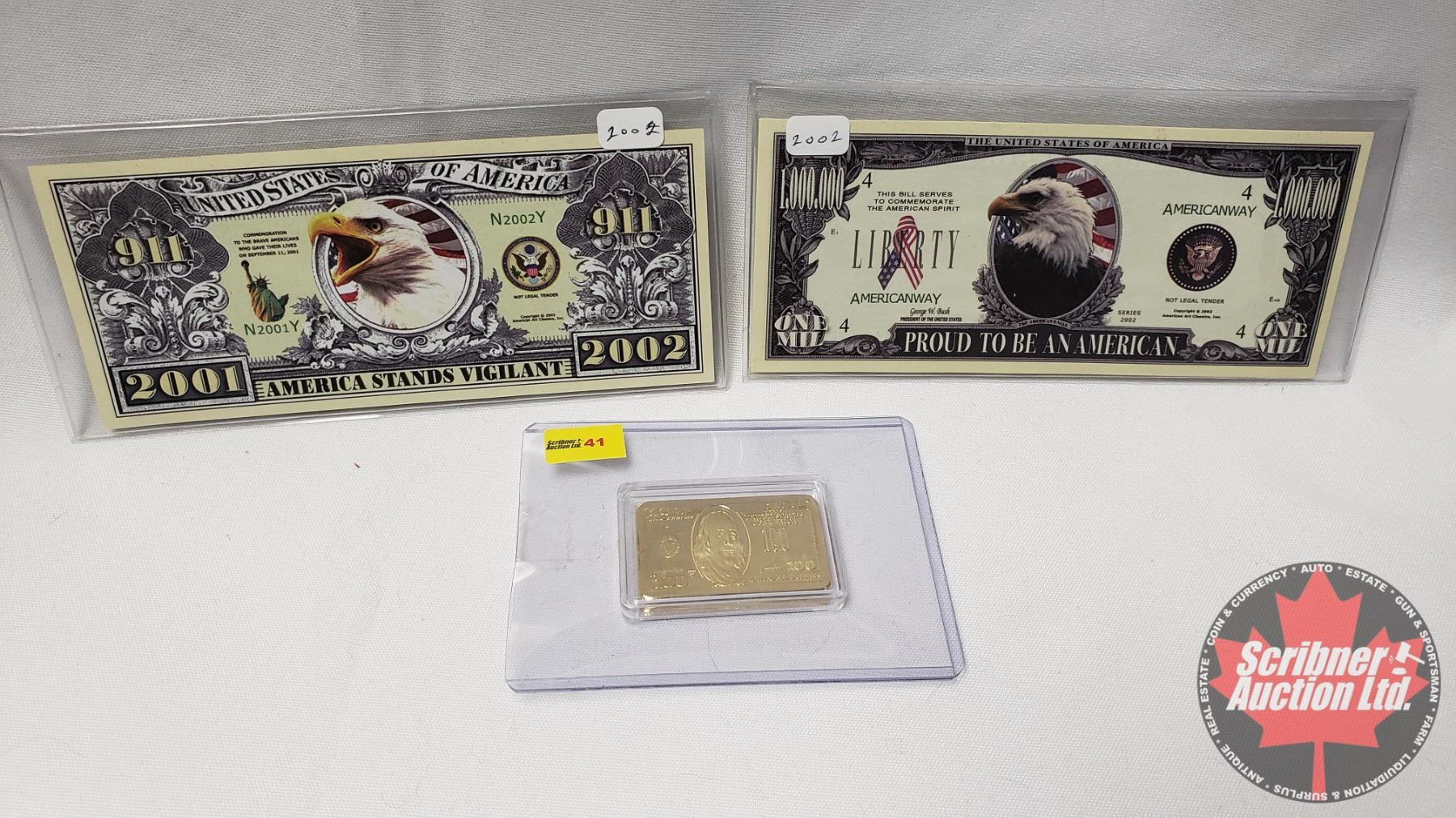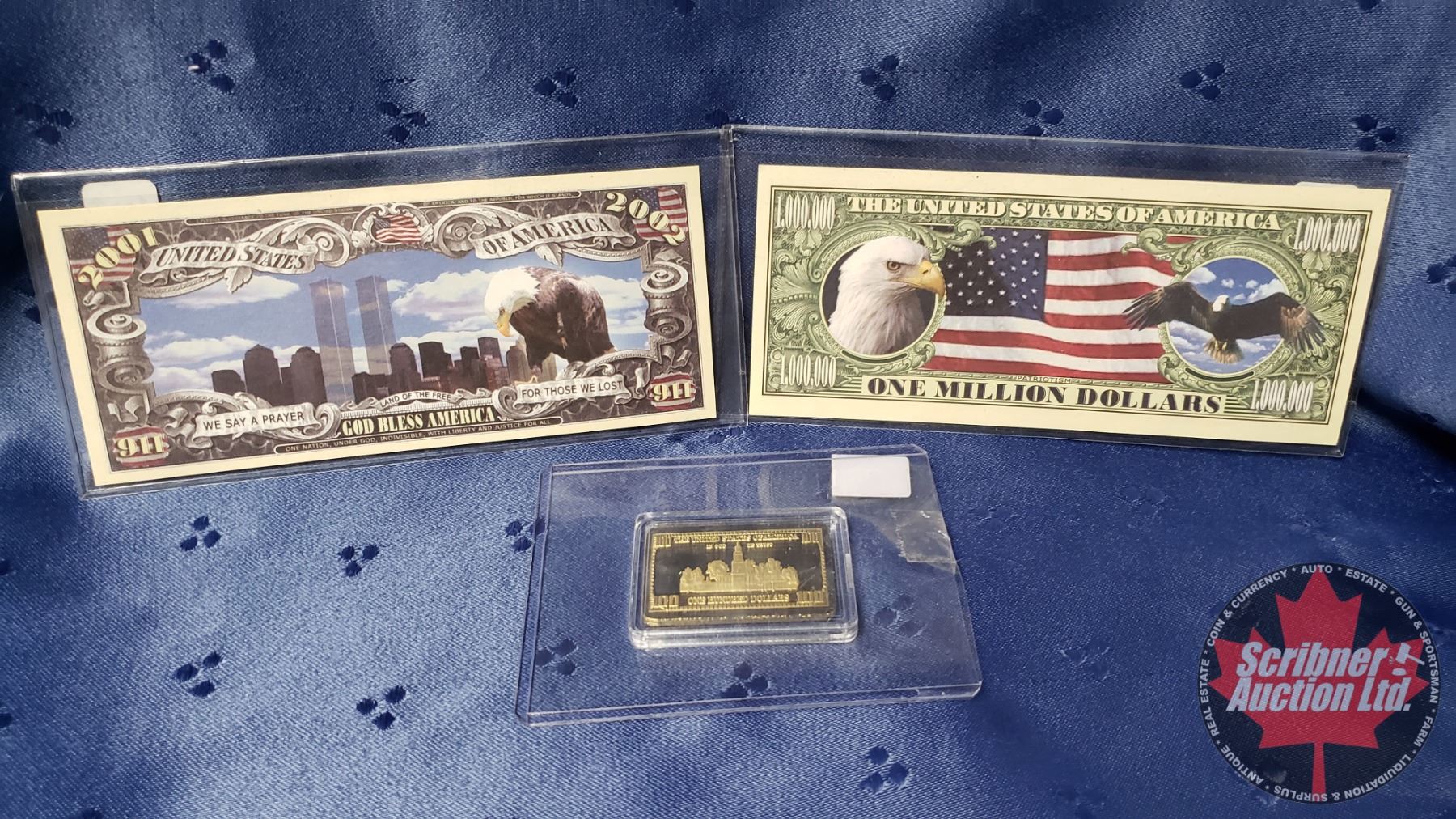 Novelty Bills (2) : USA Million & 911 Bill + Replica of Gold Clad Bar