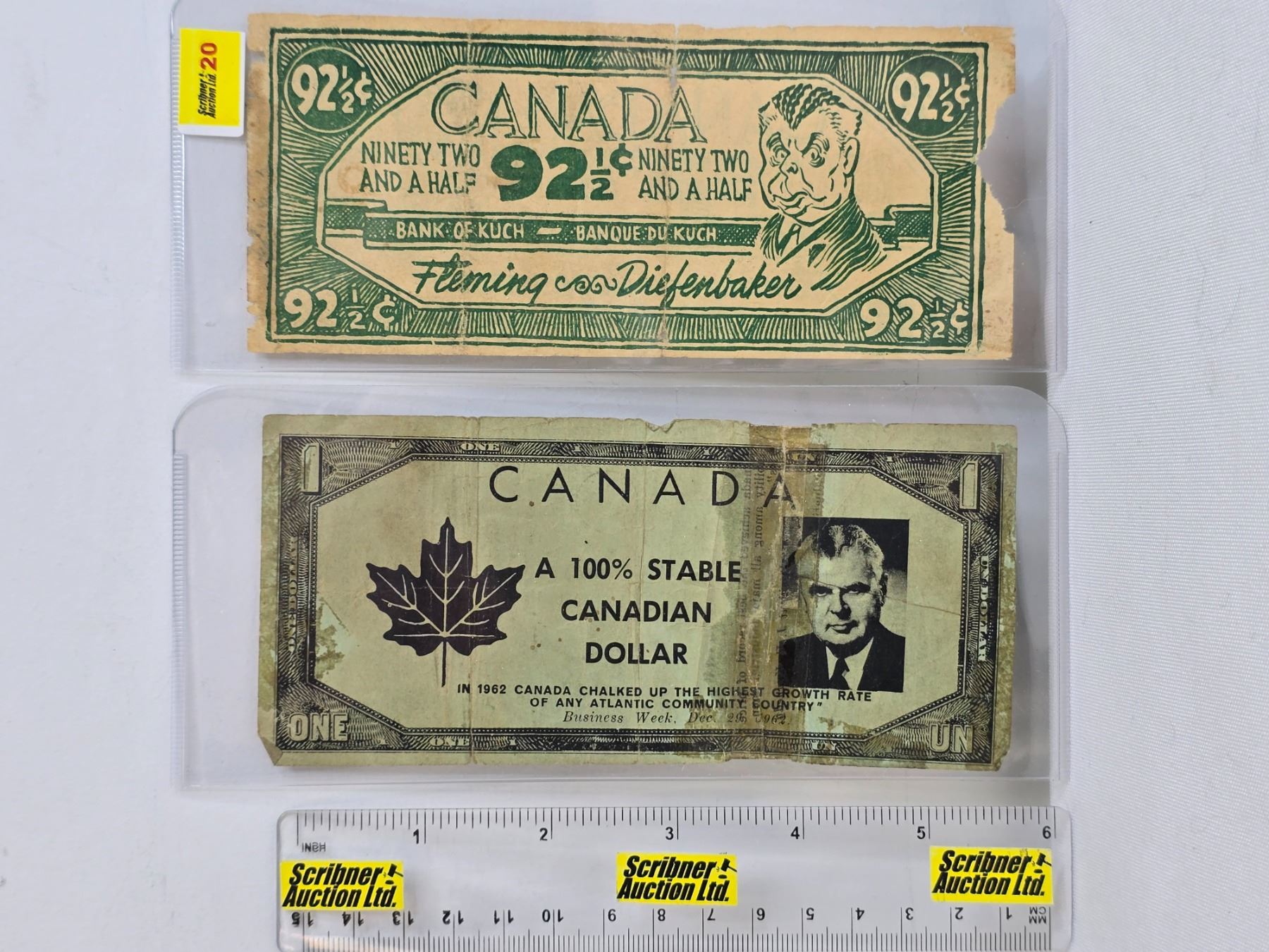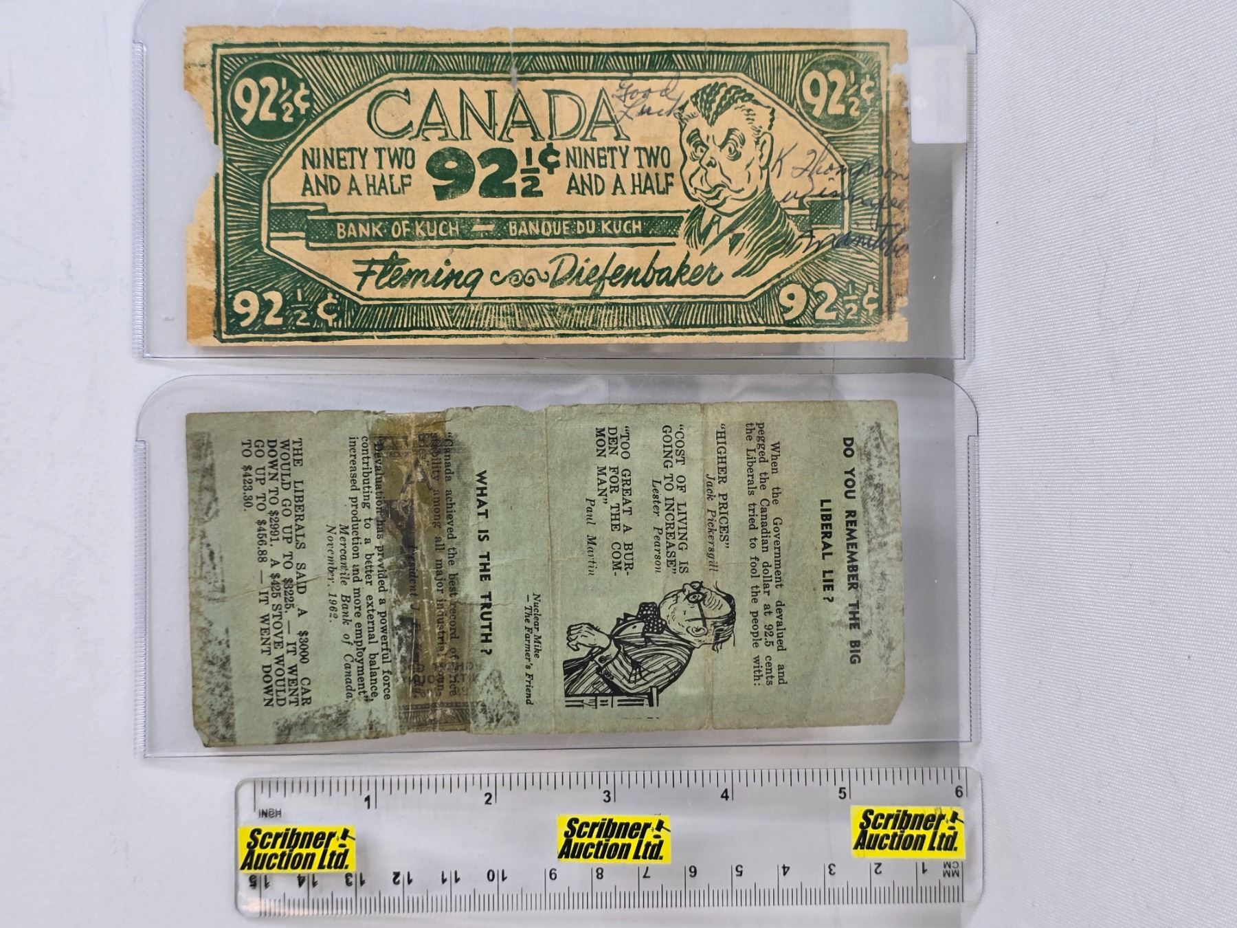 Novelty Canadian Vintage Political Bills (2): - Conservative Propaganda : Dec 1962 - Fleming ~ Diefenbaker 92-1/2¢ (See Pics for Varieties, Conditions, Serial Numbers, Printing Dates & Signatures) (Listing & Descriptions are a GUIDE ONLY and are subject to changes, errors, additions or deletions. Please use the provided pictures to satisfy yourself to the Condition and/or Grades. Please Read & Understand All Terms & Conditions for this Auction Sale.)