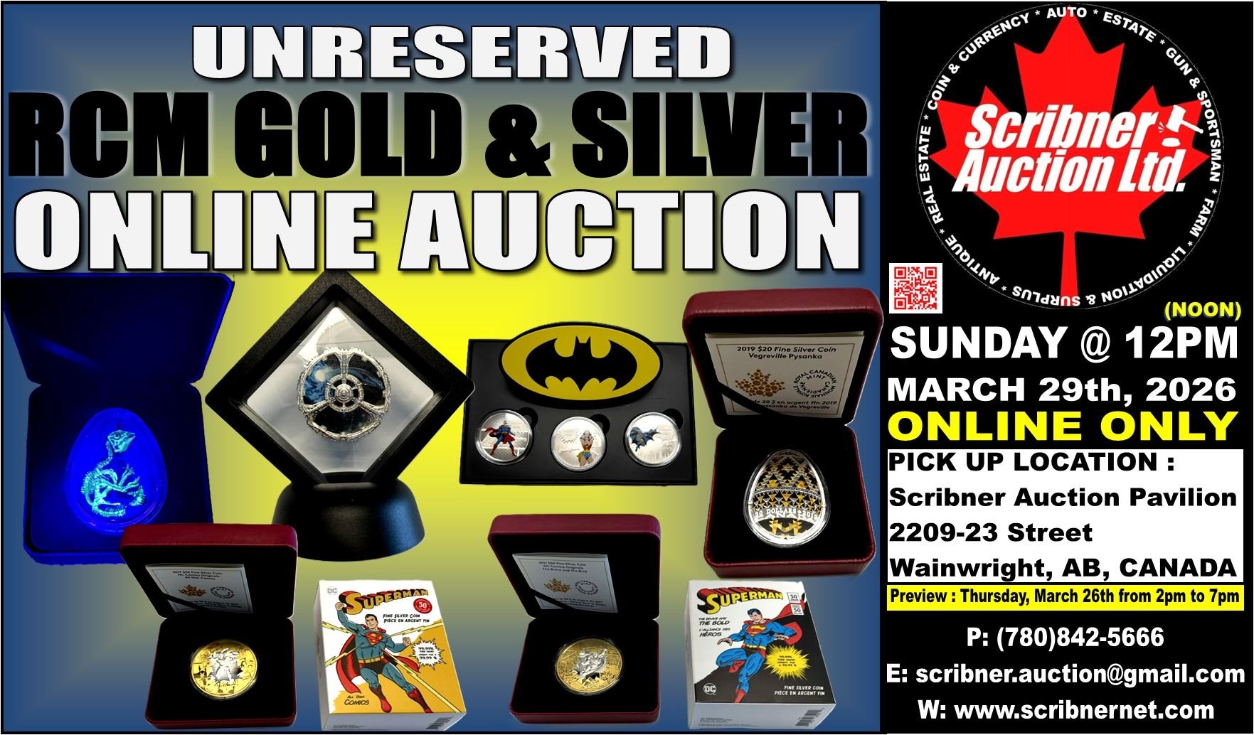 FRIDAY - SATURDAY - SUNDAY : Purchases will be packaged up after the auction and shipped via Canada Post or PUROLATOR (please let us know which of those 2 Couriers you prefer) within 12-16 days of the auction sale. IF CANADA POST IS ON STRIKE we will be using Purolator. Purolator has offered us great rates competitive with Canada Post in some cases even better depending on location. Please contact us via email (reception.scribnerauction@gmail.com) or call 780-842-5666 prior to the auction if you wish to arrange alternate shipping. Shipping & Handling Charges will be charged to your credit card at the time of shipping. Most packages shipped via Canada Post come with $100 insurance. Please review Canada Post Terms & Conditions & Purolator Terms & Conditions for their respective Insurance Policies. If you want EXTRA Insurance from the carrier, you must instruct our office to purchase additional insurance! Scribner Auction Ltd. will not be responsible for any damage or breakage to any item for any reason (shipping, handling or otherwise). If you wish to arrange for Pick Up at our Wainwright, AB location, please call our office to make an appointment 780-842-5666. You MUST schedule an appointment (NO DROP INS PLEASE!)