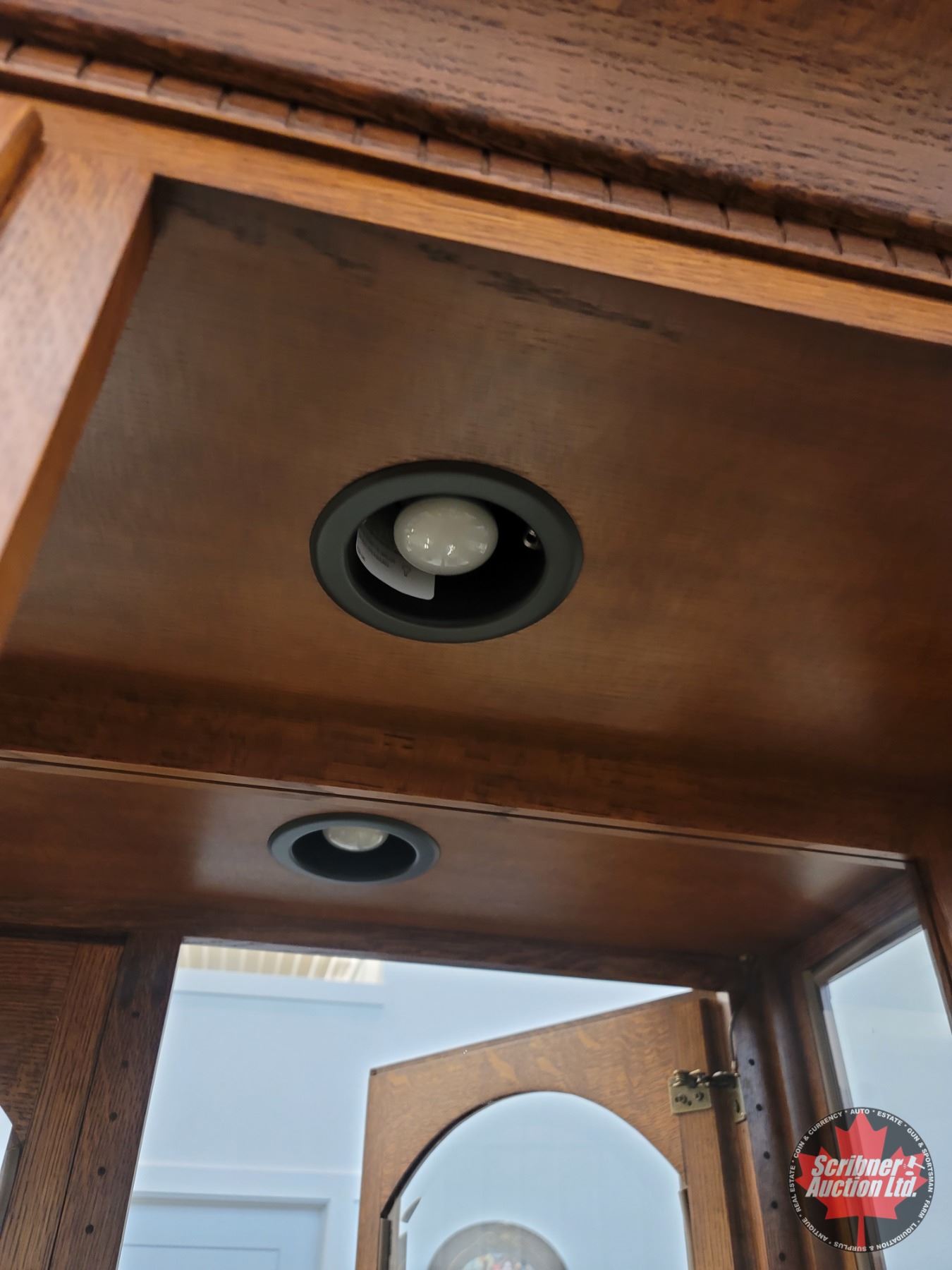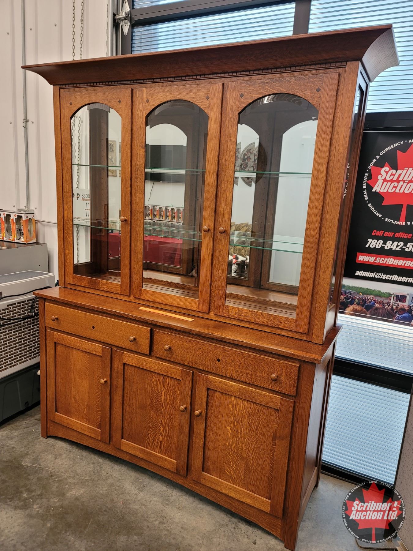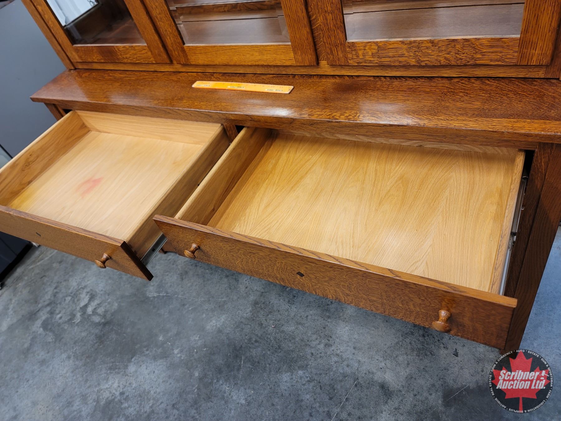 OAK China Cabinet "Royal Mission" Lighted : Bevelled Glass Doors (2 Glass Interior Shelves w/Plate Grooves) (Soft Close Drawers) (80"H x 61-1/2"W x 20"D) (SEE PICS!)