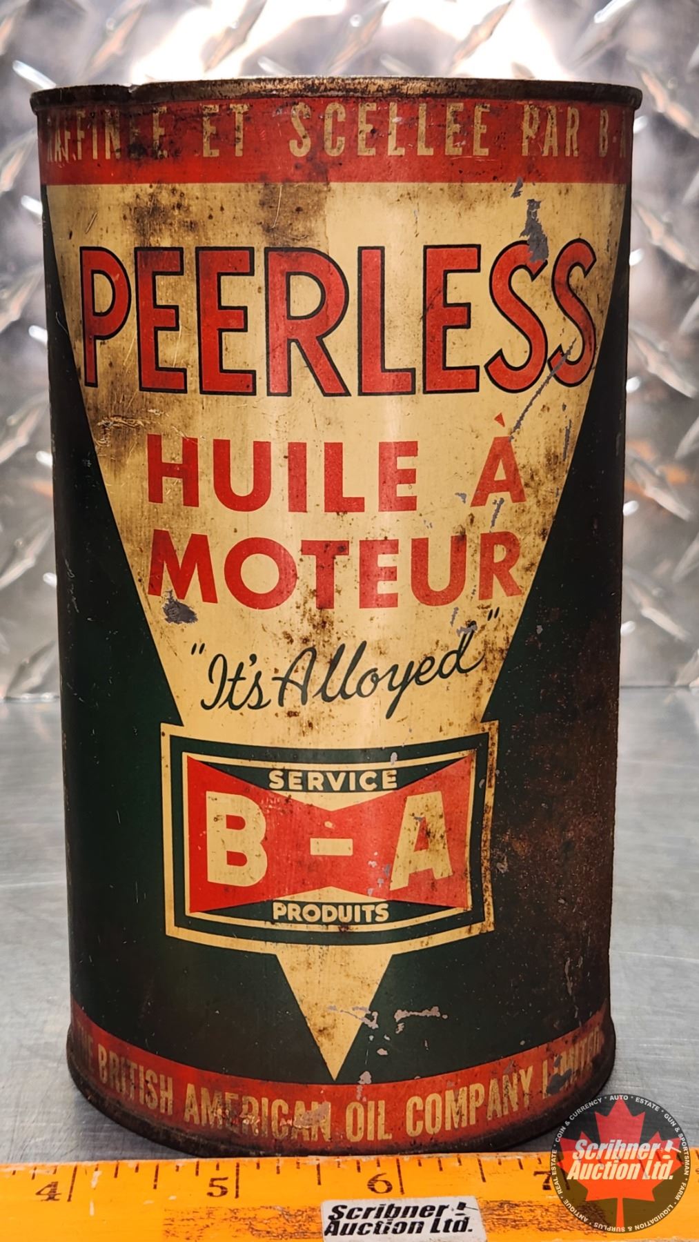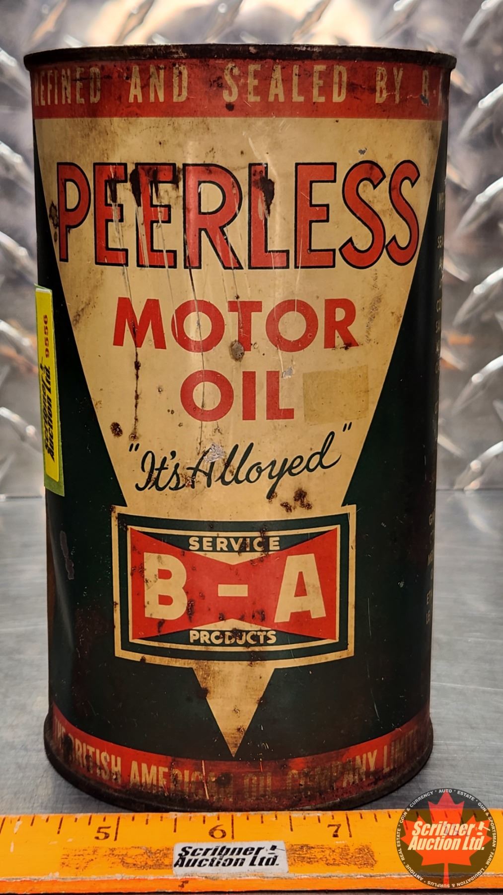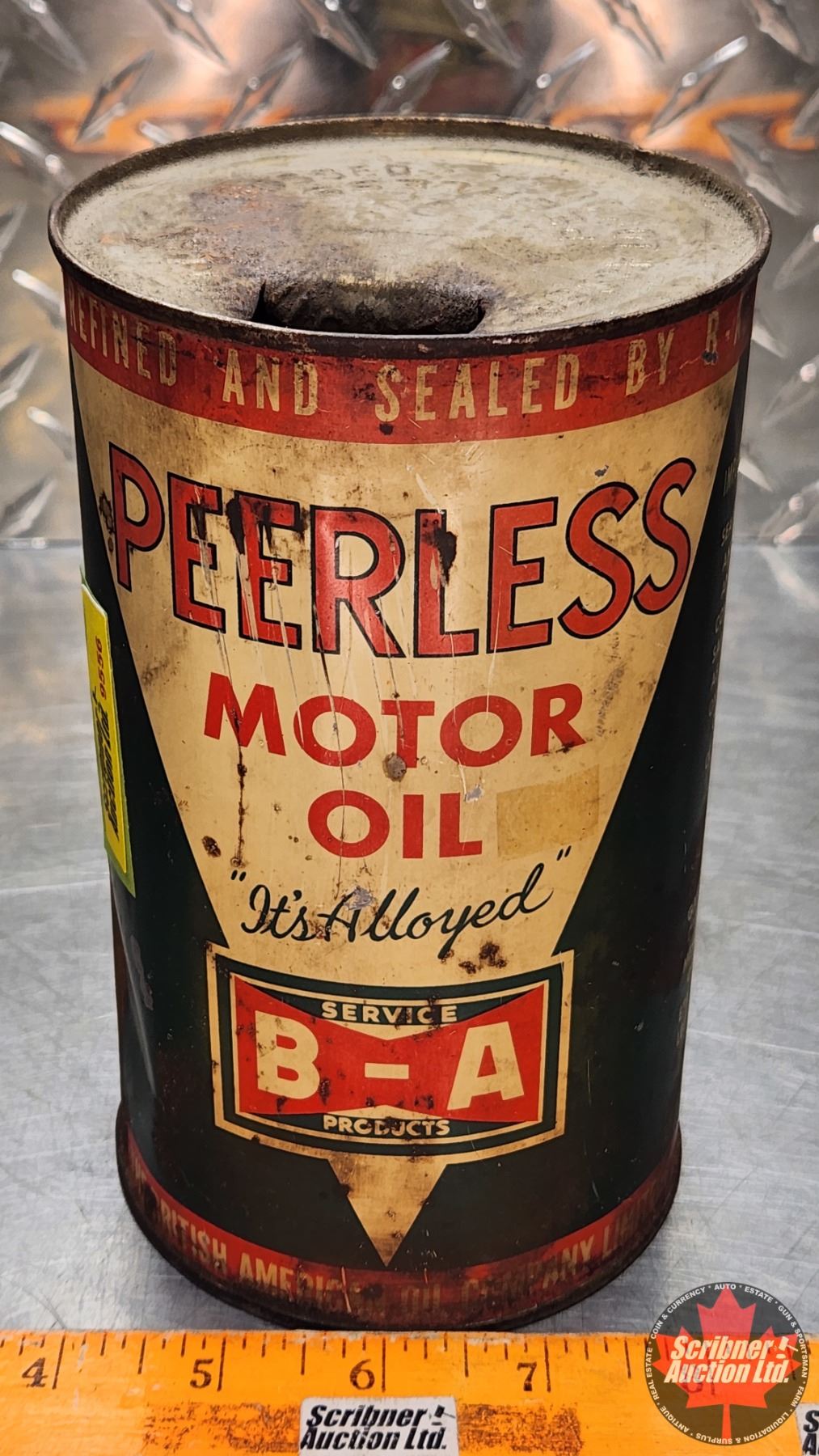 OIL TIN : B/A (Bowtie) Peerless Motor Oil "It's Alloyed" (6-3/4"H x 4"Dia) (SEE PICS!)
