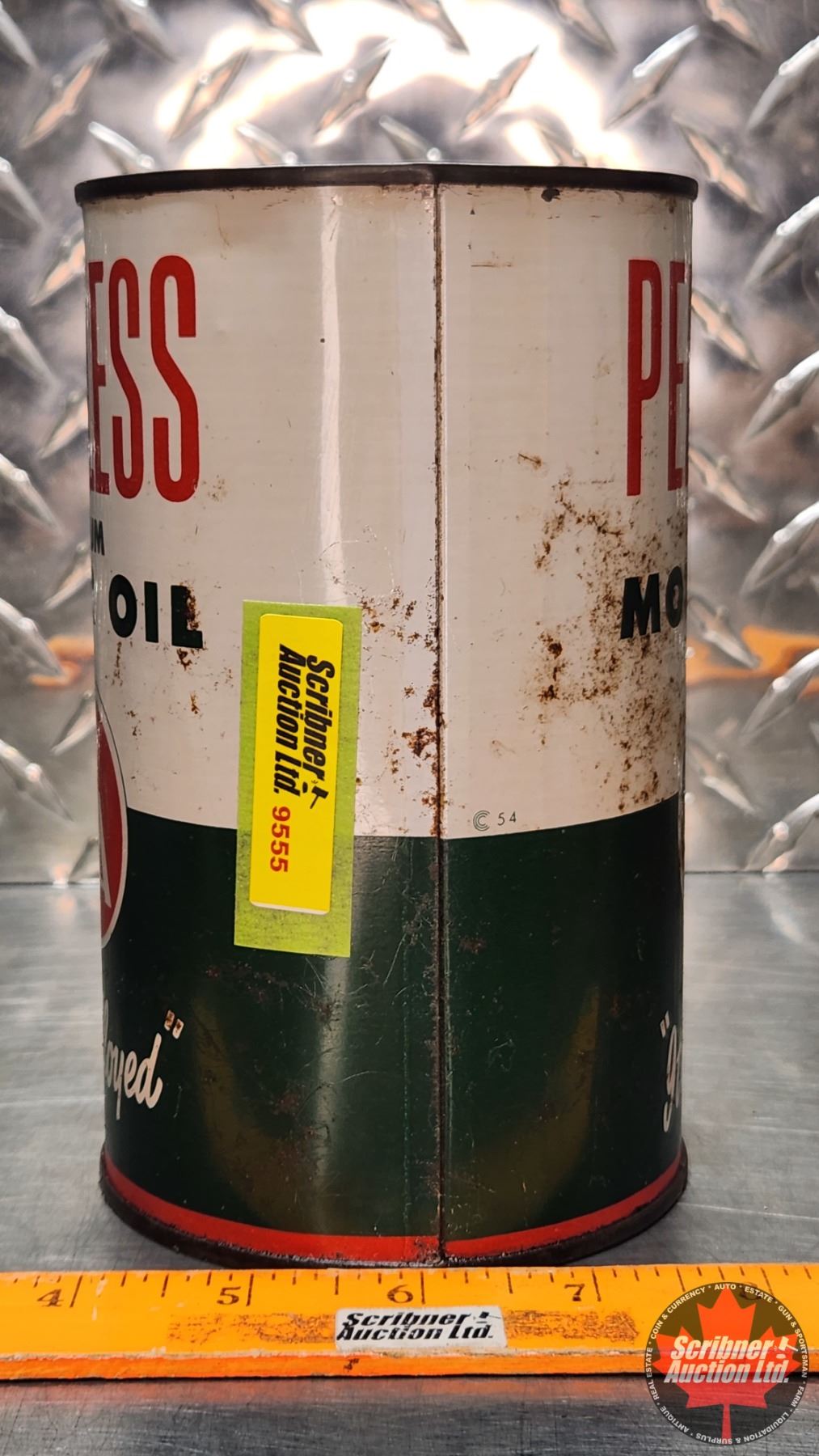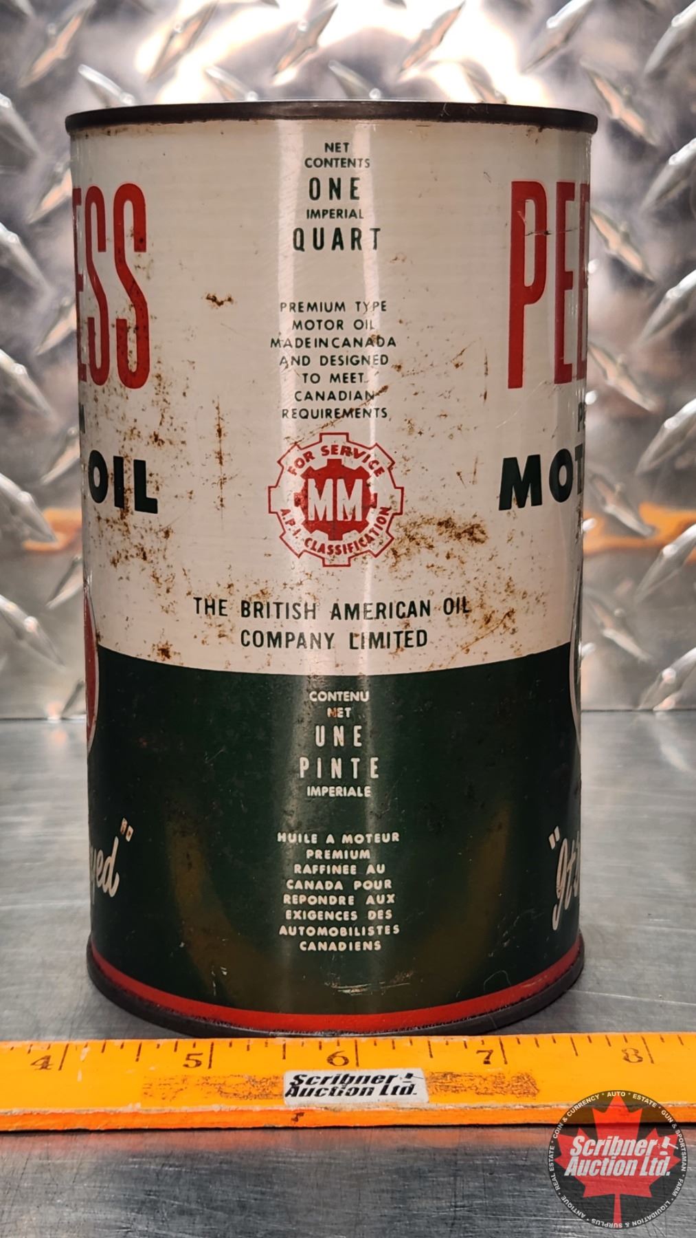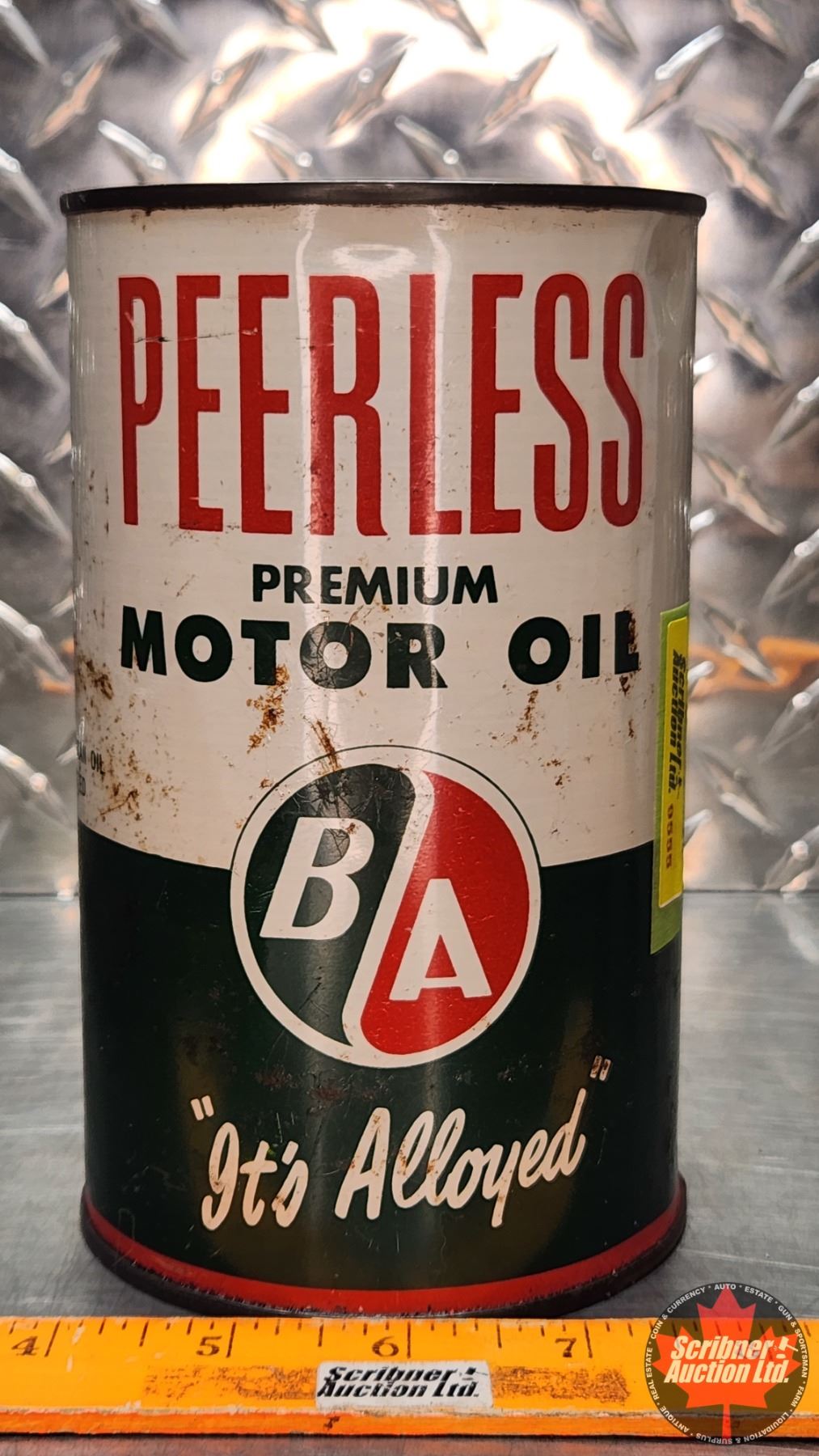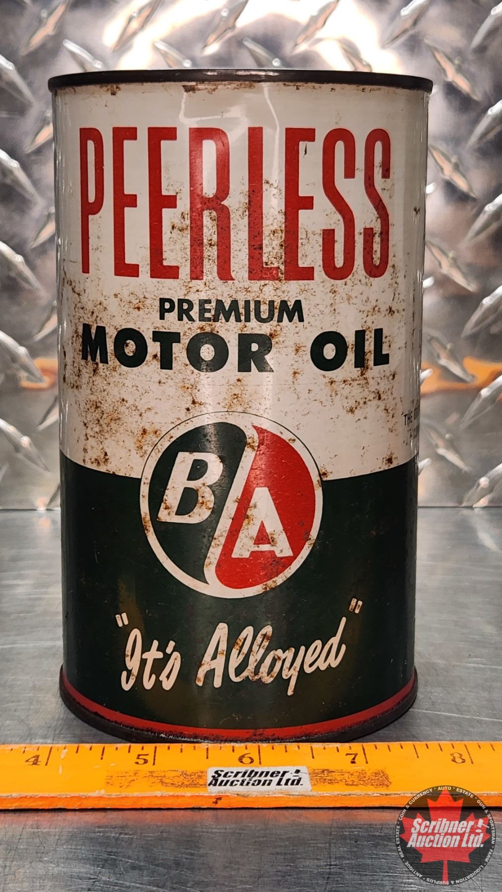 OIL TIN : B/A Peerless Premium Motor Oil "It's Alloyed" (6-1/2"H x 4"Dia) (SEE PICS!)