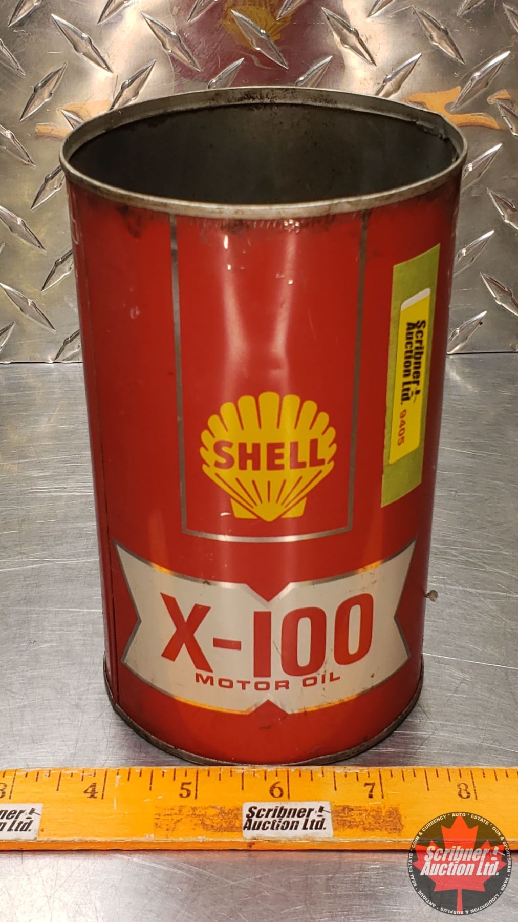 OIL TIN : Shell X-100 Motor Oil (6-1/2"H x 4"Dia) (SEE PICS!)