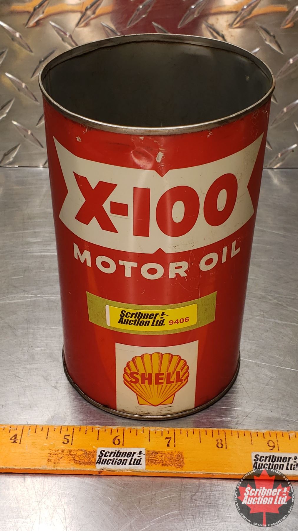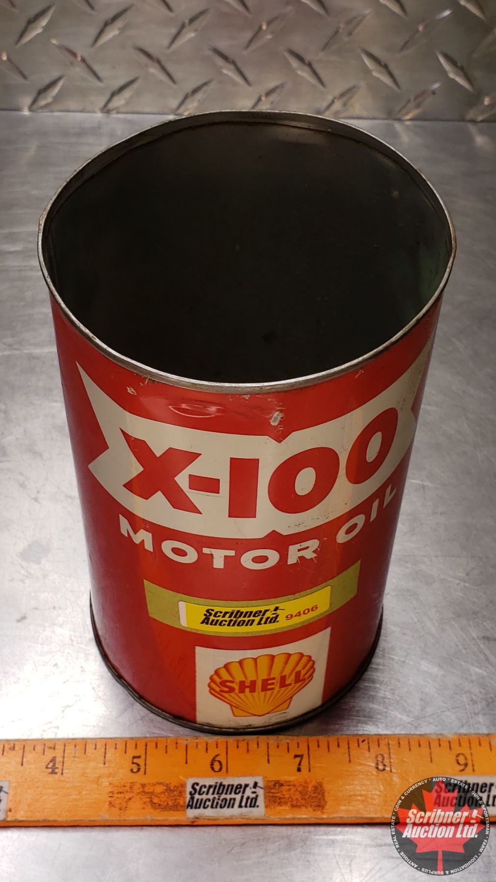 OIL TIN : Shell X-100 Motor Oil (6-1/2"H x 4"Dia) (SEE PICS!)