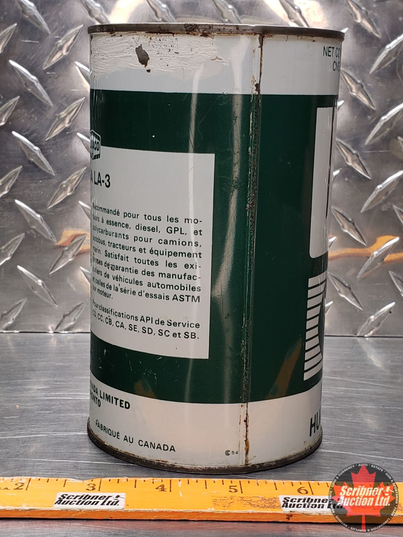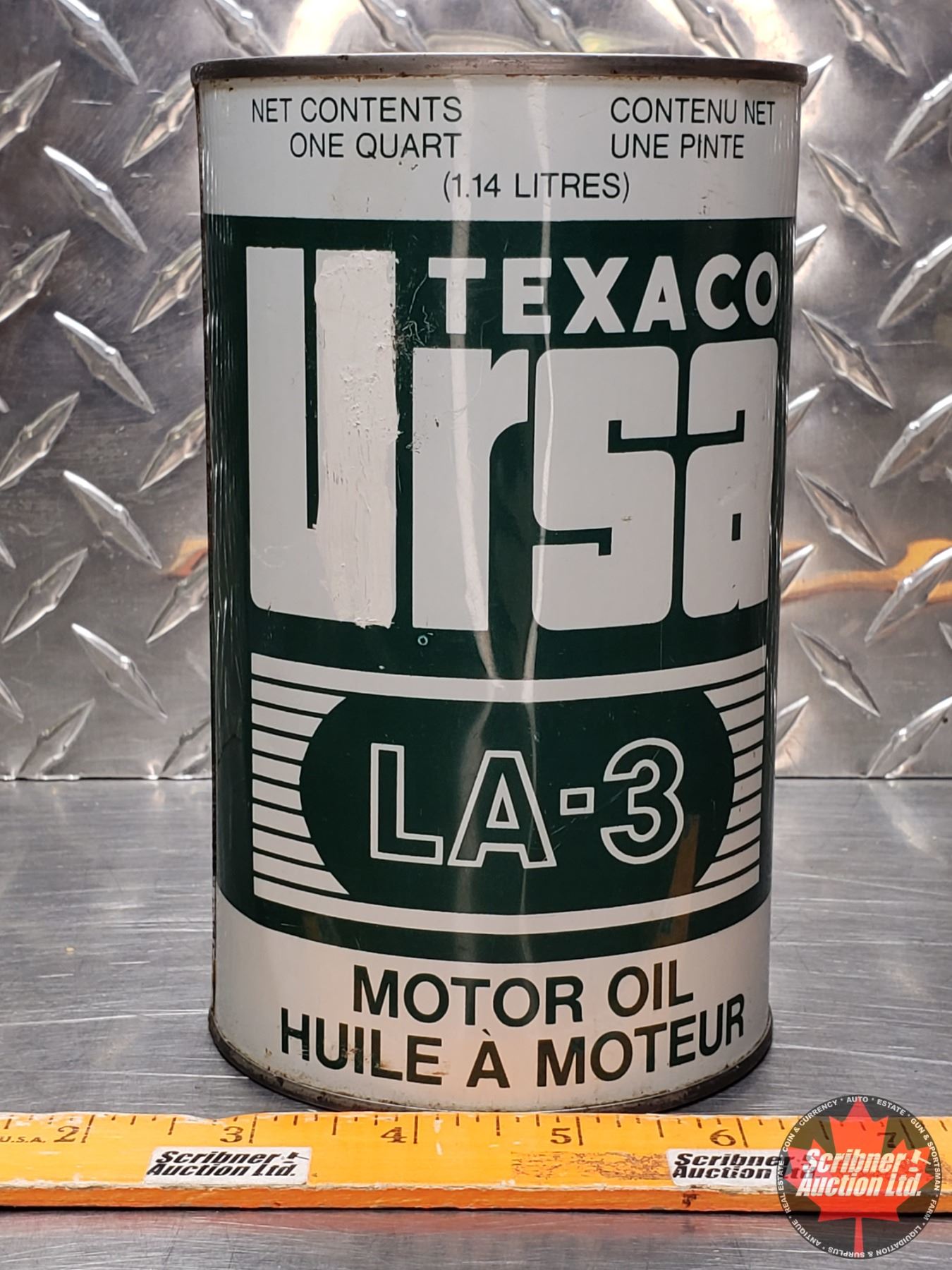 OIL TIN: TEXACO URSA LA-3 MOTOR OIL  (6-1/2"H x 4"Dia) (SEE PICS!)