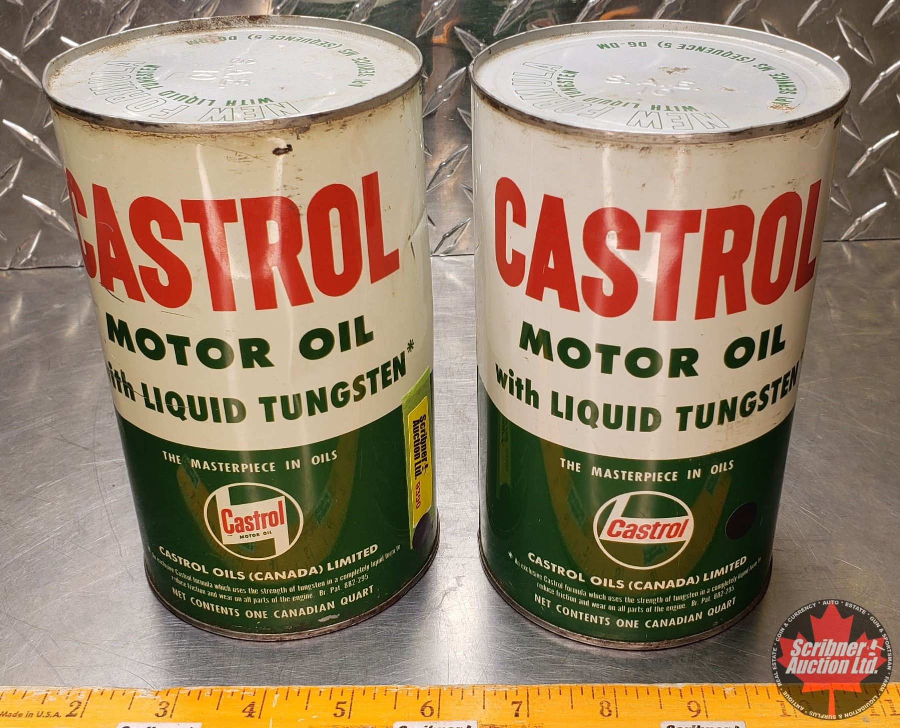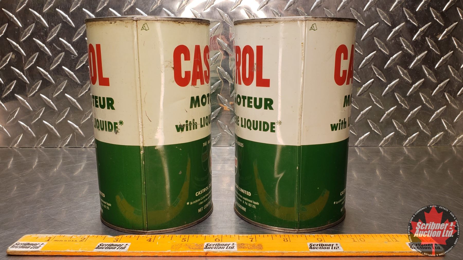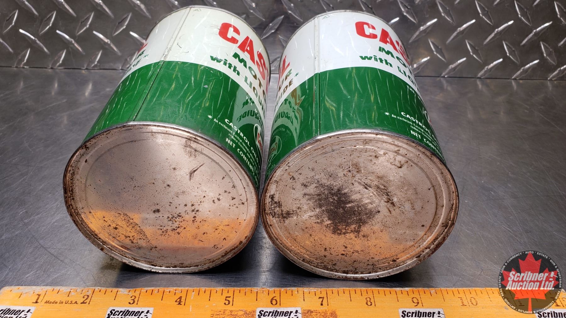 OIL TINS (2): Castrol Motor Oil (Full) (6-1/2"H x 4"Dia) (SEE PICS!)