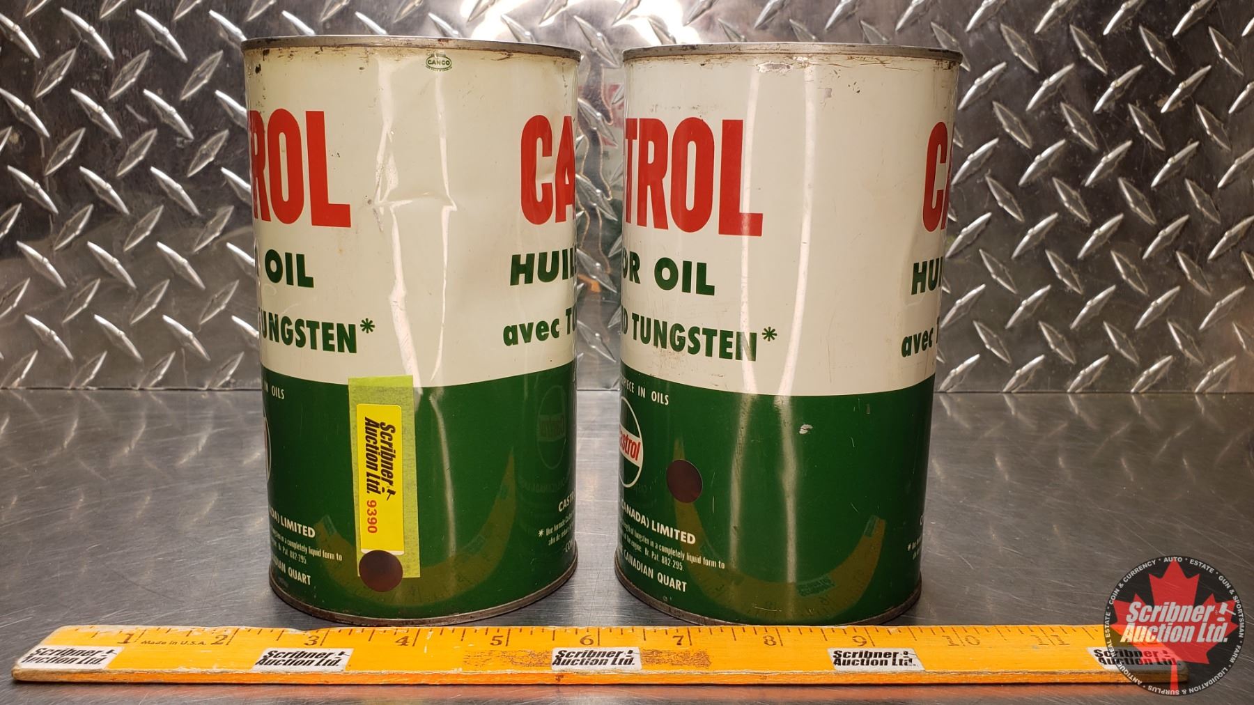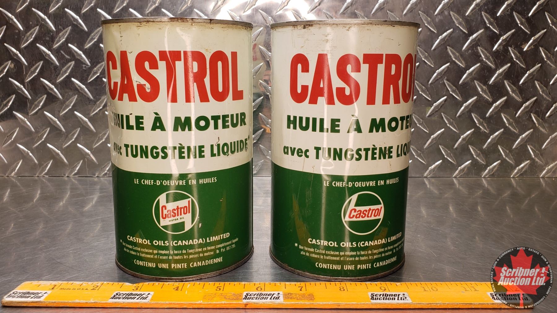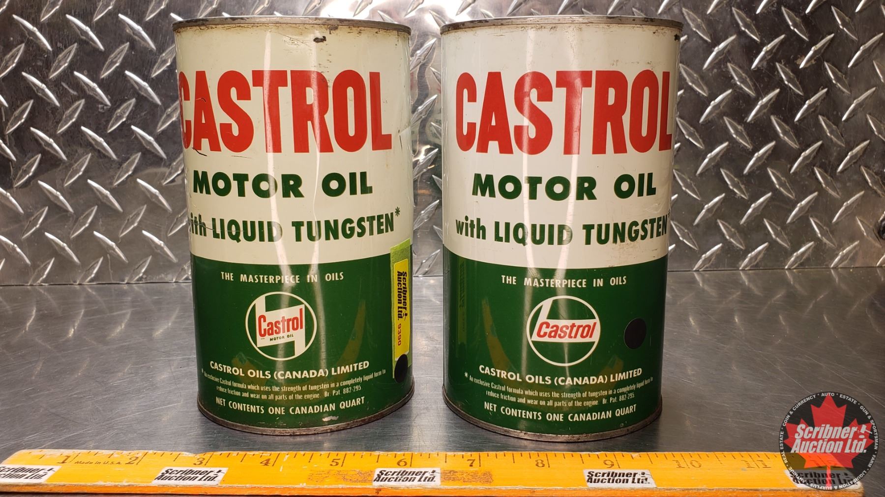 OIL TINS (2): Castrol Motor Oil (Full) (6-1/2"H x 4"Dia) (SEE PICS!)
