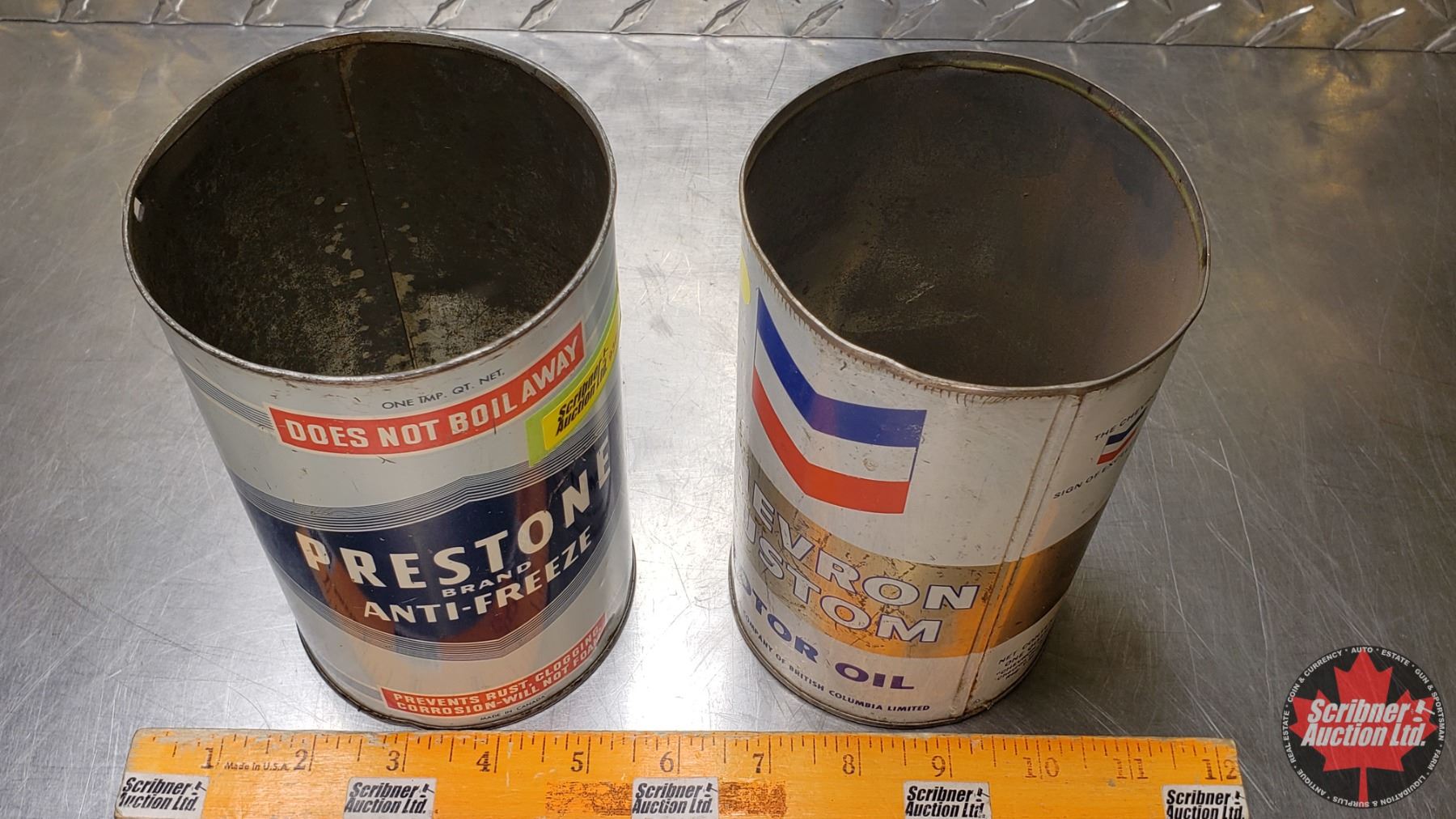 OIL TINS (2) : Prestone Anitfreeze & Chevron Motor Oil (6-1/2"H x 4"Dia) (SEE PICS!)