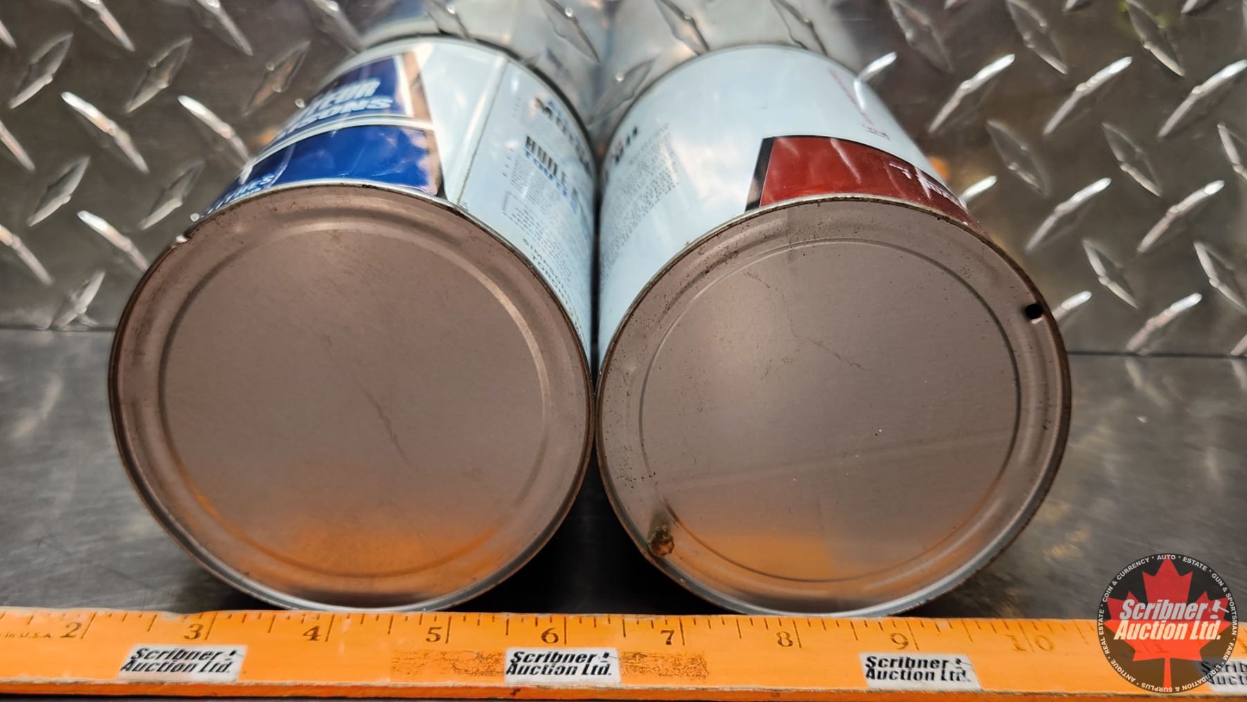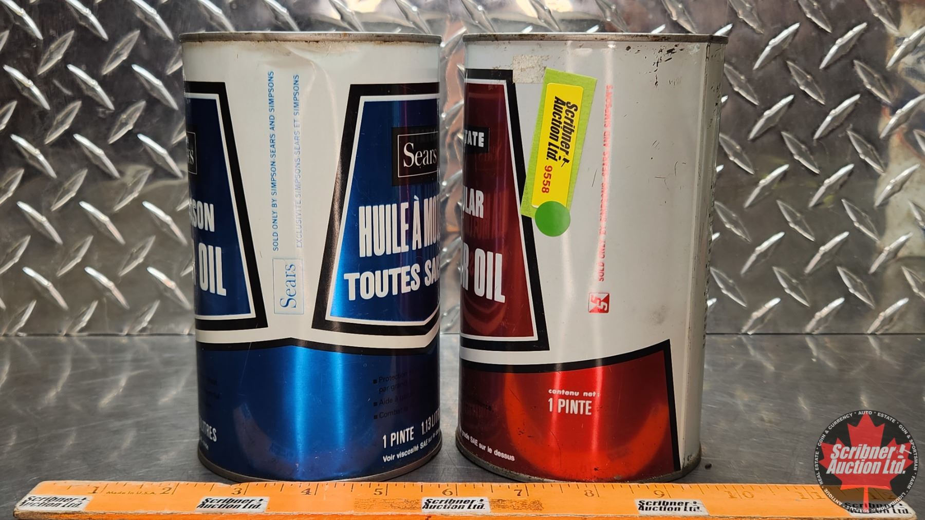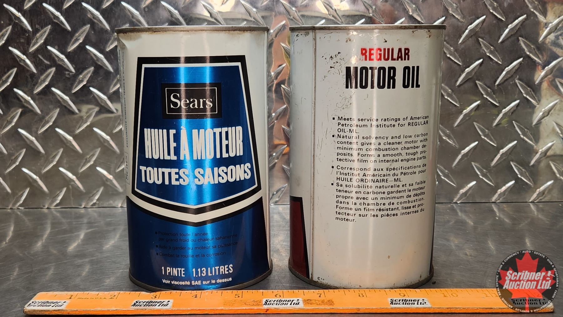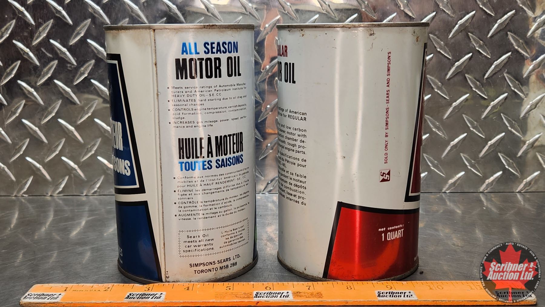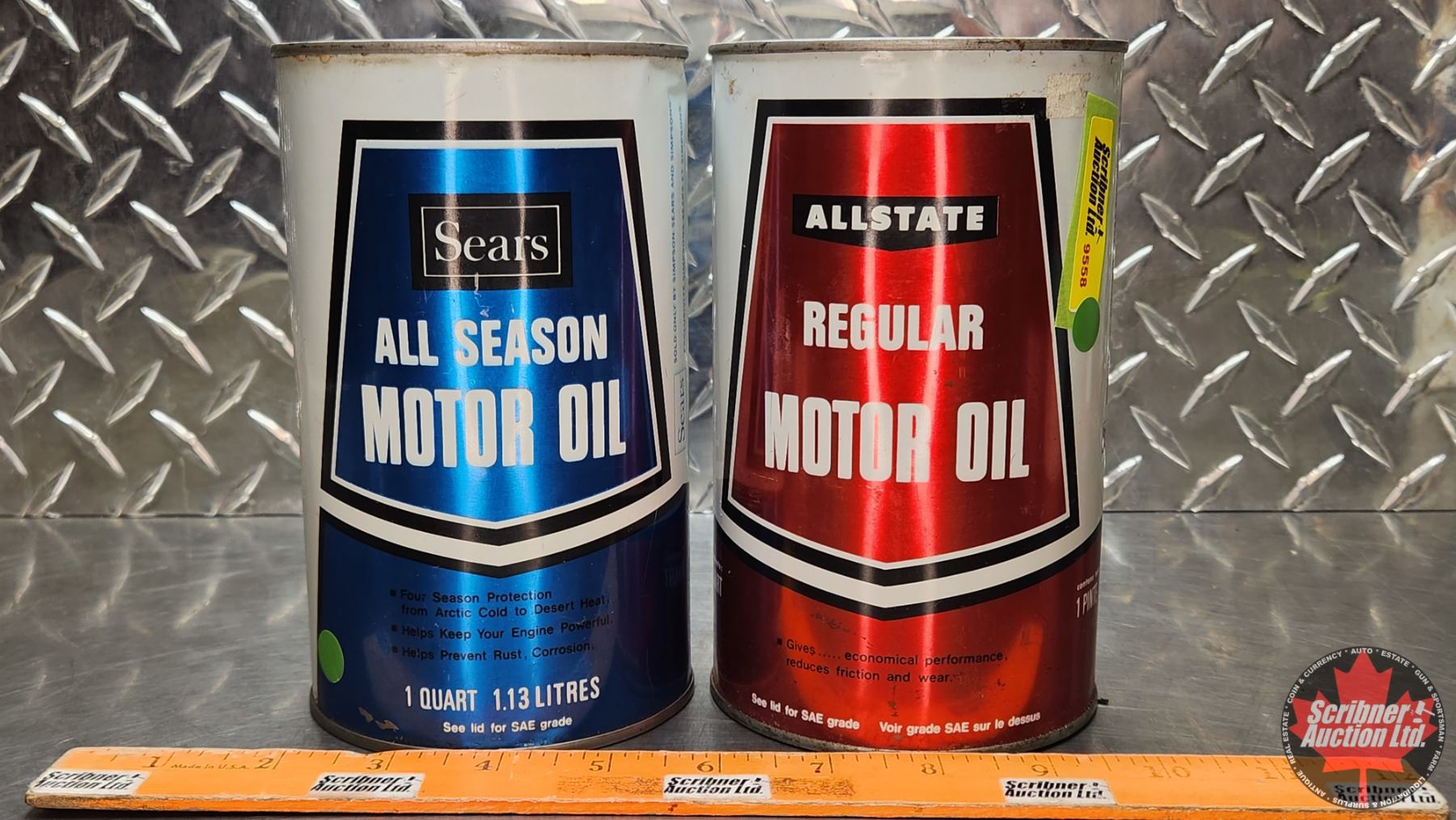OIL TINS (2) : Sears All Season Motor Oil & Allstate Regular Motor Oil (6-1/2"H x 4"Dia) (SEE PICS!)