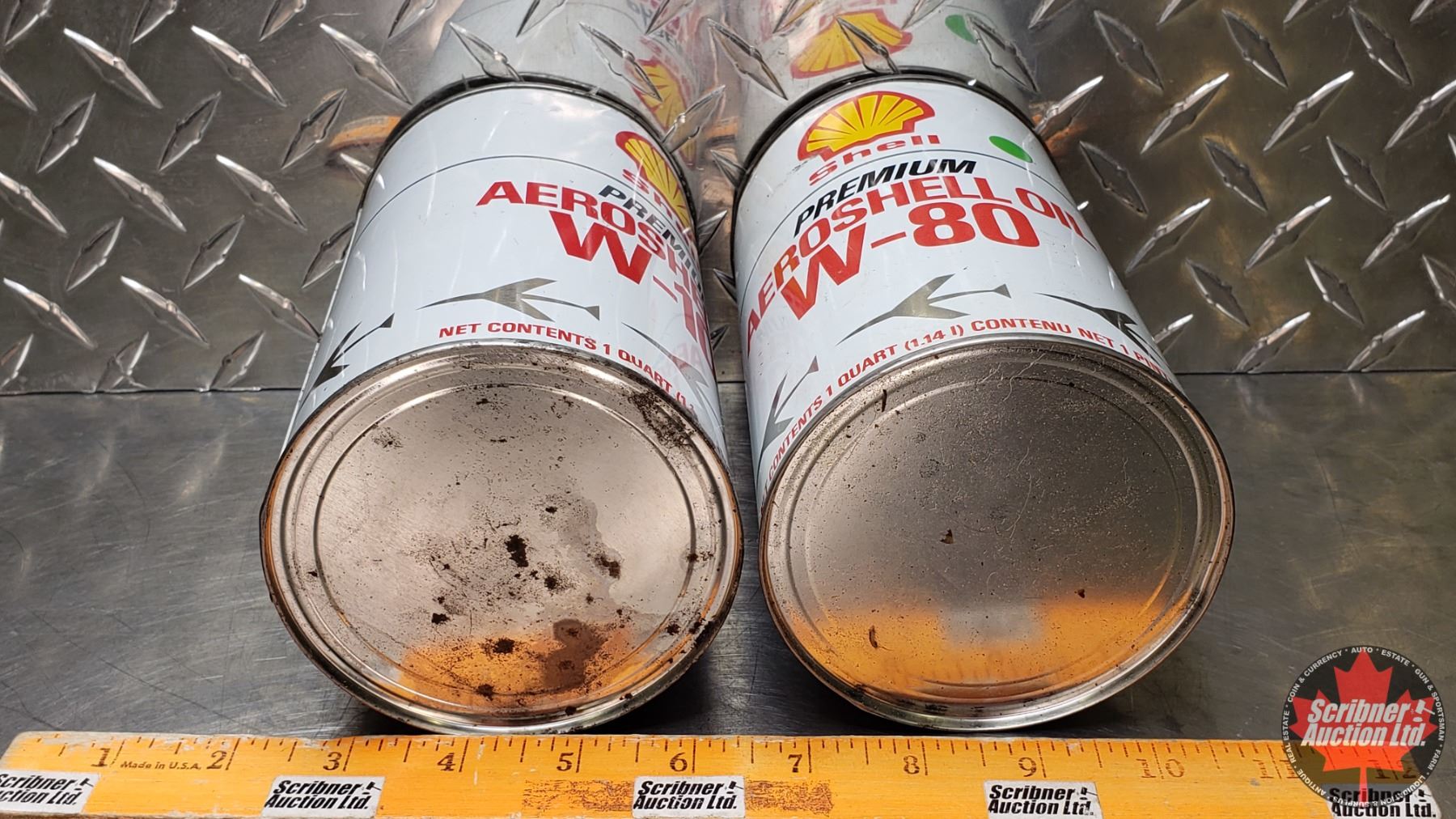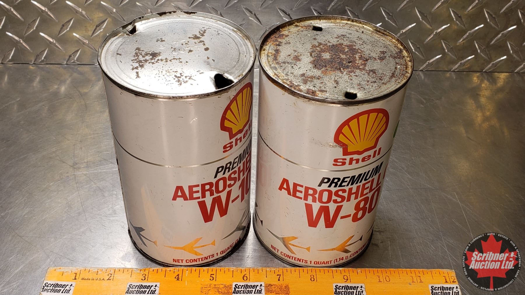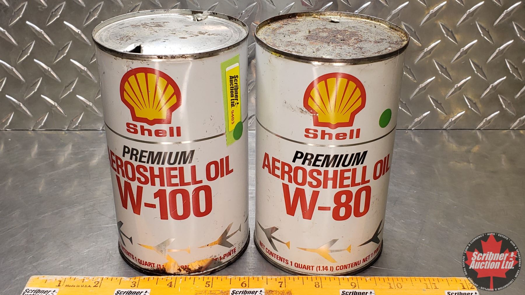 OIL TINS (2) : Shell Premium Aeroshell Oil W-80 & W-100 (6-1/2"H x 4"Dia) (SEE PICS!)