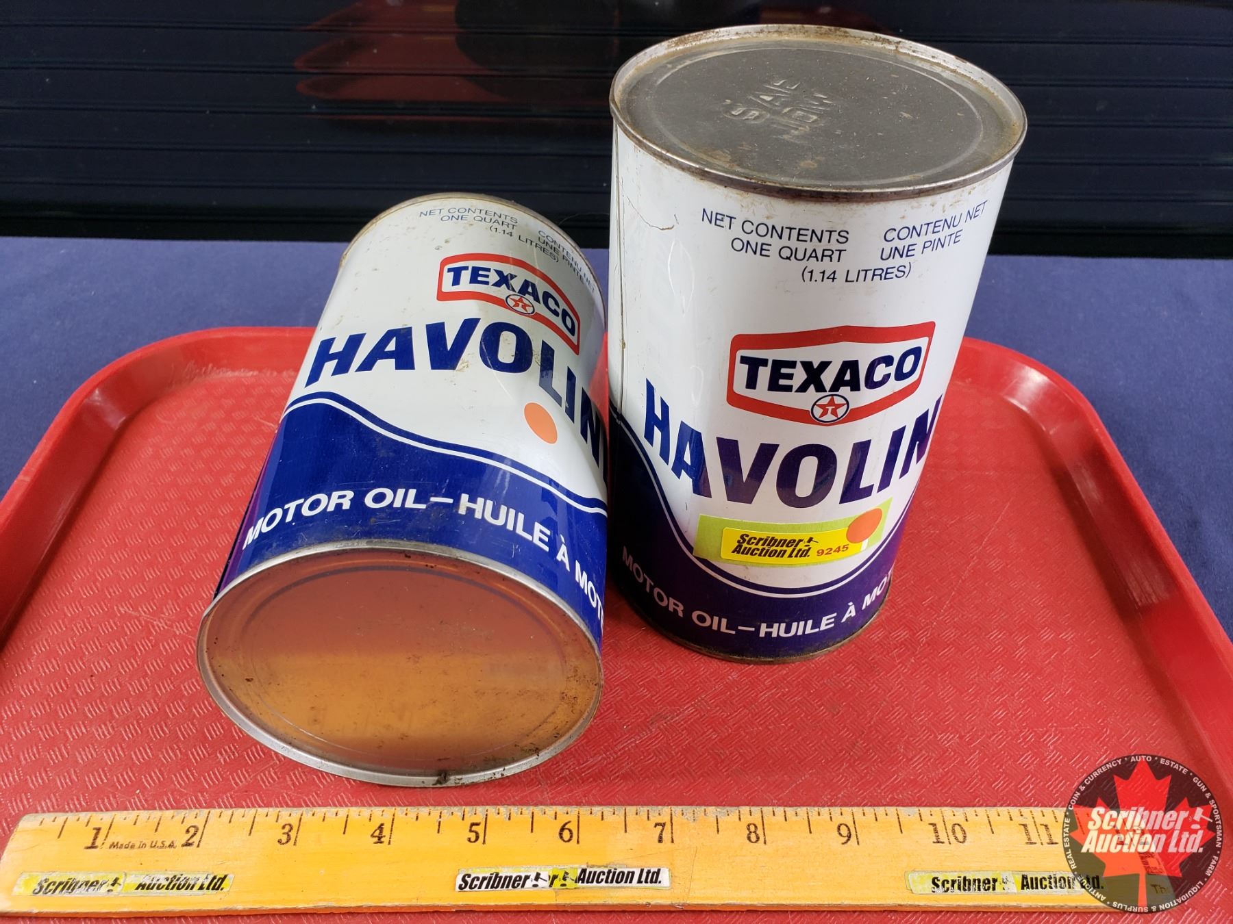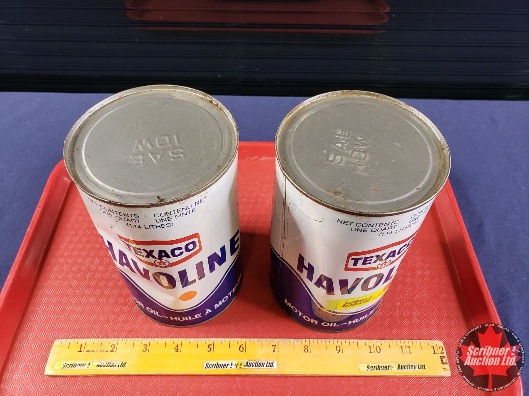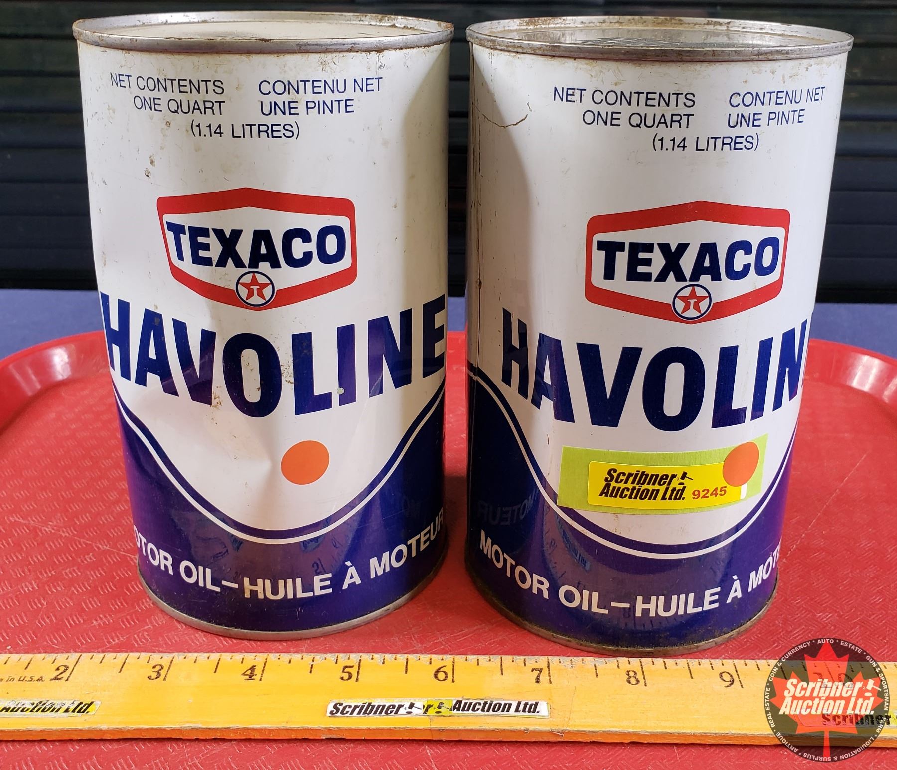 OIL TINS (2): TEXACO HAVOLINE (Both Full) (6-1/2"H x 4"Dia) (SEE PICS!)