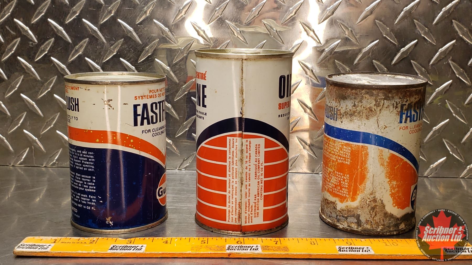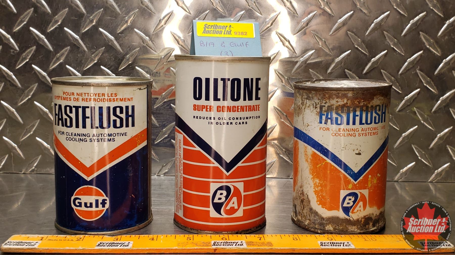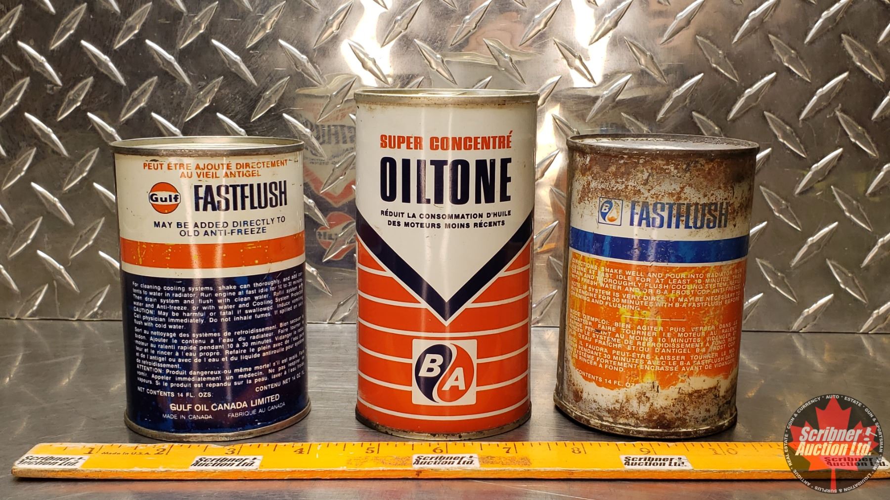 OIL TINS (3) : B/A Oiltone, B/A Fastflush & GULF Fastflush (All Full) ( 5-1/4"H Tallest) (SEE PICS!)