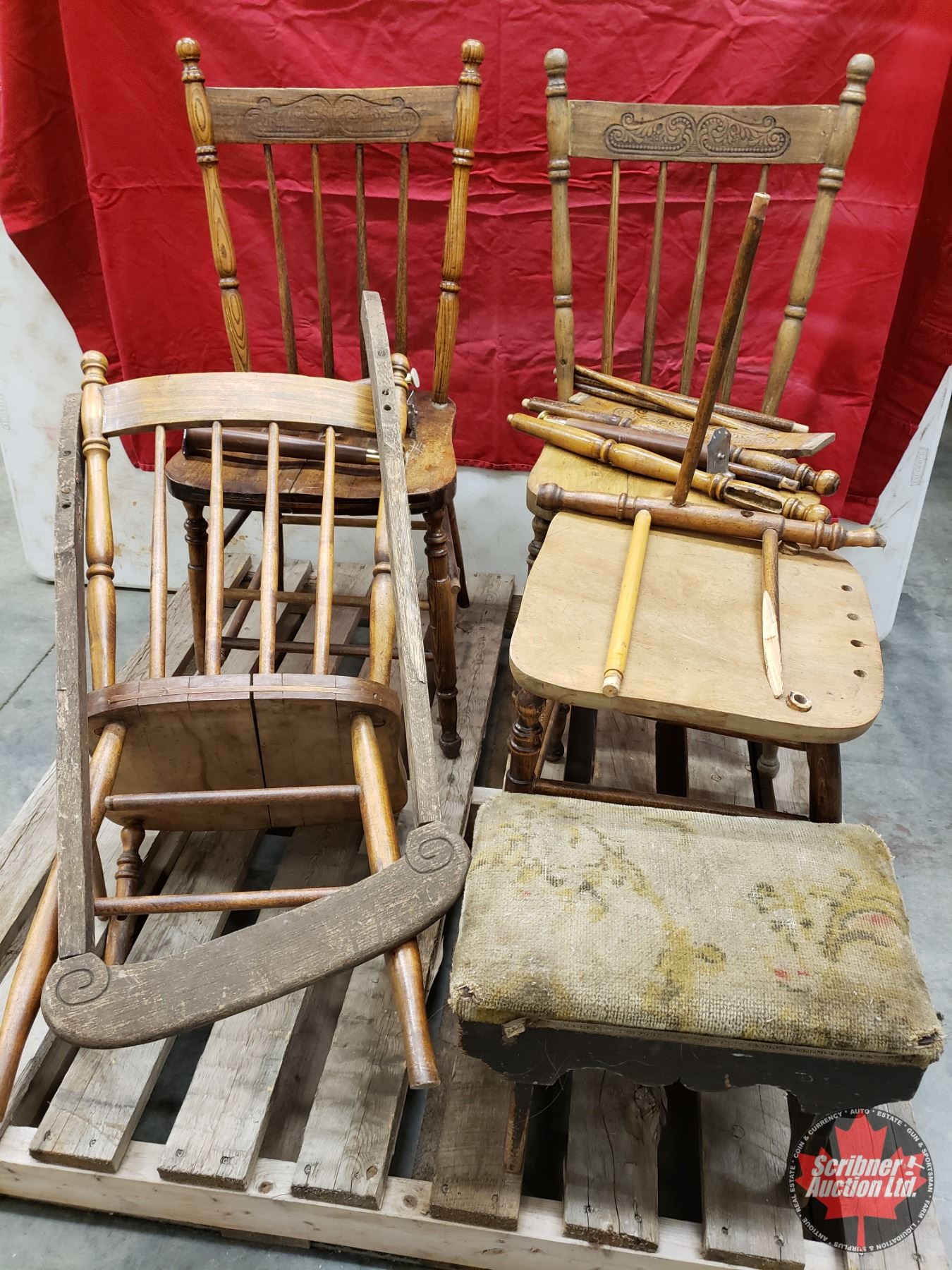 PALLET LOT : Wood Chairs (Project Pieces), Clear Glassware, 3 Bats, Walking Stick, Bin, Crokinole (2