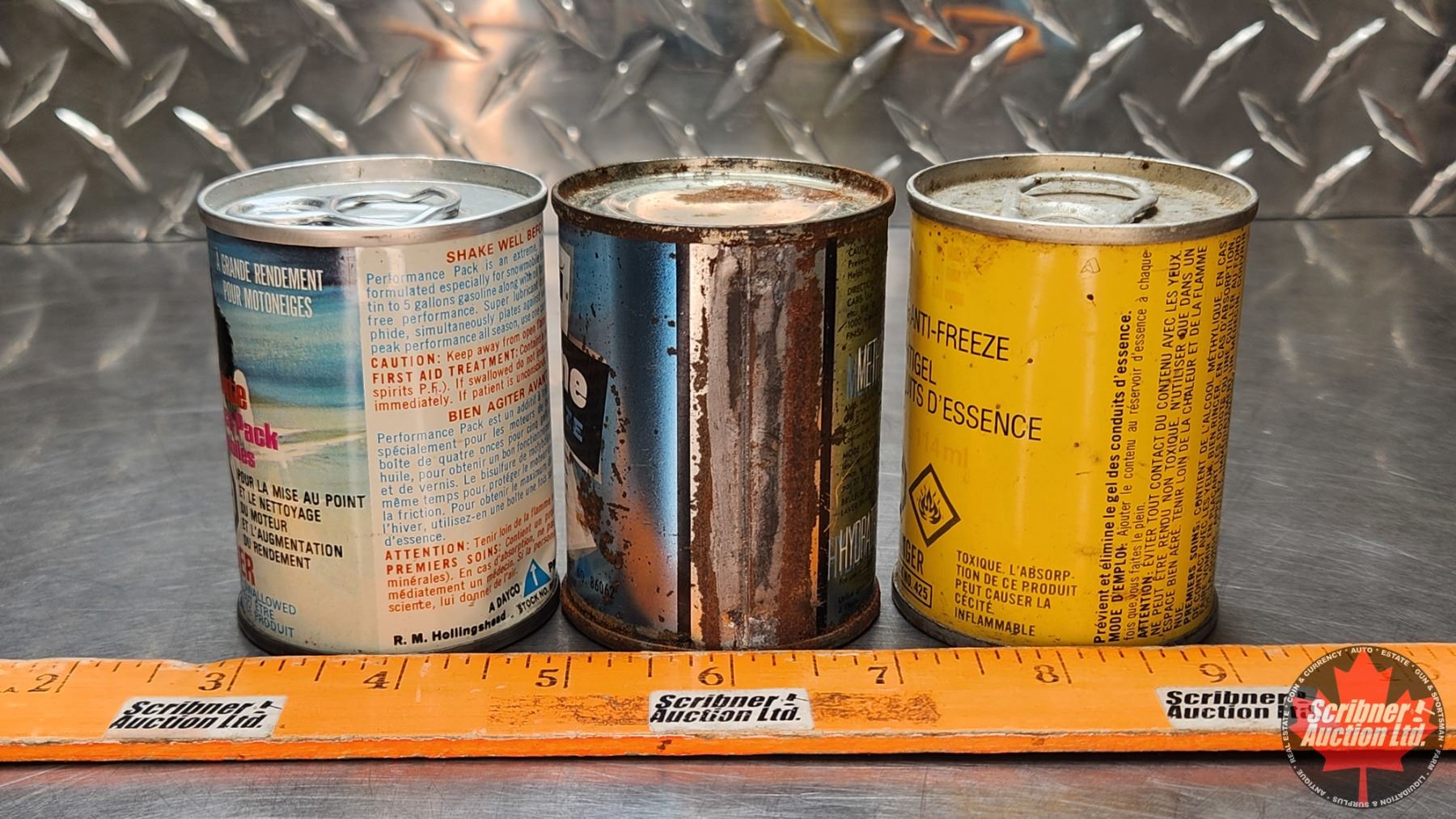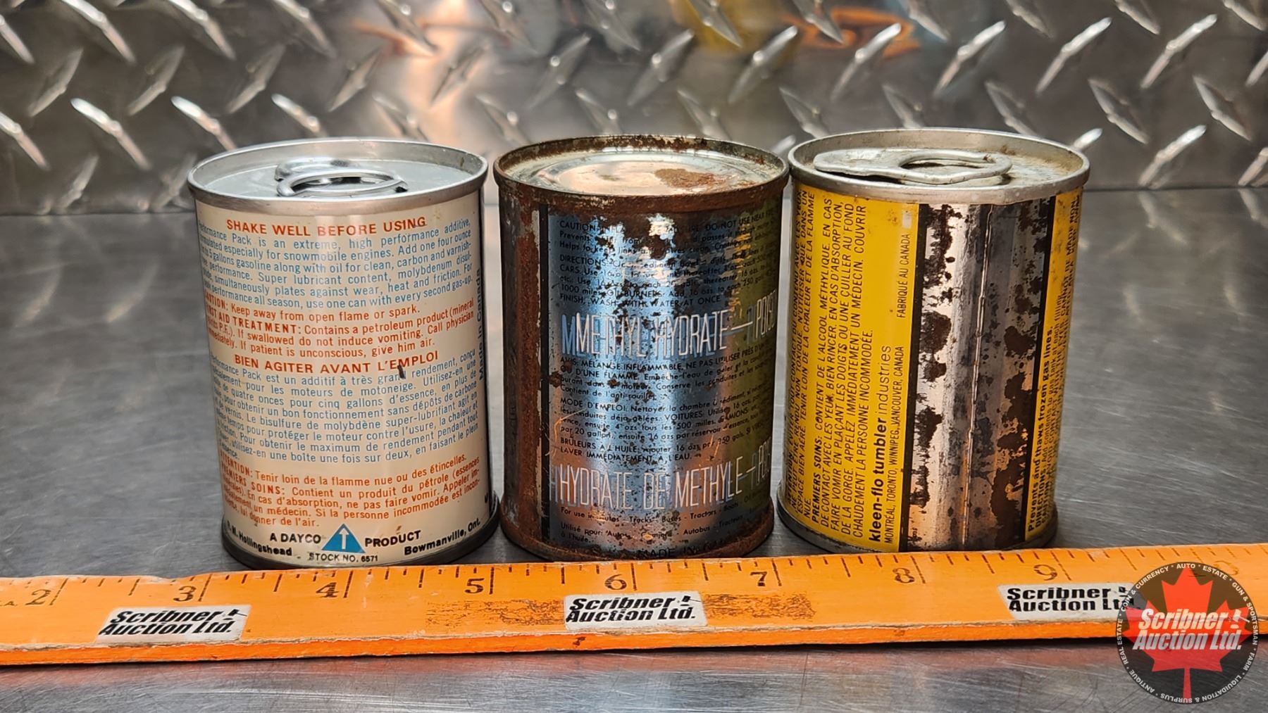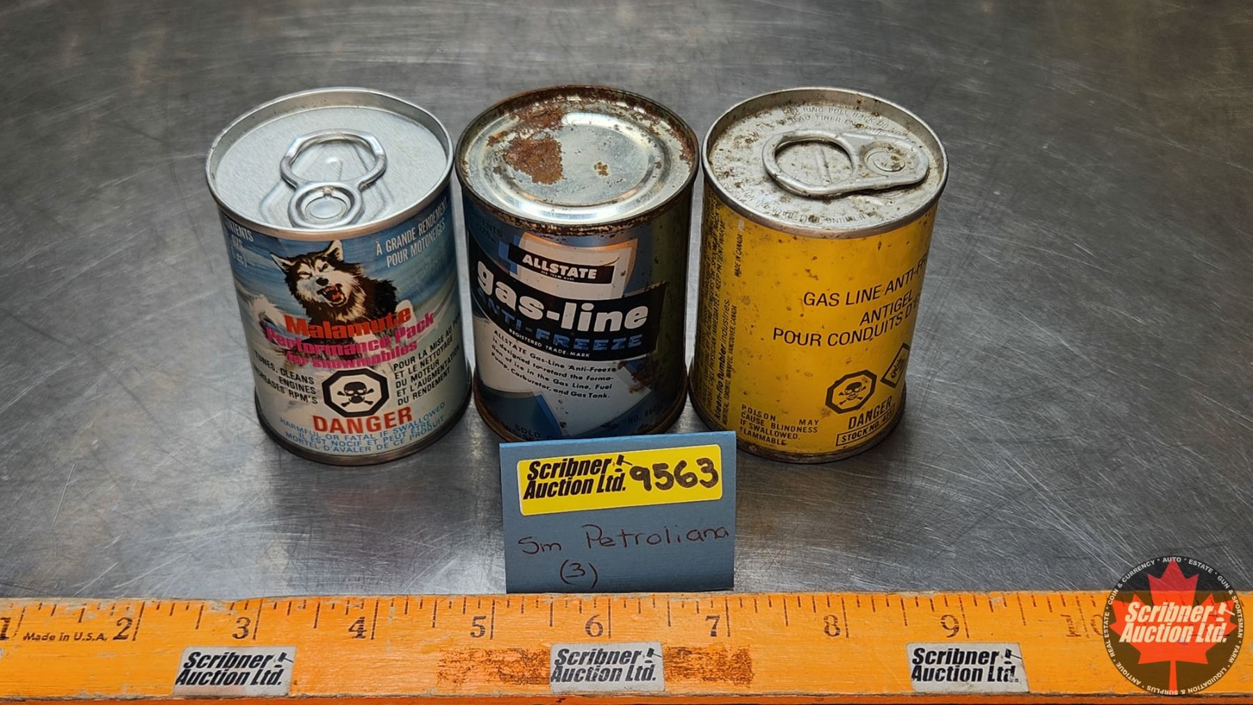 PETROLIANA TIN TRIO (3) : Allstate Gas-Line Anti-Freeze, Malamute Performance Pack for Snowmobiles & Kleen-flo Gas Line Anti-Freeze (3"H x 2-1/4"Dia) (SEE PICS!)