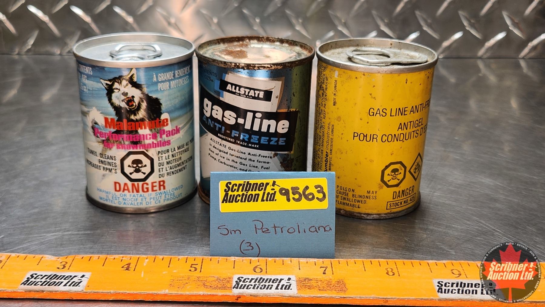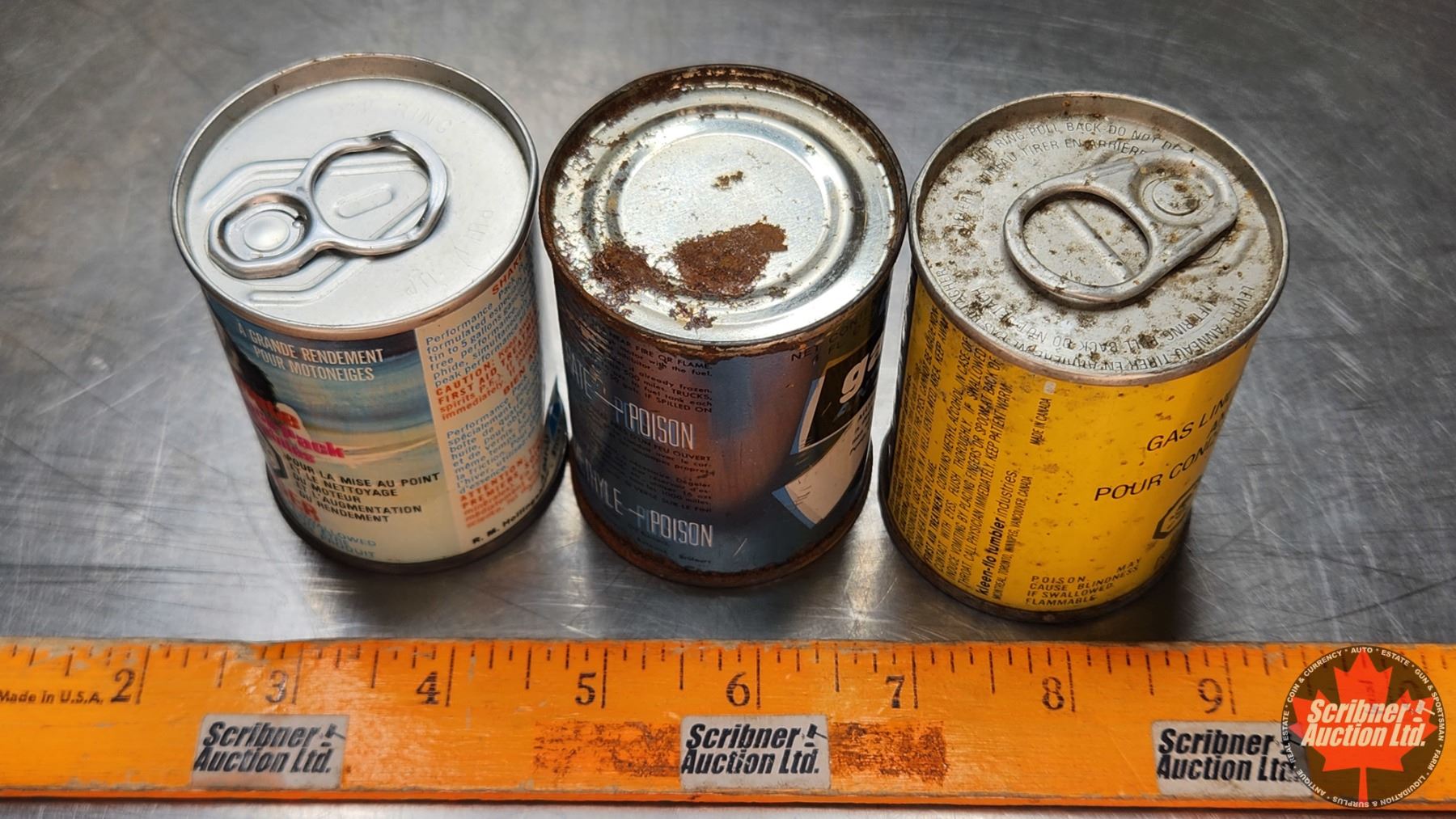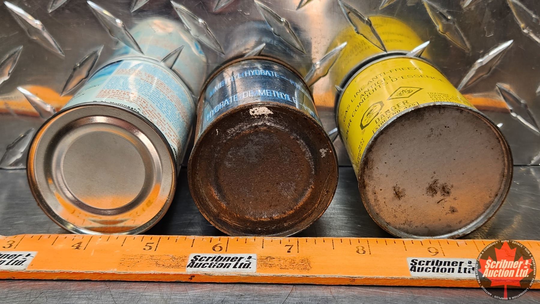 PETROLIANA TIN TRIO (3) : Allstate Gas-Line Anti-Freeze, Malamute Performance Pack for Snowmobiles & Kleen-flo Gas Line Anti-Freeze (3"H x 2-1/4"Dia) (SEE PICS!)