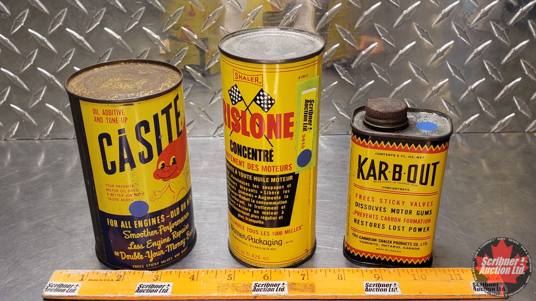 PETROLIANA TIN TRIO : Shaler Rislone, KAR-B-OUT & Casite (All Full) (5-1/2"H Tallest) (SEE PICS!)