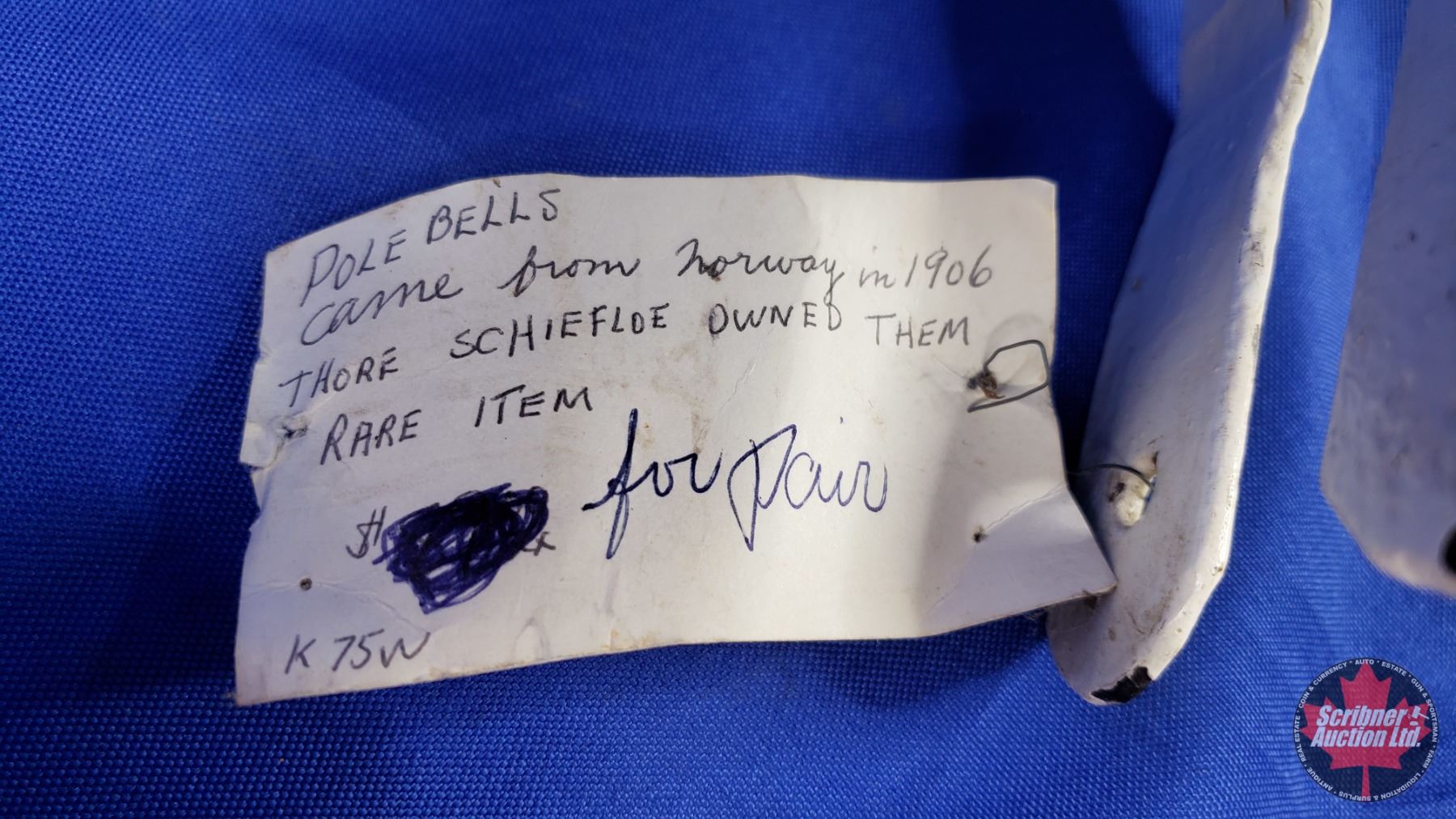 POLE BELLS - Pair (Consignor Note: "Came from Norway in 1906 THORE SCHIEFLOE OWNED THEM" "Rare Item" (Each Measure: 9"H x 13-1/2"W x 3-1/2"D) (SEE PICS!)