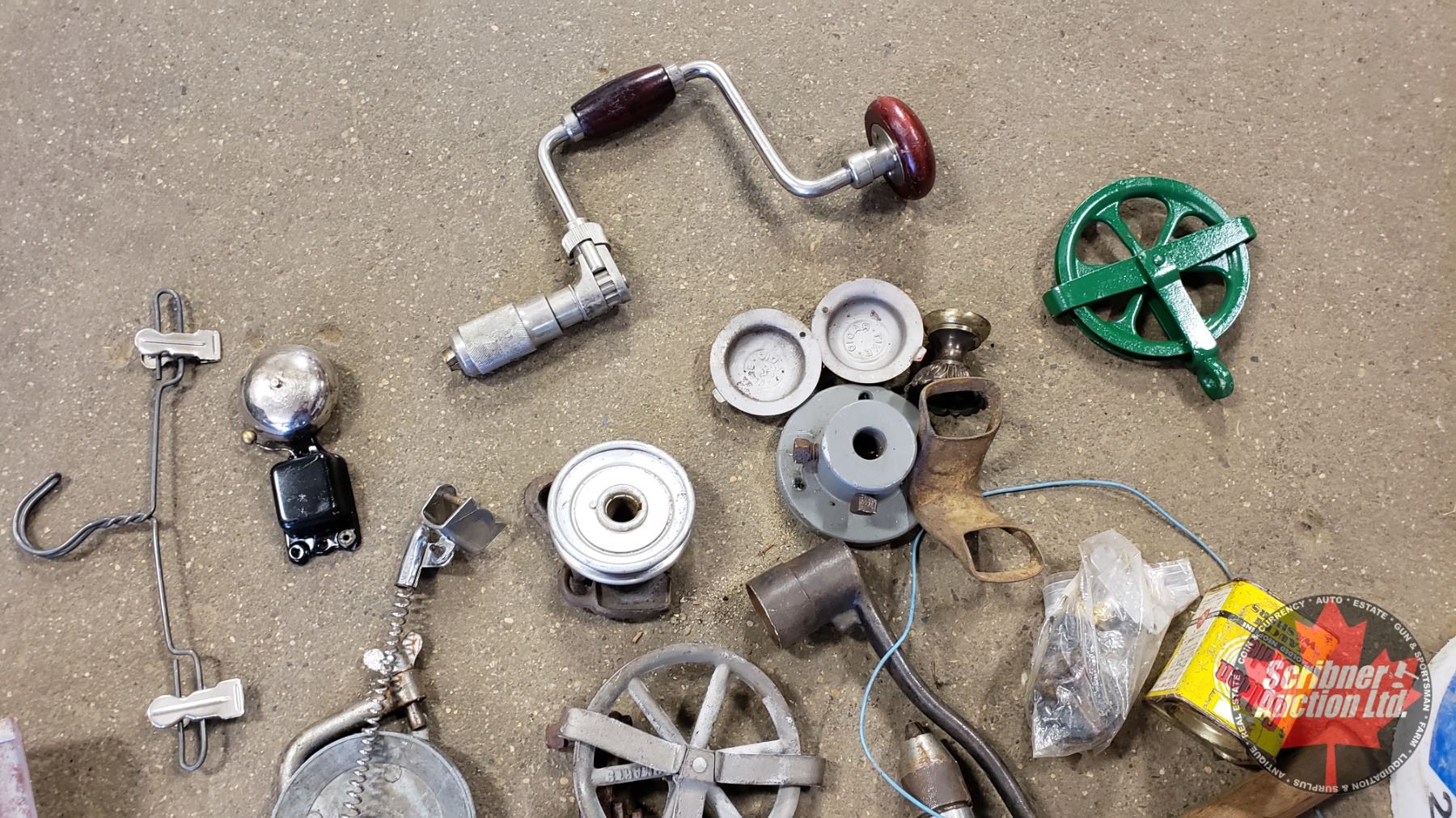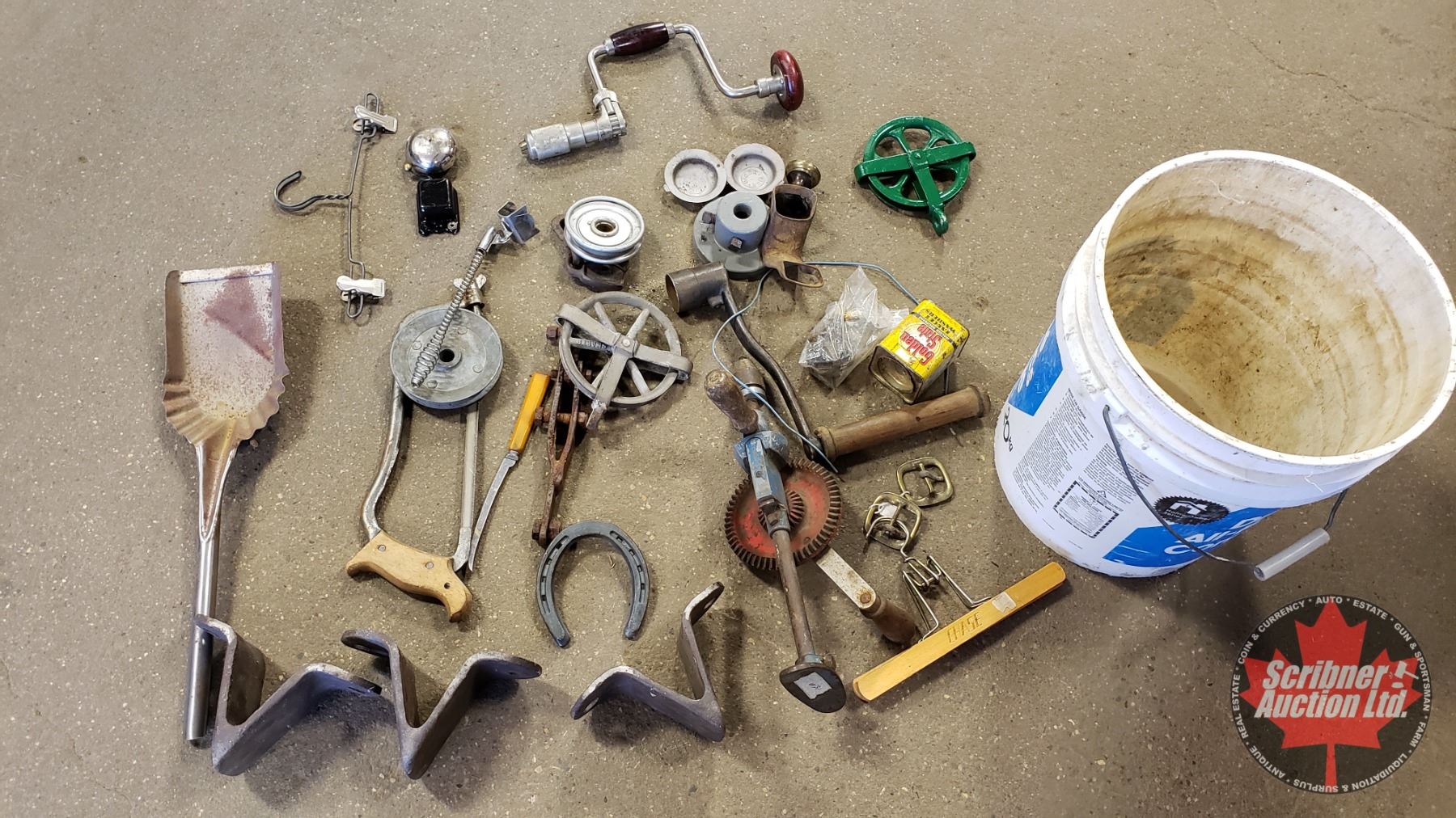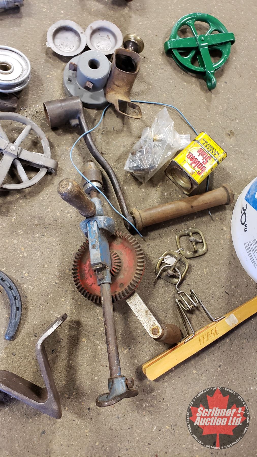 Pail Lot of Tools, Hacksaw, Brace, Clipper, Drill, Pullies, Tractor Lugs, etc (See Pics)