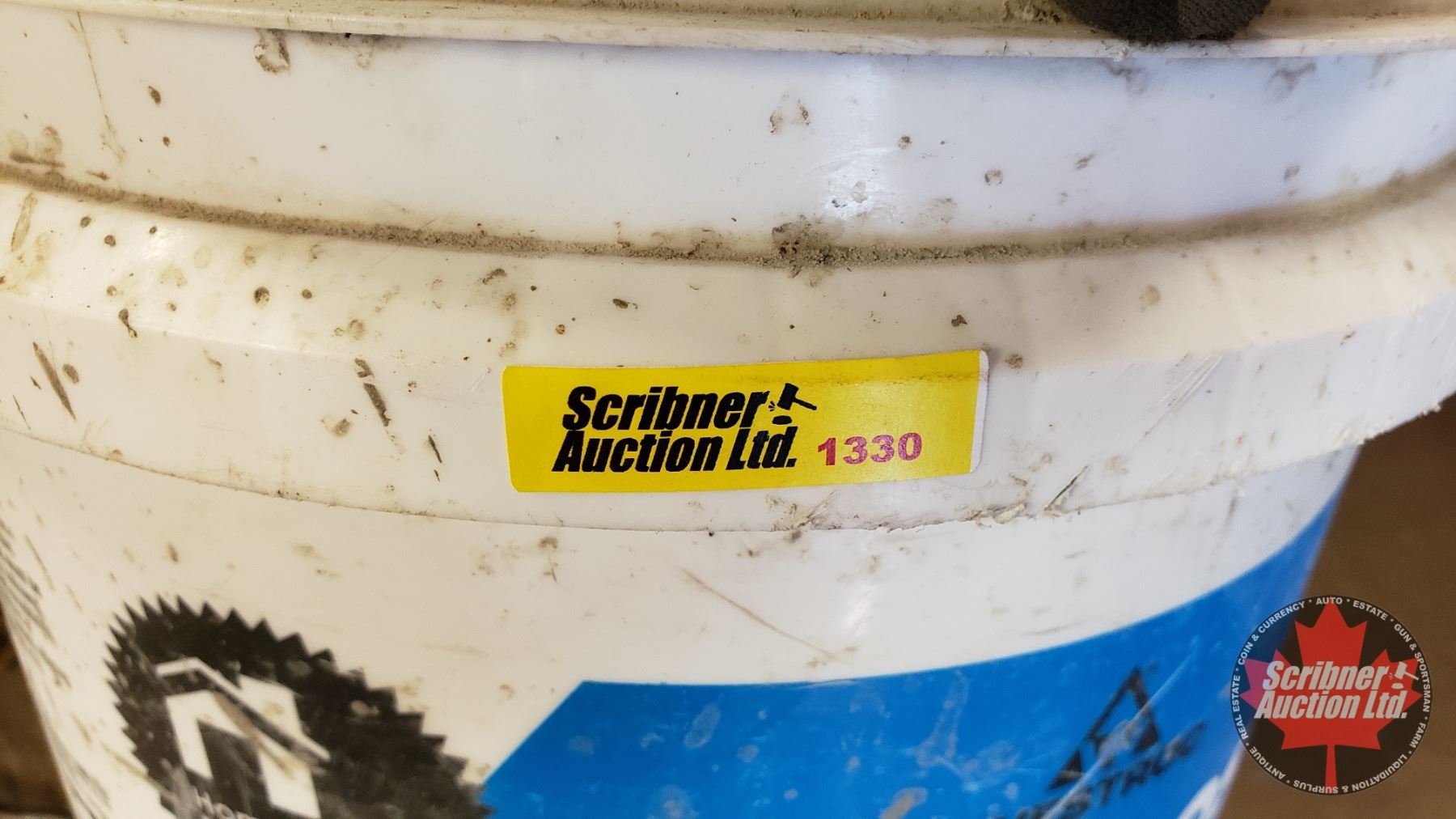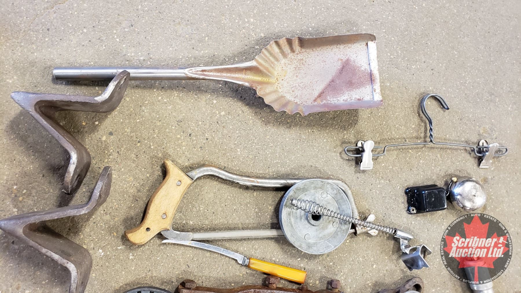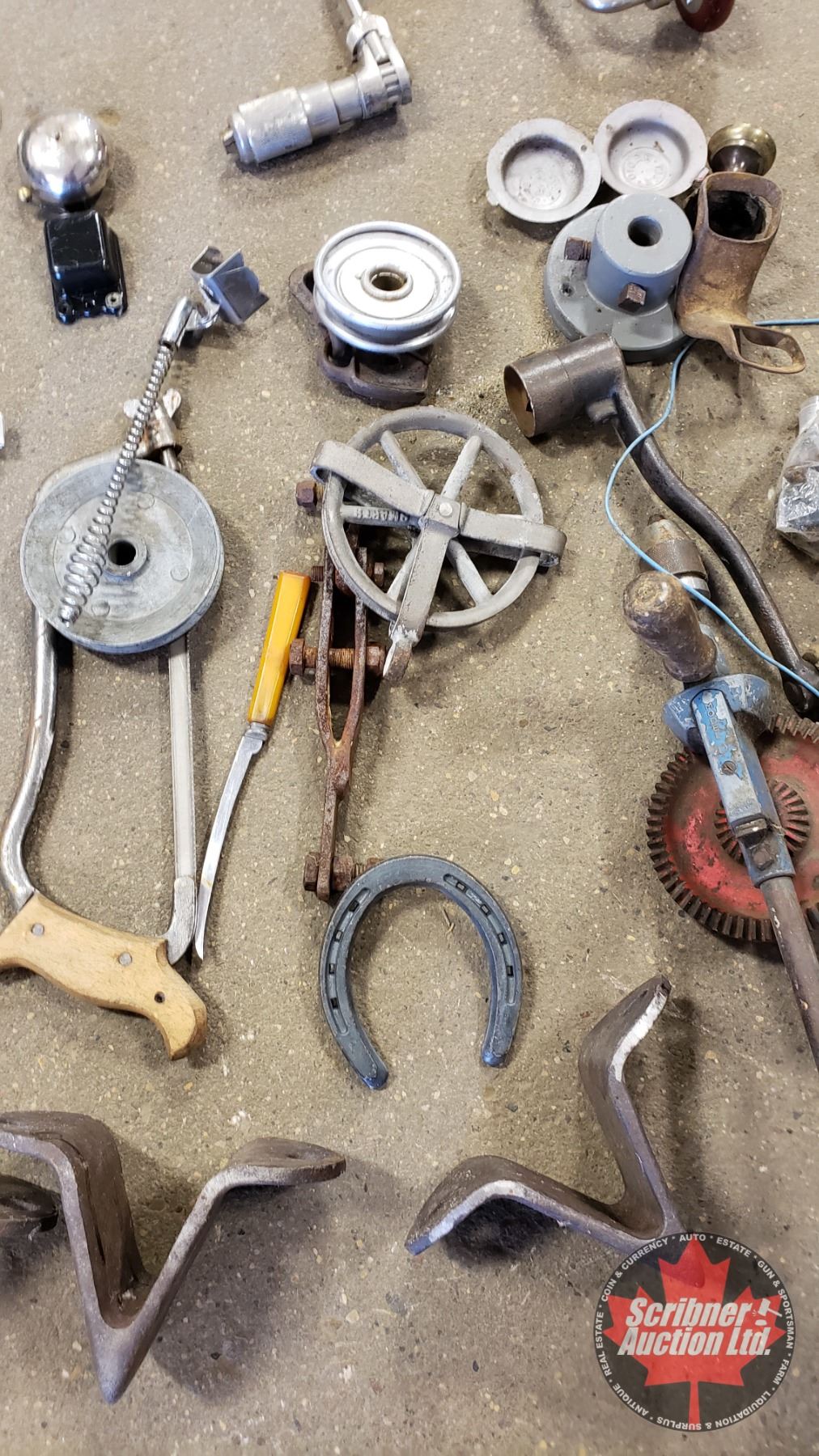 Pail Lot of Tools, Hacksaw, Brace, Clipper, Drill, Pullies, Tractor Lugs, etc (See Pics)