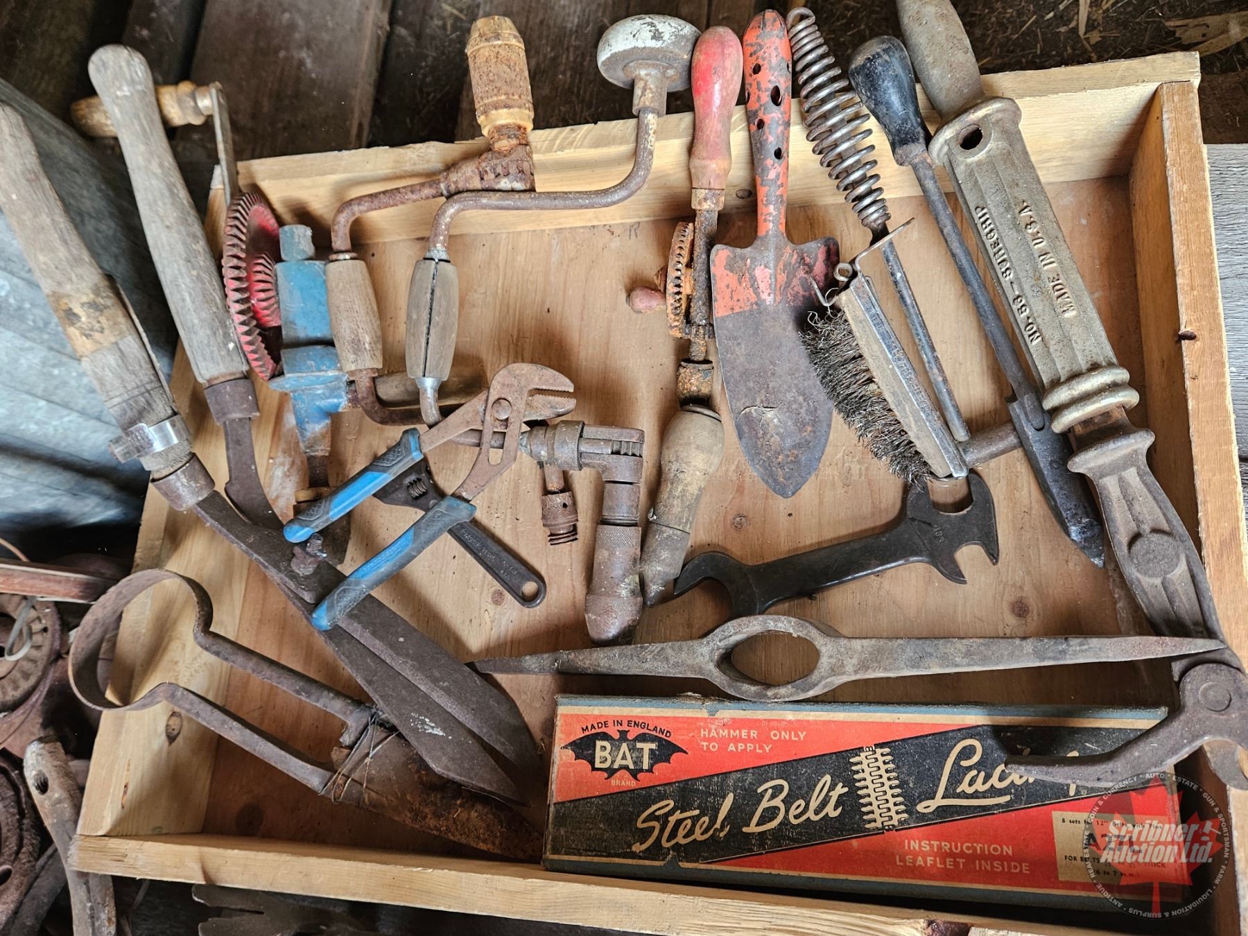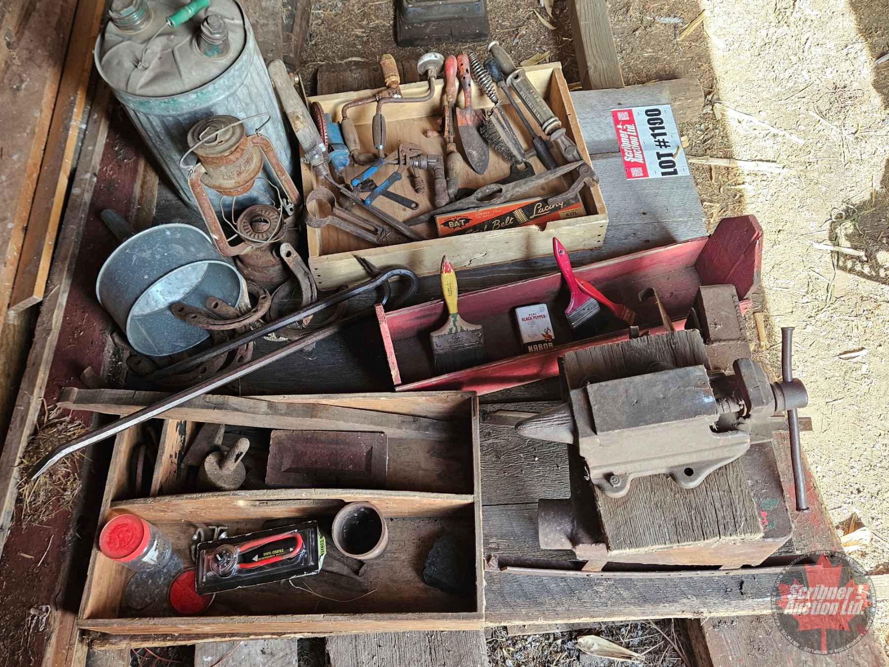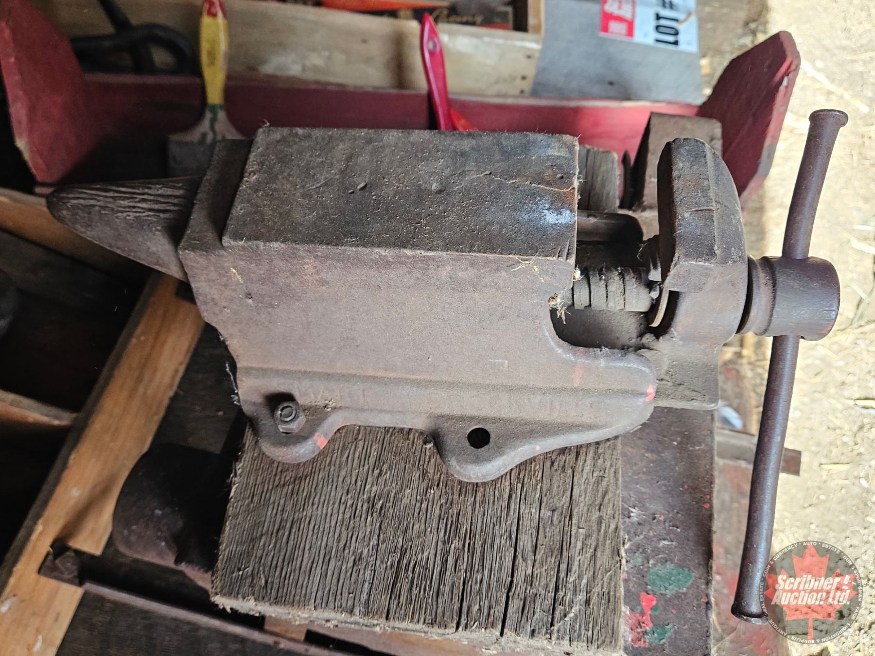 Pallet Lot: Antique Tools, Vise, Gooseneck Bars, etc