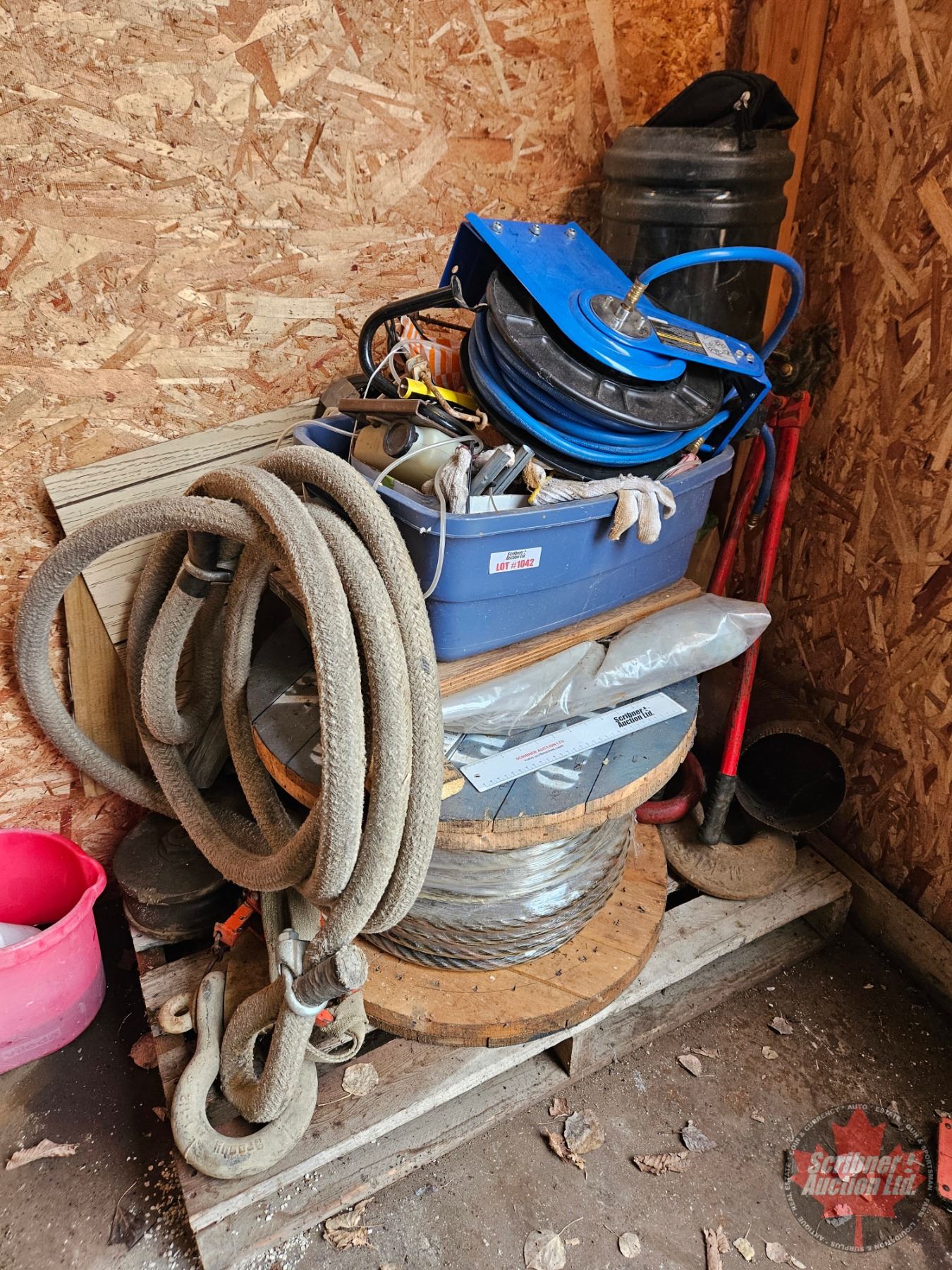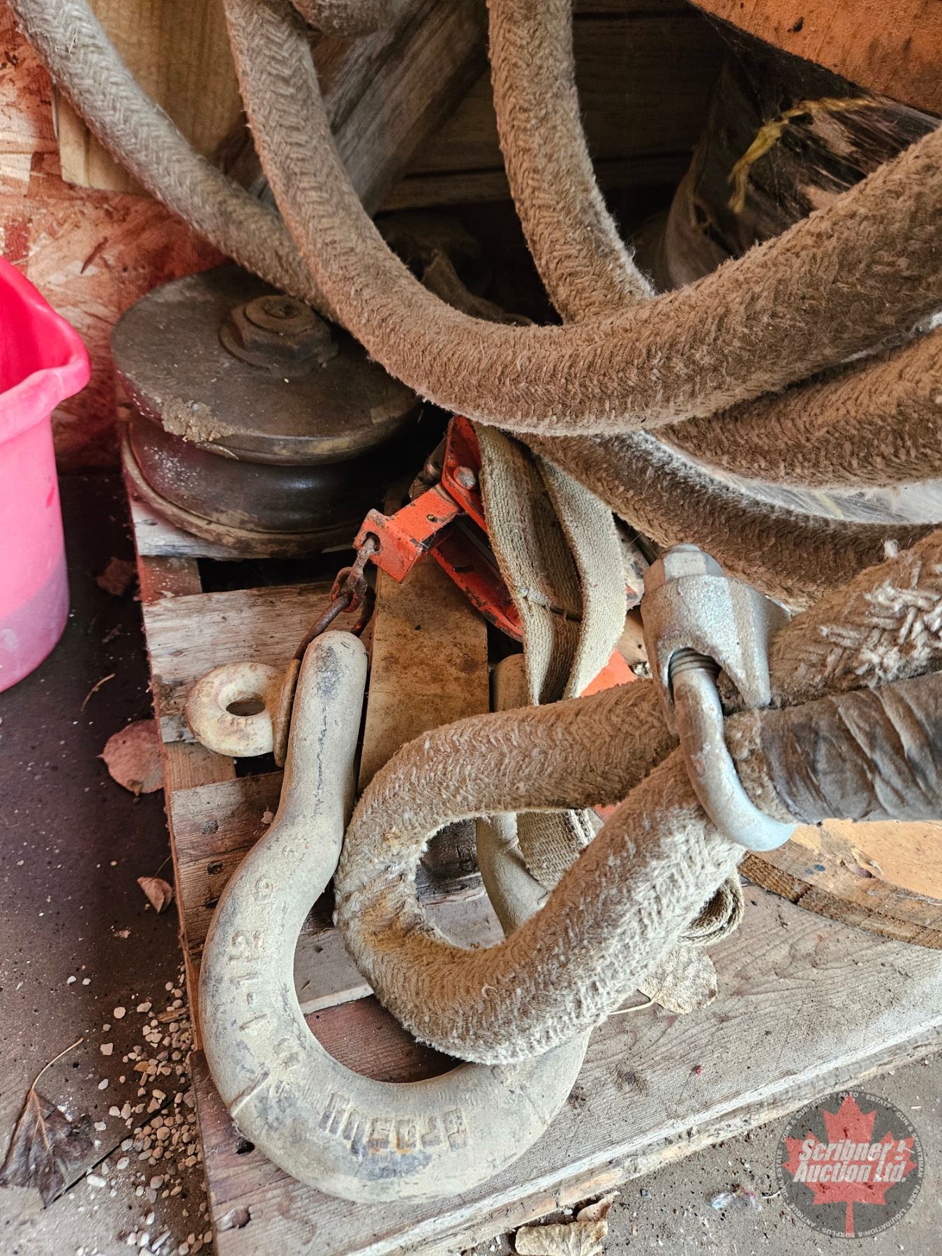 Pallet Lot : Heavy Cable; Sling; Snatch Block; Hose Reel; Tire Chain Tool; etc