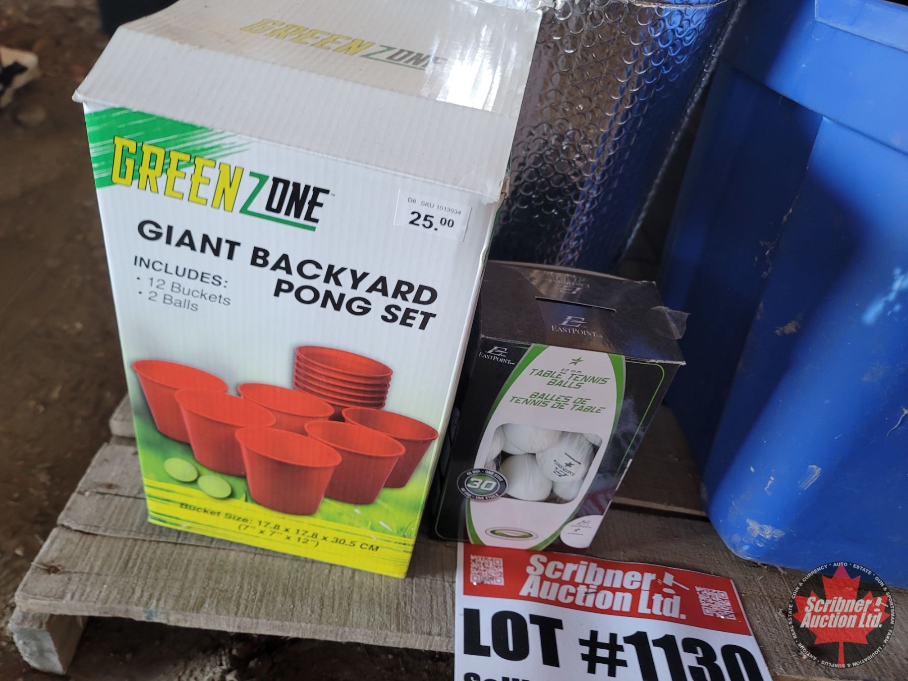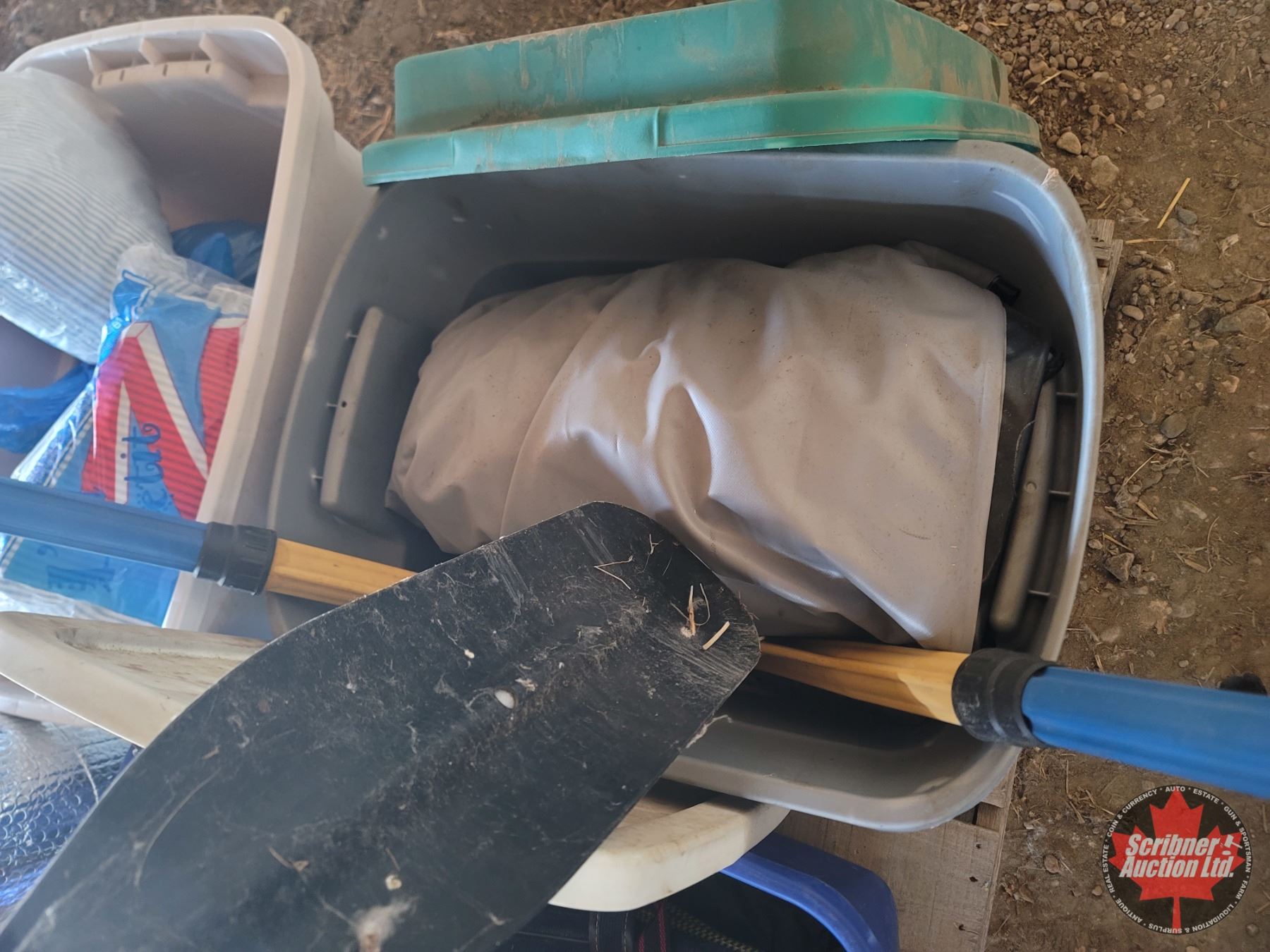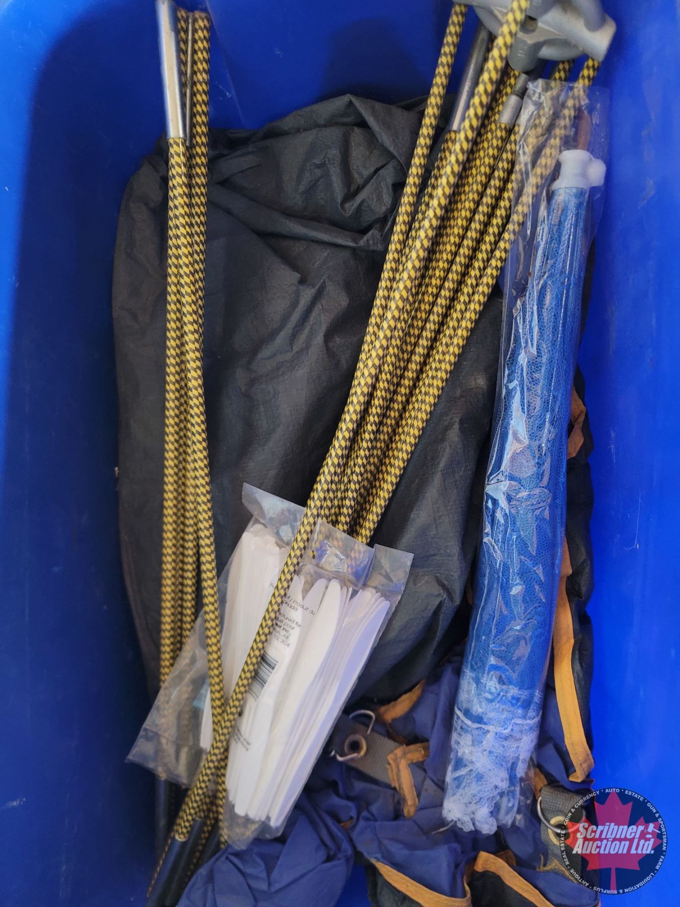 Pallet Lot ~ Variety Camping Group : Four-Man Tent; Inflatable Raft; Unused Sleeping Bag & Pillows; Beer Pong Set; Oars; Bubble Heat Sheild; etc