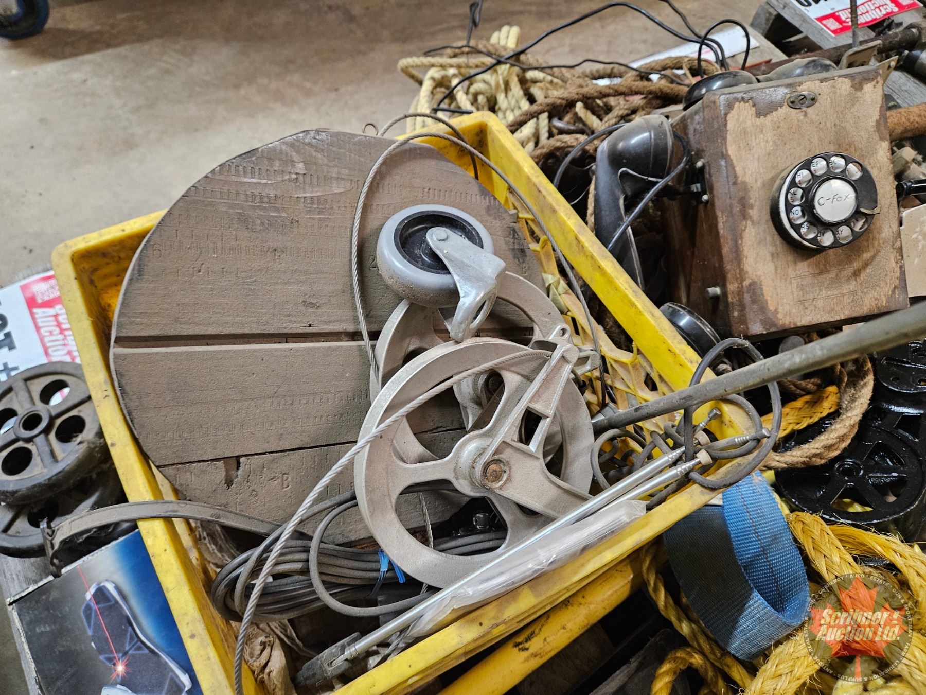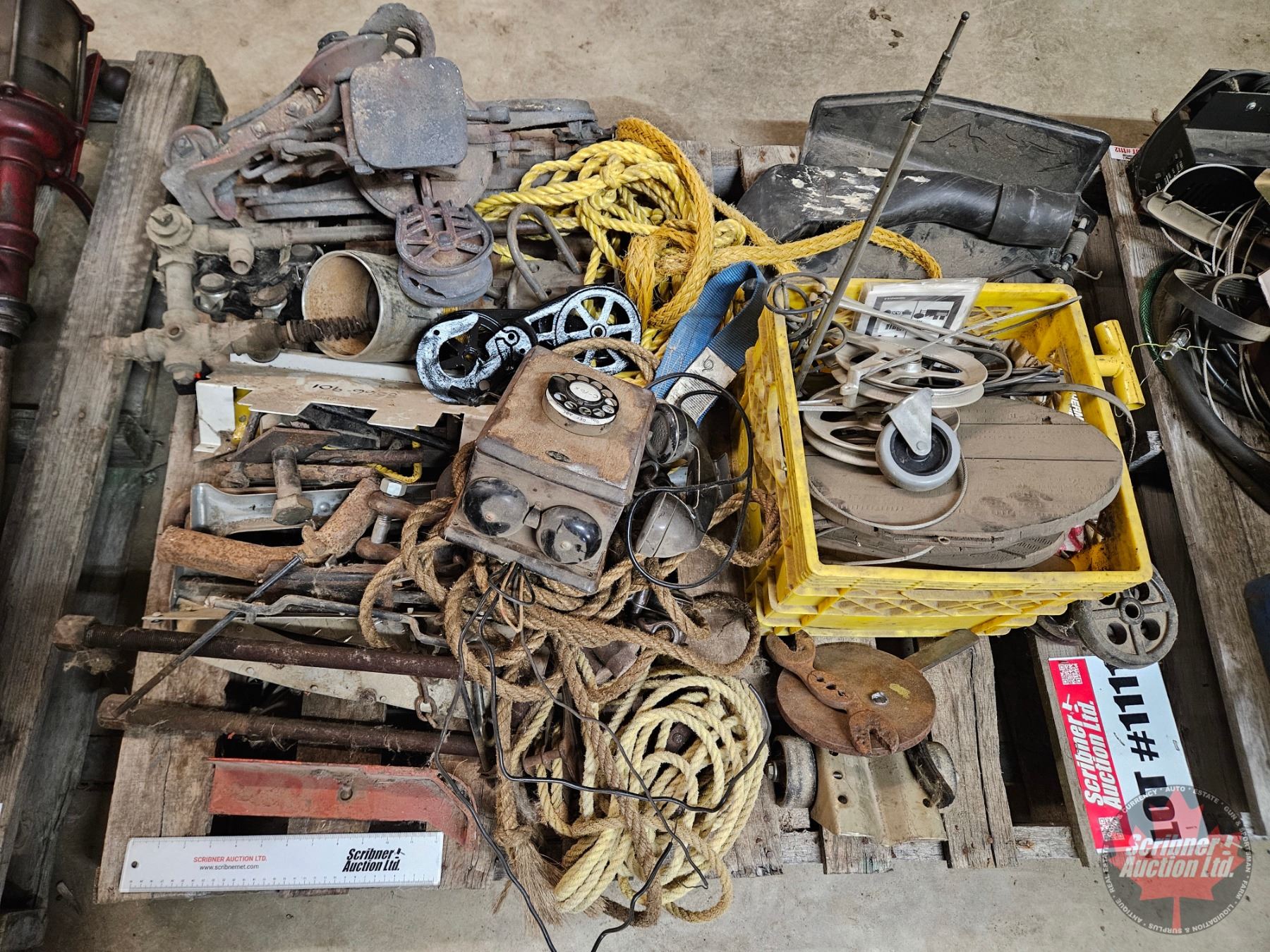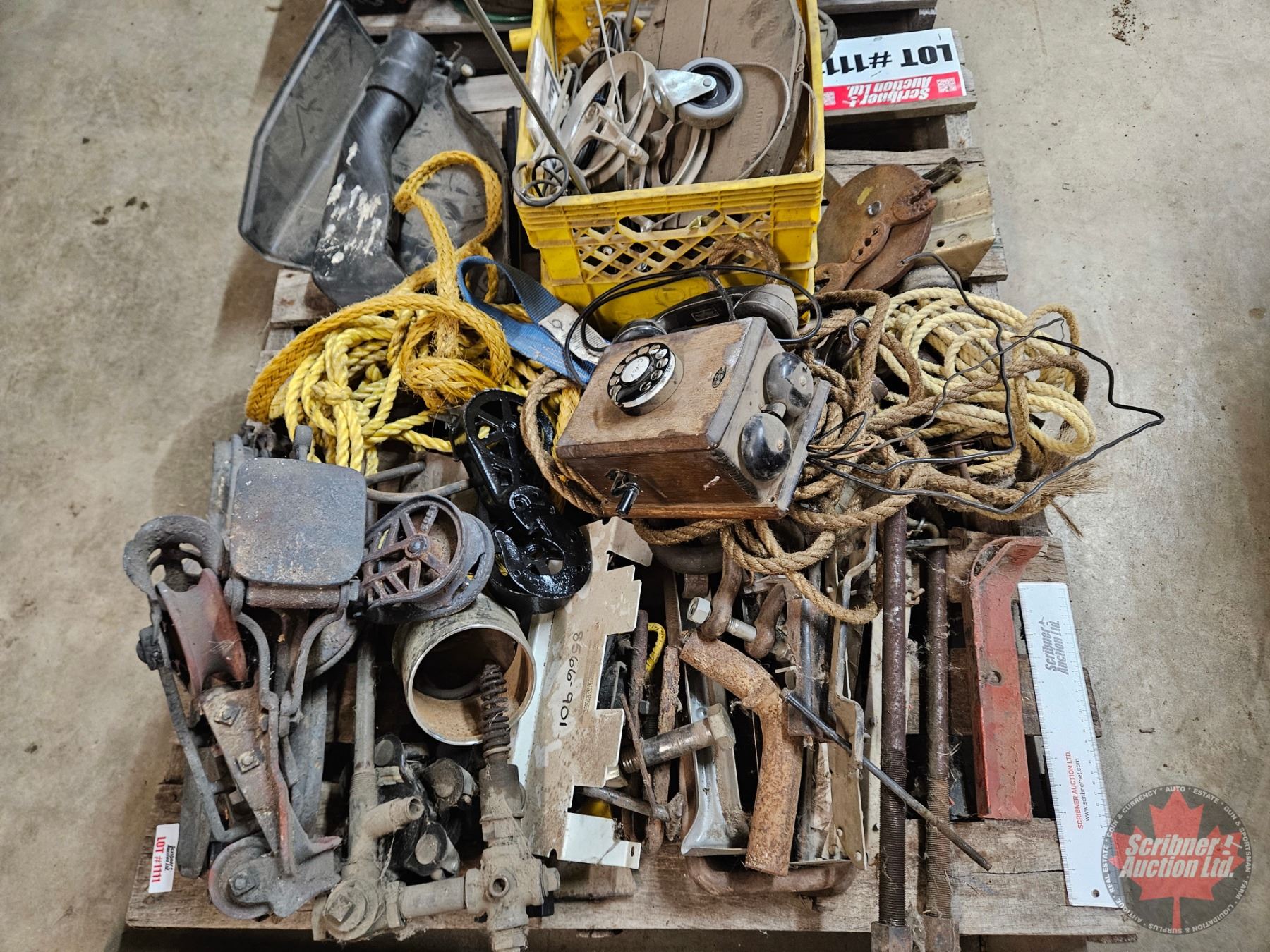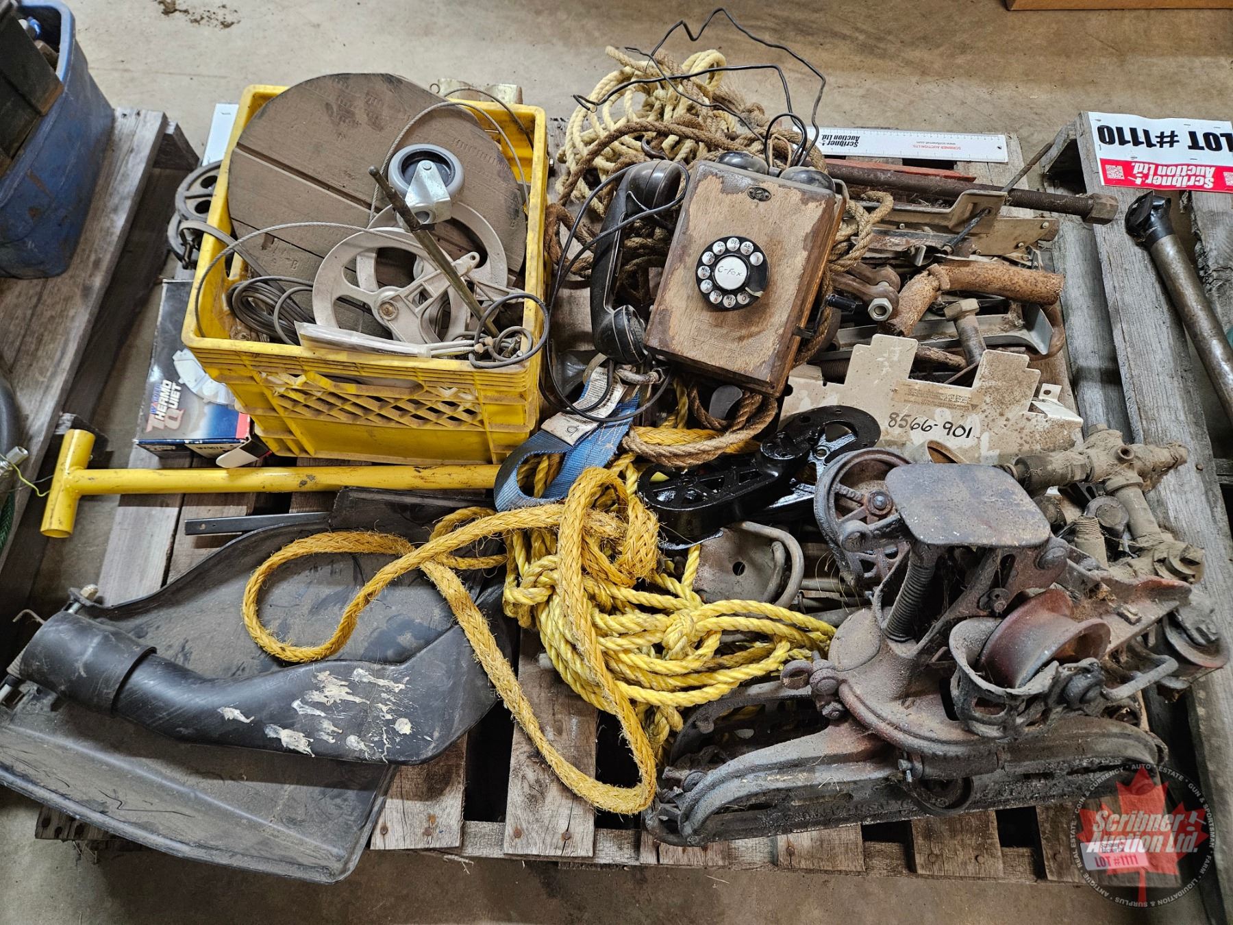 Pallet Lot : Variety of Rustic Antiques ; Pullies & Wheels ; Telephone ; etc