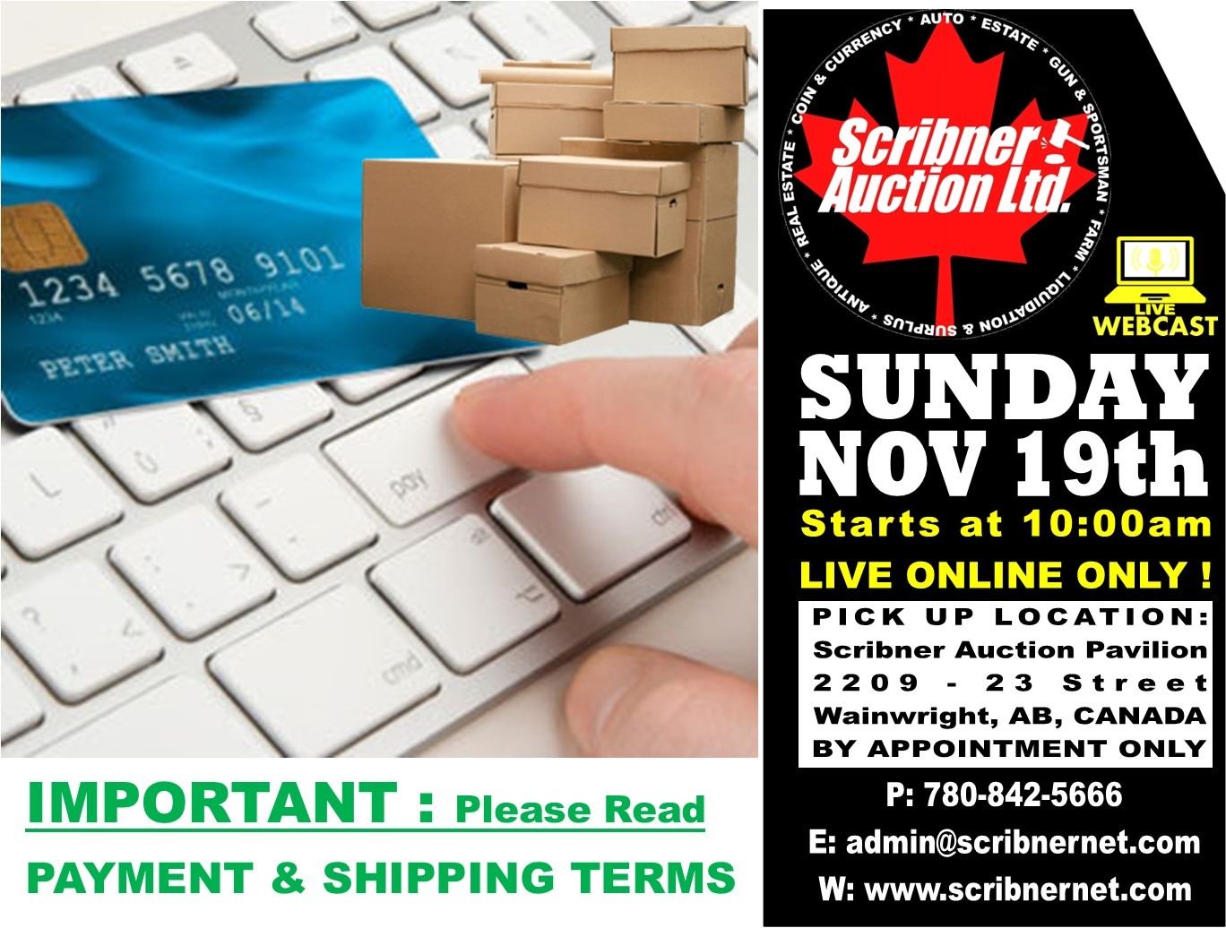 THURSDAY & FRIDAY & SATURDAY & SUNDAY: Purchases will be packaged up after the auction and shipped via Canada Post or PUROLATOR (for dangerous goods) within 12-16 days of the auction sale. Please contact us via email (scribner.auction@gmail.com) or call 780-842-5666 prior to the auction if you wish to arrange alternate shipping. Shipping & Handling Charges will be charged to your credit card at the time of shipping. Most packages shipped via Canada Post come with $100 insurance. Please review Canada Post Terms & Conditions for Canada Post Insurance Policies. Scribner Auction Ltd. will not be responsible for any damage or breakage to any item for any reason (shipping, handling or otherwise). If you wish to arrange for Pick Up at our Wainwright, AB location, please call our office to make an appointment 780-842-5666. You MUST schedule an appointment (NO DROP INS PLEASE!)