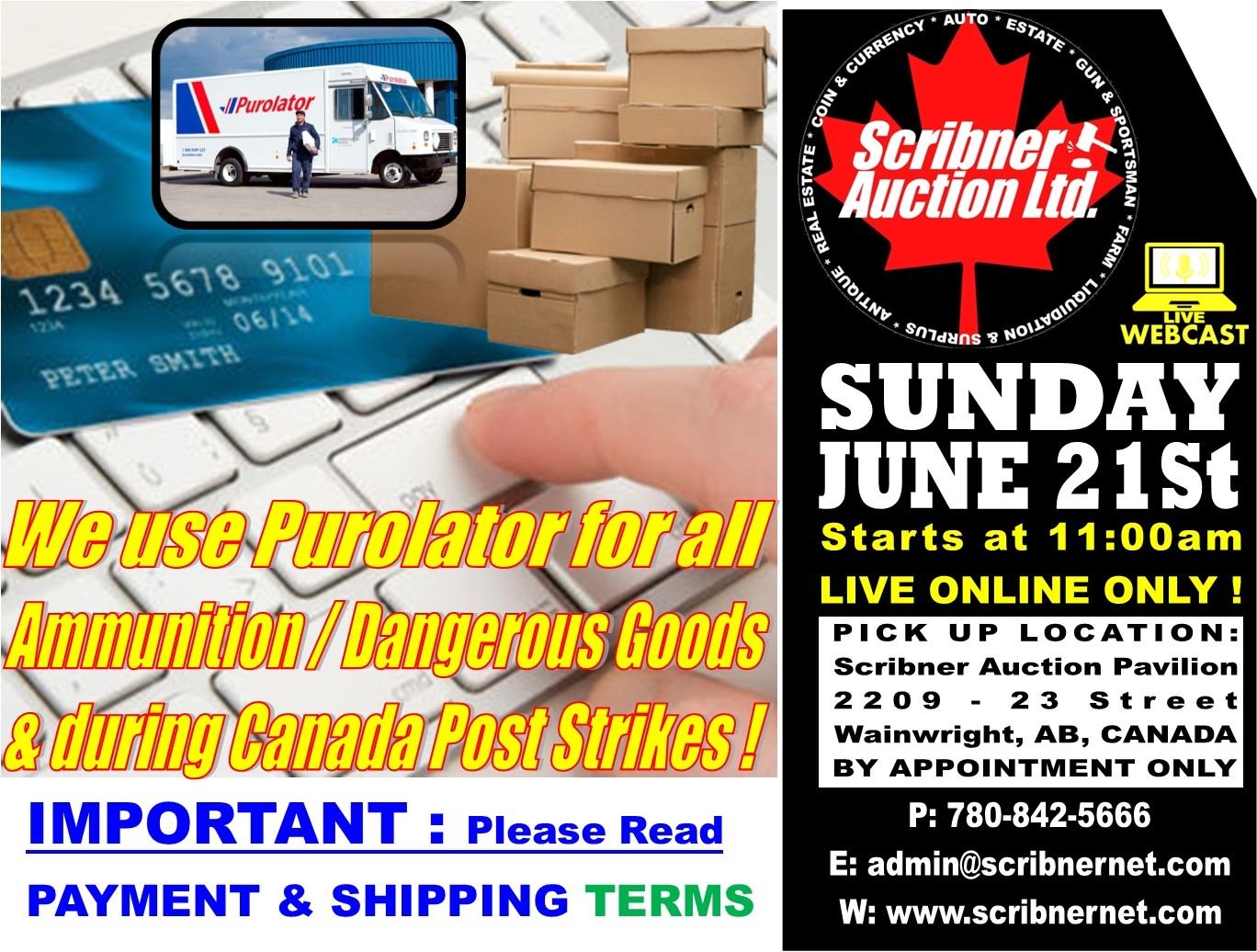 FRIDAY – SATURDAY - SUNDAY : Purchases will be packaged up after the auction and shipped via Canada Post or PUROLATOR (for dangerous goods) within 12-16 days of the auction sale. Please contact us via email (scribner.auction@gmail.com) or call 780-842-5666 prior to the auction if you wish to arrange alternate shipping. IF CANADA POST IS ON STRIKE, WE AUTOMATICALLY USE PUROLATOR! Shipping & Handling Charges will be charged to your credit card at the time of shipping. Most packages shipped via Canada Post come with $100 insurance. Please review Canada Post Terms & Conditions for Canada Post Insurance Policies. If you want EXTRA Insurance from the carrier, you must instruct our office to purchase additional insurance! Scribner Auction Ltd. will not be responsible for any damage or breakage to any item for any reason (shipping, handling or otherwise). If you wish to arrange for Pick Up at our Wainwright, AB location, please call our office to make an appointment 780-842-5666. You MUST schedule an appointment (NO DROP INS PLEASE!)