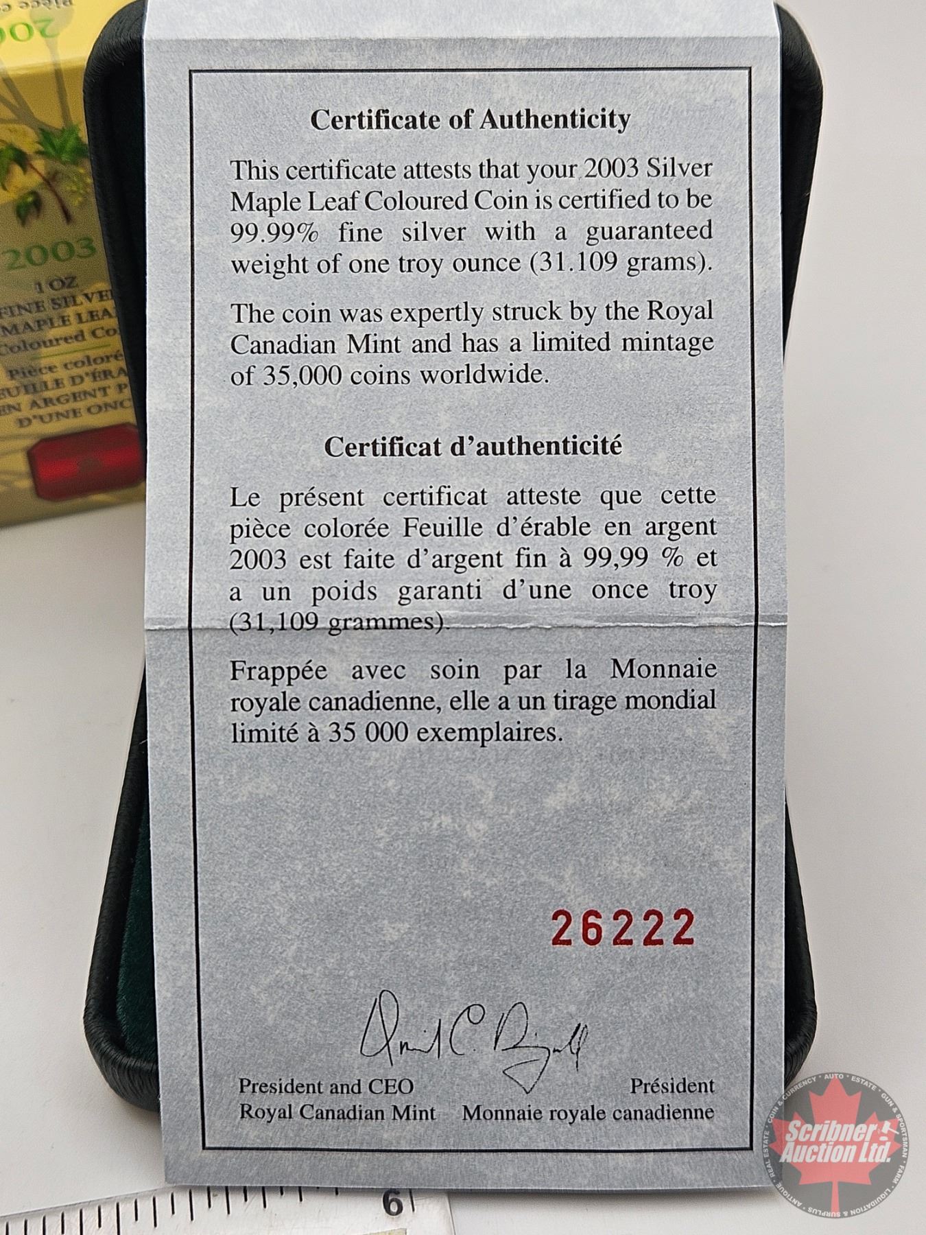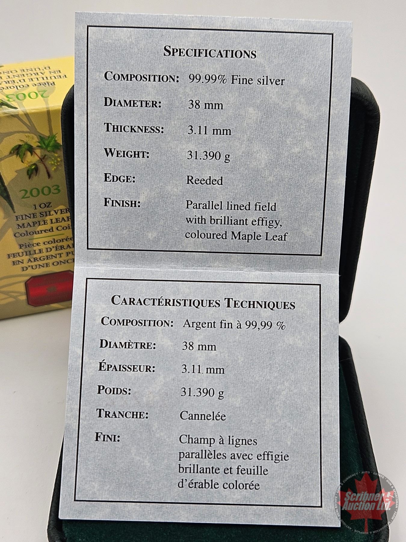RCM Canada 2003 : 1oz Fine Silver Maple Leaf Coloured Coin (COA #26222) (99.99%) (GST Exempt)
