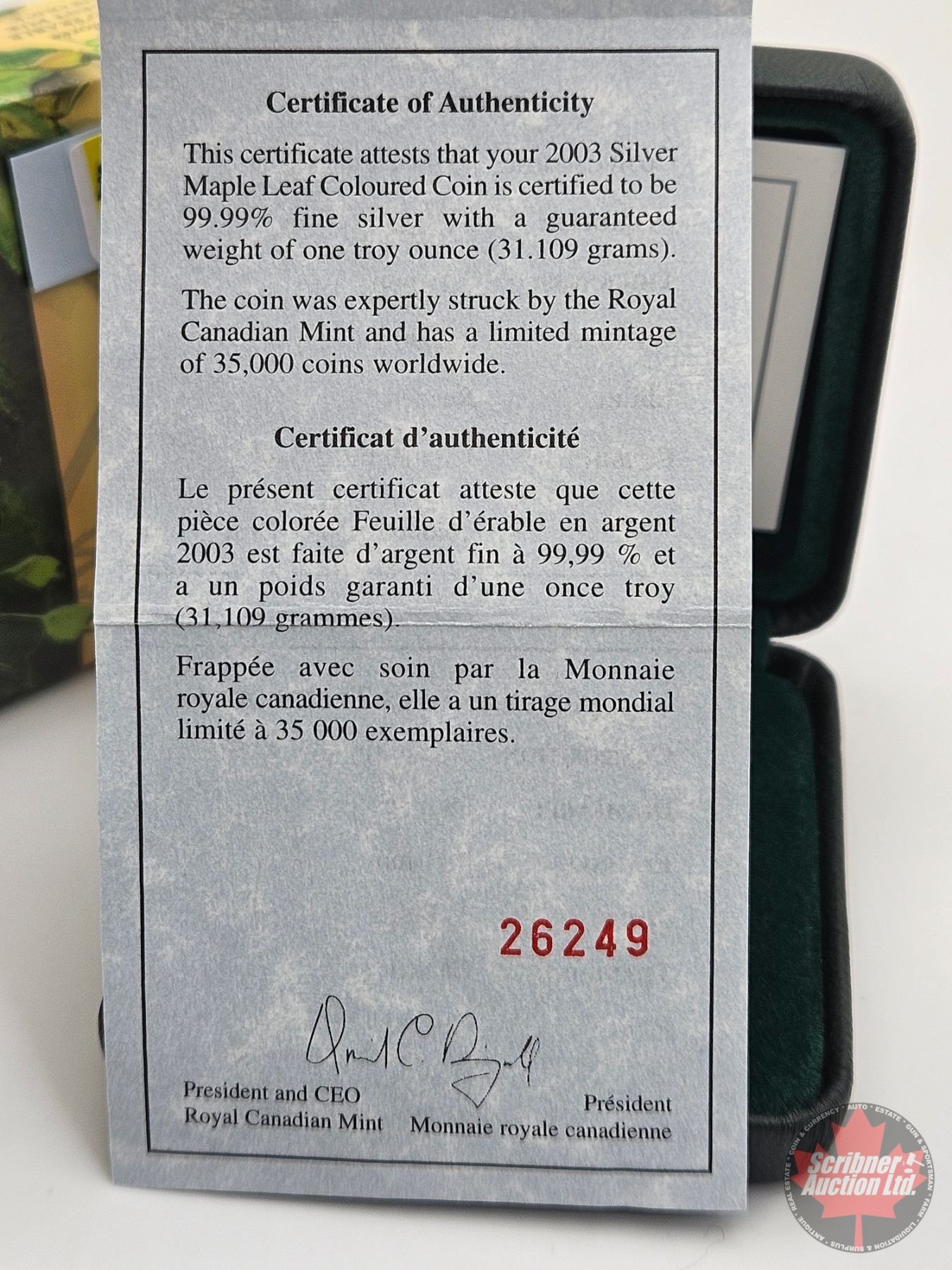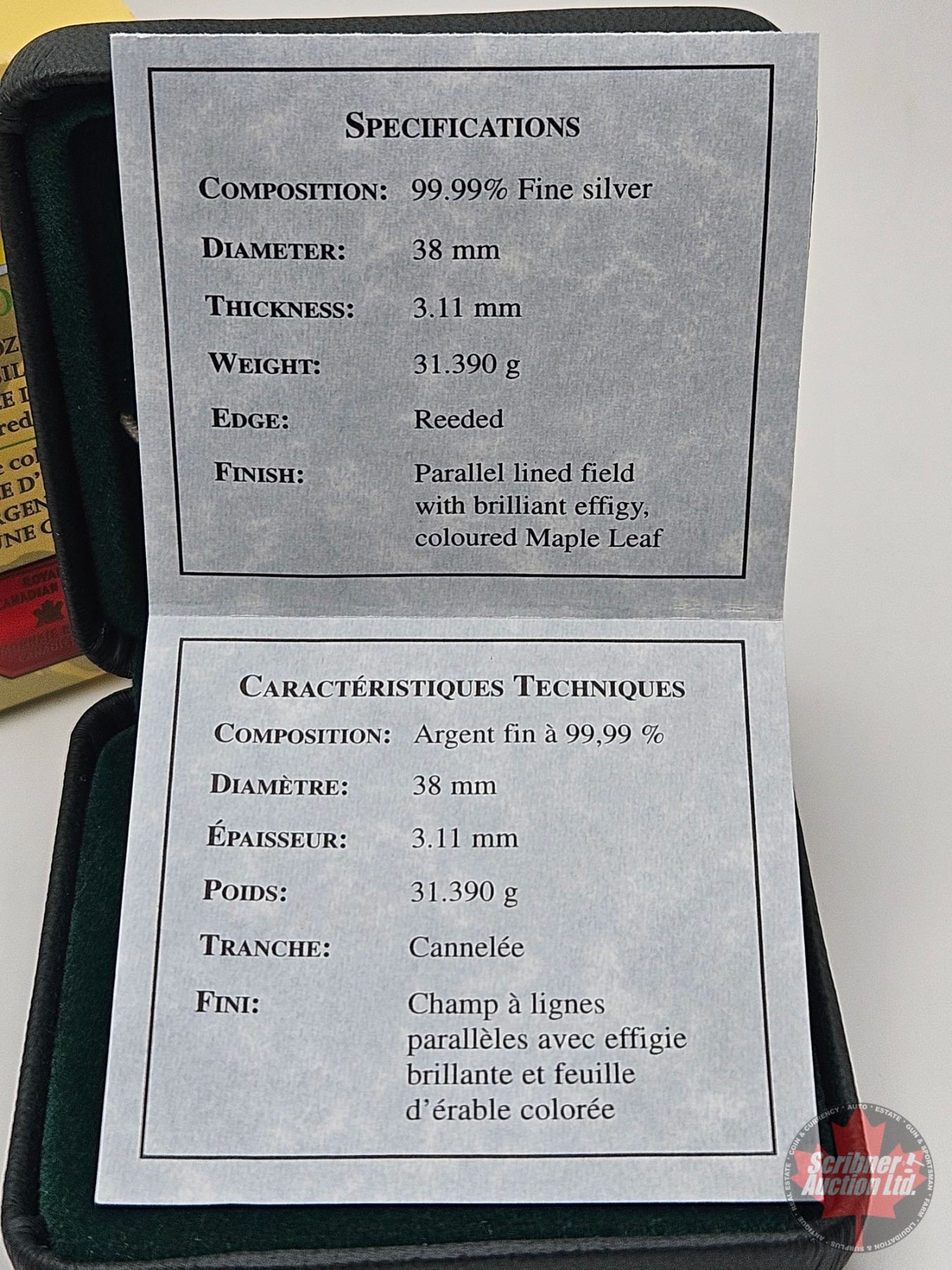 RCM Canada 2003 : 1oz Fine Silver Maple Leaf Coloured Coin (COA #26249) (99.99%) (SEE PICTURES!) (GST Exempt)