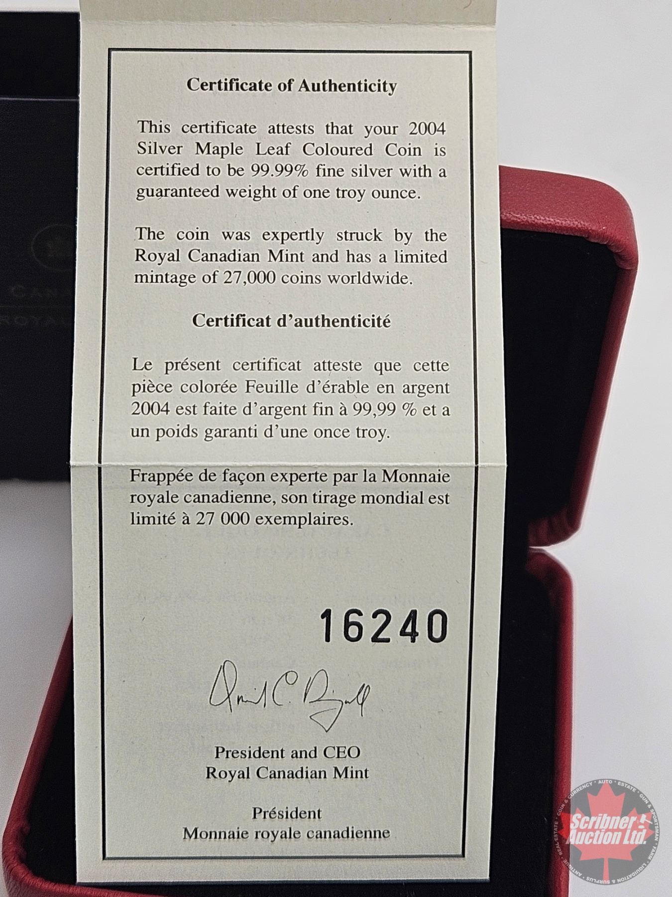 RCM Canada 2004 Silver Maple Leaf Coloured Five Dollar 1oz Fine Silver Coin (COA #16240)