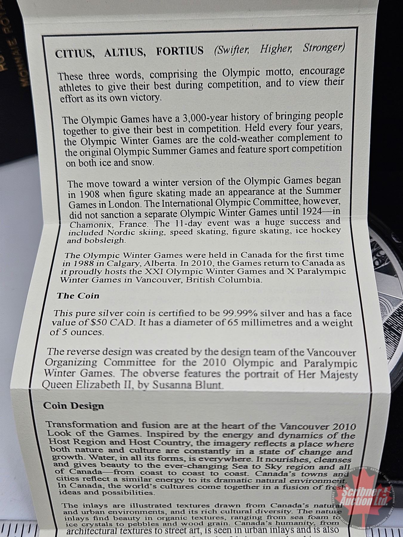 RCM Canada 2010 : $50 Silver Coin : Olympic Winter Games : The Look of the Games (COA #1040)