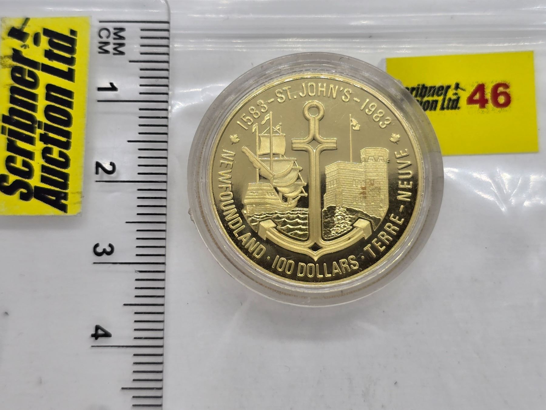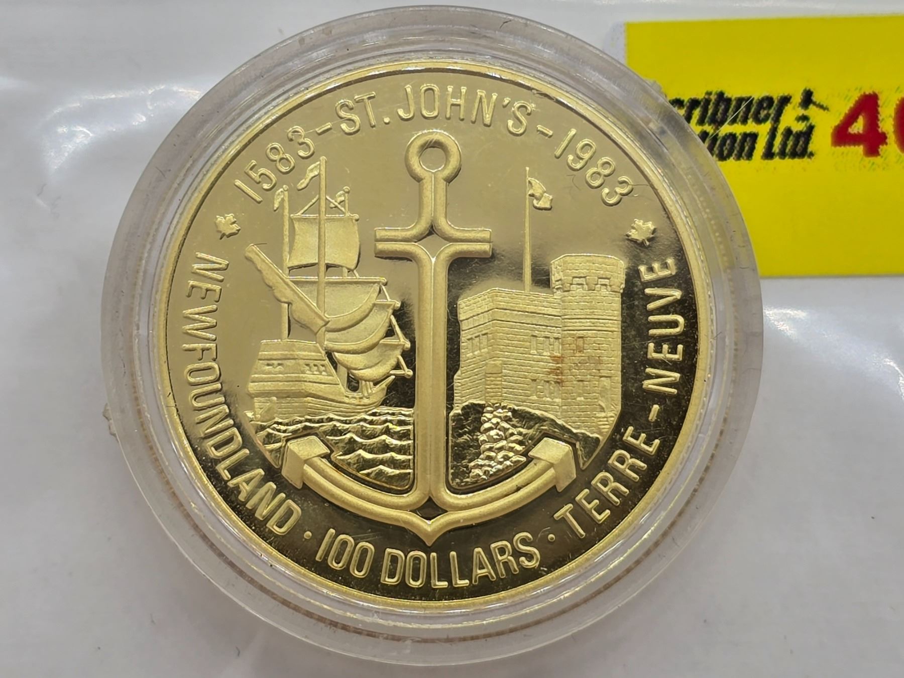 RCM Gold Coin : 1983 Canada $100 Proof Gold 22K : 1583-1983 St. John's Newfoundland 400th Anniversary : 1/2 oz : 91.67% Fine Gold (Weighed & Tested by Auction Co shown in Pictures : Scale Rounds Off) (Note : No Case ~ No COA) (SEE PICS!) (Listing & Descriptions are a GUIDE ONLY and are subject to changes, errors, additions or deletions. Please use the provided pictures to satisfy yourself to the Condition and/or Grades. Please Read & Understand All Terms & Conditions for this Auction Sale.)