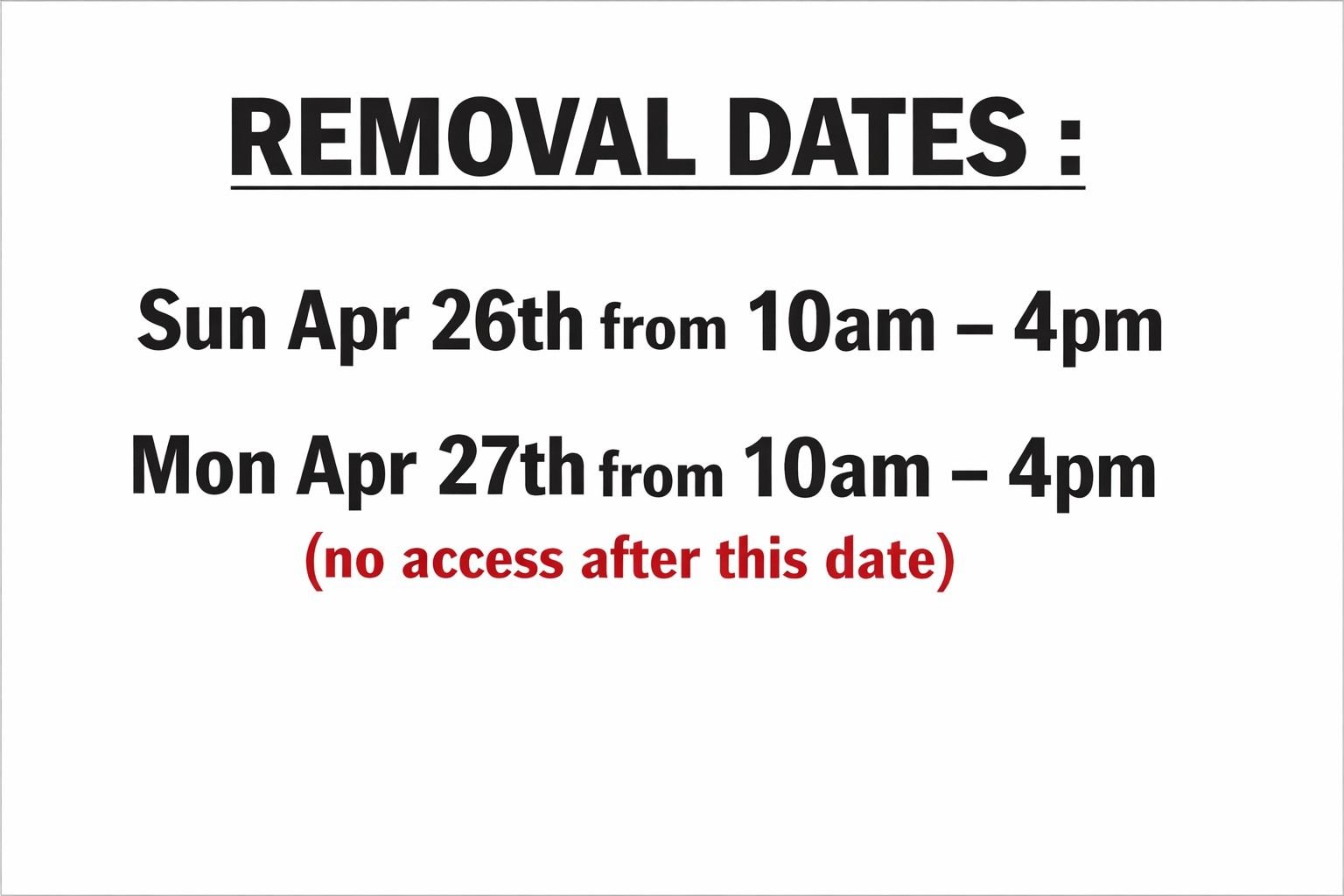 Mon Apr 27th from 10am - 4pm (no access after this date)